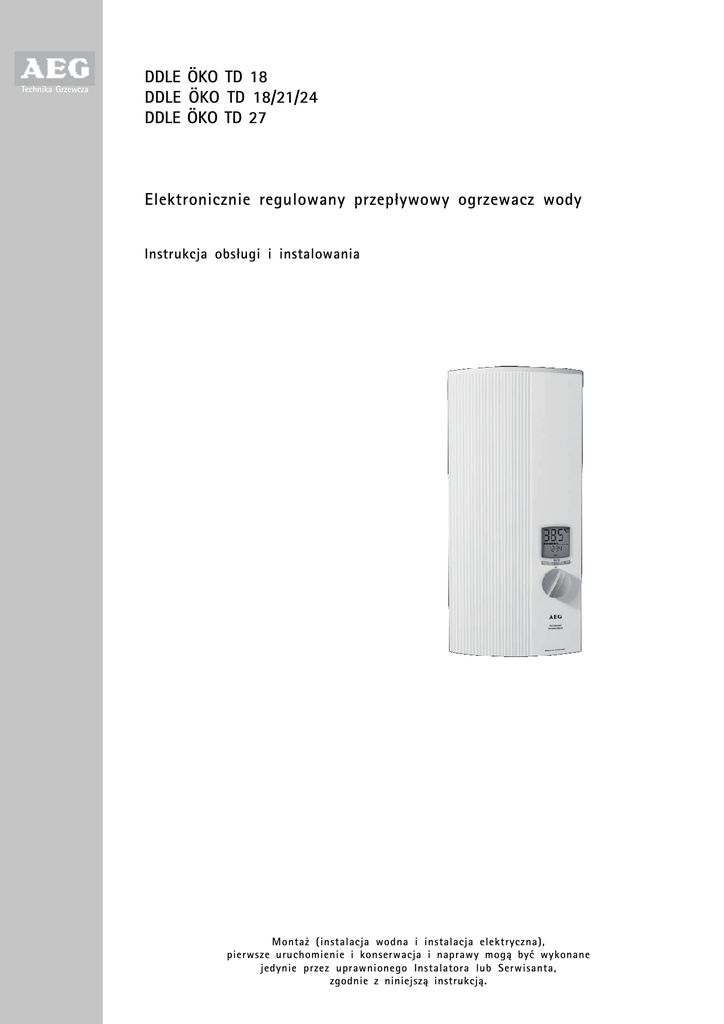 Technika Grzewcza DDLE ÖKO TD 18 DDLE ÖKO TD 18/21/24 DDLE ÖKO TD 27 Elektronicznie regulowany przep³ywowy ogrzewacz wody Instrukcja obs³ugi i instalowania Monta¿ (instalacja wodna i instalacja elektryczna), pierwsze uruchomienie i konserwacja i naprawy mog¹ byæ wykonane jedynie przez uprawnionego Instalatora lub Serwisanta, zgodnie z niniejsz¹ instrukcj¹. 1 Spis treœci 1. 2. 3. 4. 5. 6. 7. 8. 9. 2 Instrukcja obs³ugi 1.1 Opis urz¹dzenia 1.2 Najwa¿niejsze wskazówki w skrócie 1.3 Panel obs³ugi 1.4 Pilot zdalnej regulacji temperatury 1.5 Wskazówki dotycz¹ce bezpieczeñstwa 1.6 Wa¿na wskazówka 1.7 Wydajnoœci cieplej wody u¿ytkowej 1.8 Zalecane nastawy przy zastosowaniu armatur termostatycznych 1.9 Pierwsza pomoc w przypadku usterek 1.10 Konserwacja i czyszczenie urz¹dzenia 1.11 Instrukcja obs³ugi i instalowania Instrukcja monta¿u (dla Instalatora) 2.1 Budowa urz¹dzenia 2.2 Krótki opis 2.3 Wa¿ne wskazówki 2.4 Przepisy i zalecenia Monta¿ standardowy 3.1 Ogólne wskazówki monta¿owe 3.2 Miejsce monta¿u 3.3 Przygotowanie monta¿u urz¹dzenia 3.4 Mocowanie listwy mocuj¹cej 3.5 Monta¿ urz¹dzenia 3.6 Pod³¹czenie wody 3.7 Pod³¹czenie elektryczne 3.8 Zakoñczenie monta¿u 3.9 Pierwsze uruchomienie 3.10 Przekazanie urz¹dzenia U¿ytkownikowi Alternatywy monta¿u 4.1 Pod³¹czenie elektryczne podtynkowe od do³u 4.2 Pod³¹czenie elektryczne natynkowe 4.3 Priorytet c.w.u. 4.4 Pod³¹czenie pod punktem poboru, pod³¹czenie wodne u góry 4.5 Ograniczenie temperatury 4.6 Armatury natynkowe Dane techniczne i zakresy stosowania 5.1 Dane techniczne 5.2 Zakresy stosowania Usuwanie usterek 6.1 Przez U¿ytkownika 6.2 Przez Instalatora / Serwisanta Osprzêt dodatkowy 7.1 Armatury bezpoœredniego poboru 7.2 Osprzêt monta¿owy 7.3 Uniwersalna rama monta¿owa 7.4 Zestaw rurek do monta¿u z przesuniêciem 7.5 Zestaw rurek do wymiany w miejsce gazowego ogrzewacza wody 7.6 PrzekaŸnik priorytetu Gwarancja Ochrona œrodowiska 3 3 3 3 5 6 6 6 7 7 7 7 8 8 9 9 9 10 10 11 11 12 12 13 13 13 13 13 14 14 14 15 15 15 15 16 16 16 17 17 17 18 18 18 18 18 18 18 19 19 Instrukcja obs³ugi AEG Technika Grzewcza dziêkuje za zakup ogrzewacza przep³ywowego. Zakupiliœcie Pañstwo produkt wysokiej jakoœci pochodz¹cy z niemieckiej produkcji. AEG Technika Grzewcza k³adzie ju¿ przy rozwoju i produkcji urz¹dzeñ du¿y nacisk na nowoczesne i ekologiczne technologie produkcji. Dziêki unowoczeœnianiu produkcji ogrzewacze przep³ywowe AEG nale¿¹ do najbardziej ekonomicznych urz¹dzeñ w swojej klasie. 1. Instrukcja obs³ugi 1.1 Opis urz¹dzenia Ogrzewacz przep³ywowy DDLE ÖKO TD ogrzewa wodê podczas jej przep³ywu przez urz¹dzenie. Temperatura wyp³ywaj¹cej z ogrzewacza wody mo¿e byæ regulowana bezstopniowo, przy pomocy pokrêt³a regulacji temperatury, w zakresie od ok. 30OC do ok. 60OC. Przy przep³ywie wynosz¹cym ok. 3 l/min system regulacji ogrzewacza w³¹cza odpowiedni¹ moc systemu grzejnego, w zale¿noœci od nastawy temperatury i temperatury zimnej wody doprowadzonej do urz¹dzenia. 1.2 Najwa¿niejsze wskazówki w skrócie 1.2.1 Pokrêt³o regulacji temperatury z wyœwietlaczem LCD Poprzez obracanie pokrêt³a mo¿liwe jest bezstopniowe nastawianie ¿¹danej temperatury c.w.u., nastawiona temperatura pokazywana jest na wyœwietlaczu. 1.2.2 Temperatury zalecane dla oszczêdnej eksploatacji 40OC - umywalka, prysznic, wanna 55OC - zlewozmywak W przypadku niskich temperatur wody dop³ywaj¹cej do ogrzewacza i wysokiej temperaturze ¿¹danej przep³yw zostaje automatycznie przyd³awiony. W ten sposób zapewnione zostaje utrzymanie nastawionej temperatury na sta³ym poziomie. 1.2.3 Ograniczenie temperatury ¯¹dane ograniczenie temperatury mo¿e byæ dokonane przy pomocy menu nastaw, na panelu steruj¹cym. Ponadto istnieje mo¿liwoœæ nastawienia równie¿ poprzez menu nastaw zabezpieczenia dzieci przed poparzeniem. 1.3 Panel obs³ugi 1.3.1 Regulacja temperatury bezpoœrednio w urz¹dzeniu Regulacja temperatury odbywa siê przy pomocy pokrêt³a regulacji temperatury lub obu przycisków pamiêci 1 i 2. Temperatura zadana mo¿e byæ odczytana na wyœwietlaczu ogrzewacza. 1.3.2 Regulacja temperatury przy pomocy pilota zdalnej regulacji temperatury Pilot zdalnej regulacji temperatury posiada 4 przyciski (+, -, 38OC, 55OC) s³u¿¹ce do regulacji temperatury wody wyp³ywaj¹cej z urz¹dzenia. Je¿eli ogrzewacz znajduje siê w trybie ECO, to po naciœniêciu jednego z przycisków temperatury funkcja ECO zostaje wy³¹czona dla nastêpnego poboru wody. Je¿eli ogrzewacz znajduje siê w trybie normalnym, mo¿liwe jest sta³e ustawienie temperatury, poprzez pilota zdalnej regulacji temperatury. Mo¿liwe jest powi¹zanie z urz¹dzeniem do 4 pilotów zdalnej regulacji temperatury (patrz Menu). 1.3.3 P o d œ w i e t l e n i e wyœwietlacza Zmiana koloru podœwietlenia wyœwietlacza ma miejsce przy przejœciu z 42,5OC (kolor niebieski) na 43,0OC (kolor czerwony). Podœwietlenie wyœwietlacza uruchamiane jest przy uruchomieniu elementów obs³ugowych oraz po osi¹gniêciu przep³ywu w³¹czeniowego (jasne). W trybie gotowoœci ogrzewacza podœwietlenie jest ciemniejsze. Podœwietlenie ciemniejsze jest sta³¹ nastaw¹ fabryczn¹. Podœwietlenie jaœniejsze mo¿e byæ przez U¿ytkownika indywidualnie dopasowywane w menu, od koloru czerwonego do niebieskiego. Po uruchomieniu elementów obs³ugowych podœwietlenie dzia³a przez 30 sek. Podczas poboru wody podœwietlenie w³¹czane jest bez zw³oki. 3 Instrukcja obs³ugi 1.3.4 Funkcja ECO Funkcja ECO w³¹czana i wy³¹czana jest przyciskiem ECO. Na wyœwietlaczu zapala siê zielona dioda i pojawia siê symbol ECO. Funkcja ECO ogranicza wielkoœæ przep³ywu do przep³ywu ekonomicznego i nastawia zadan¹ temperaturê ECO. Obie wartoœci mog¹ zostaæ dopasowane przez U¿ytkownika w menu. Nastaw¹ fabryczn¹ jest 38OC i przep³yw 8 l/min. Ka¿da nastawa temperatury bezpoœrednio na ogrzewaczu (pokrêt³o regulacji temperatury, przyciski pamiêci 1 