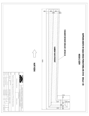 Stadium Tytuł rysunku Temat opracowania Roboty mostowe MUR OPOROWY - WIDOK Z GÓRY Skala Nr rys. 2 Nr egz. BIURO PROJEKTÓW I NADZORU BUDOWNICTWA KOMUNIKACYJNEGO "INTERPROJEKT" - DARIUSZ RUSNAK UL. KACZAWSKA 13, 58-508 DZIWISZÓW Dokumentacja techniczna Mostowa Podpis 1:50 Nr umowy Data opracowania SIERPIEŃ 2007 Naprawa mostu w ciągu drogi powiatowej nr 2741D nad rzeką Łomnica Zadanie Branża Nr 12/96/ZG do projektowania bez ograniczeń w specjalności konstrukcyjno-budowlanej Nr. uprawnień mgr inż. Dariusz Rusnak Nr 7131/55/P/01 do projekt. bez ograniczeń w specjalności konstrukcyjno-budowlanej Imię i nazwisko Projektant mgr inż. Damian Lewandowski Stanowisko Sprawdzający