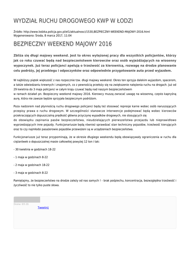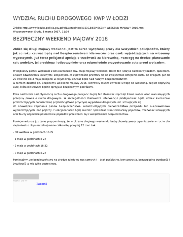 WYDZIAŁ RUCHU DROGOWEGO KWP W ŁODZI Źródło: http://www.lodzka.policja.gov.pl/el1/aktualnosci/1530,BEZPIECZNY-WEEKEND-MAJOWY-2016.html Wygenerowano: Środa, 8 marca 2017, 11:04 BEZPIECZNY WEEKEND MAJOWY 2016 Zbliża się długi majowy weekend. Jest to okres wytężonej pracy dla wszystkich policjantów, którzy jak co roku czuwać będą nad bezpieczeństwem kierowców oraz osób wyjeżdżających na wiosenny wypoczynek. Już teraz policjanci apelują o trzeźwość za kierownicą, rozwagę na drodze planowanie celu podróży, jej przebiegu i odpoczynków oraz odpowiednie przygotowanie auta przed wyjazdem. W najbliższy piątek większość z nas rozpocznie tzw. długi majowy weekend. Okres ten sprzyja dalekim wyjazdom, spacerom, a także odwiedzaniu krewnych i znajomych, co z pewnością przełoży się na zwiększenie natężenia ruchu na drogach. Już od 29 kwietnia do 3 maja policjanci w całym kraju czuwać będą nad naszym bezpieczeństwem w ramach działań pn. Bezpieczny weekend majowy 2016. Kierowcy muszą zwracać uwagę na wiosenną, często kapryśną aurę, która nie zawsze będzie sprzyjała bezpiecznym podróżom. Poza nadzorem nad płynnością ruchu drogowego policjanci będą też stosować represje karne wobec osób naruszających przepisy prawa o ruchu drogowym. W szczególności stanowcze interwencje podejmować będą wobec kierowców przekraczających dopuszczalną prędkość główna przyczynę wypadków drogowych, nie stosujących się do obowiązku zapinania pasów bezpieczeństwa, nieudzielających pierwszeństwa przejazdu lub nieprawidłowo wyprzedzających inne pojazdy. Funkcjonariusze będą również sprawdzać stan techniczny pojazdów, trzeźwość kierujących oraz to czy najmłodsi pasażerowie pojazdów przewożeni są w urządzeniach bezpieczeństwa. Funkcjonariusze już teraz przypominają, że w okresie długiego weekendu będą obowiązywały ograniczenia w ruchu dla ciężarówek o dopuszczalnej masie całkowitej powyżej 12 ton i tak: - 30 kwietnia w godzinach 18-22 - 1 maja w godzinach 8-22 - 2 maja w godzinach 18-22 - 3 maja w godzinach 8-22 Pamiętajmy, że bezpieczeństwo na drodze zależy od nas samych ! - brak pośpiechu, koncentracja, bezwzględna trzeźwość i życzliwość to nie tylko puste słowa. Ocena: 0/5 (0) Tweetnij