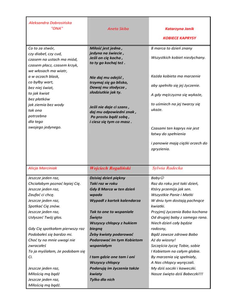Aleksandra Dobrosińska "ONA" Aneta Skiba Katarzyna Janik KOBIECE KAPRYSY Co to za stwór, czy diabeł, czy cud, czasem na ustach ma miód, czasem płacz, czasem krzyk, we włosach ma wiatr, a w oczach blask, co byłby wart, bez niej świat, to jak kwiat bez płatków jak ziemia bez wody tak ona potrzebna dla tego swojego jedynego. Miłość jest jedna , jedyna na świecie , Jeśli on cię kocha , to ty go kochaj też . 8 marca to dzień znany Nie daj mu odejść , trzymaj się go blisko, Dawaj mu słodycze , słodziutkie jak ty. Każda kobieta ma marzenie Jeśli nie daje ci szans , daj mu odpowiedni znak , Po prostu bądź sobą , i ciesz się tym co masz . Wszystkich kobiet niesłychany. aby spełniło się jej życzenie. A gdy mężczyzna się wykaże, to uśmiech na jej twarzy się ukaże. Czasami ten kaprys nie jest łatwy do spełnienia i panowie mają ciężki orzech do zgryzienia. Alicja Marciniak Wojciech Rogaliński Sylwia Radecka Jeszcze jeden raz, Chciałabym poznać lepiej Cię. Jeszcze jeden raz, Zaufać ci chcę. Jeszcze jeden raz, Spotkać Cię znów. Jeszcze jeden raz, Usłyszeć Twój głos. Dzisiaj dzień piękny Taki raz w roku Gdy 8 Marca w ten dzień wpada Wypadł z kartek kalendarza Baby Raz do roku jest taki dzień, Który przemija jak sen. Wszystkie Panie i Matki W dniu tym dostają pachnące kwiatki. Przyjmij życzenia Babo kochana Od drugiej baby z samego rana. Niech dzień cały będzie radosny, Bądź zawsze zdrowa Babo Aż do wiosny! Szczęścia życzę Tobie, sobie I Kobietom na całym globie. By marzenia się spełniały, A Nas chłopcy wyręczali. My dziś soczki i kaweczki. Nasze święto dziś Babeczki!!! Gdy Cię spotkałam pierwszy raz Podobałeś się bardzo mi. Choć ty na mnie uwagi nie zwracałeś To ja myślałam, że podobam się Ci. Jeszcze jeden raz, Miłością mą bądź Jeszcze jeden raz, Miłością mą bądź. Tak to one to wspaniałe Święto Wszyscy chłopcy z hukiem biegną Żeby kwiaty podarować Podarować im tym Kobietom wspaniałym I tam gdzie one tam i oni Wszyscy chłopcy Podarują im życzenia także kwiaty Tylko dla nich Jeszcze jeden raz, Chcę wyjaśnić swój błąd. Jeszcze jeden raz, Usłyszeć twój głos. Chłopcem byłeś mym, A teraz nie mam już nic. Kto popełnił błąd, Ja czy ty? Jak to się stało, Że nie ma już nic. Proszę Cię Zaufajmy sobie jeszcze raz. Milena Gałaj Dzień każdej kobiety Jest raz w roku dzień wspaniały, Kiedy kwiatom nie ma miary. Czekoladki i malunki, Upominki, rzadziej trunki. Każda baba coś dostanie I ucieszy się ogromnie. Więc pamiętaj Ty, mój panie, Żeby chociaż skromnie Ukochaną obdarować I uczucia już nie chować. Wyznać miłość, ucałować. To porada bardzo cenna. Często nie bywa daremna. Kwiaty dostanie kobieta, Uśmiech będzie dla faceta.