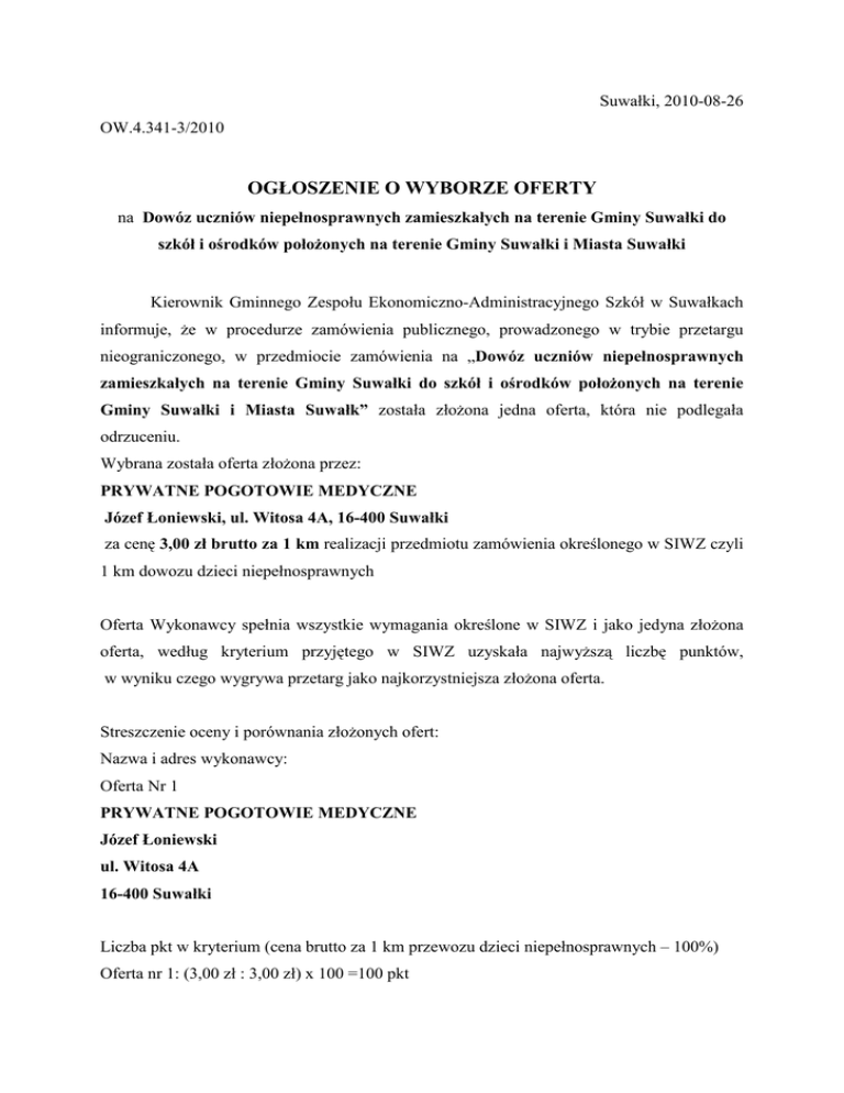 Suwałki, 2010-08-26 OW.4.341-3/2010 OGŁOSZENIE O WYBORZE OFERTY na Dowóz uczniów niepełnosprawnych zamieszkałych na terenie Gminy Suwałki do szkół i ośrodków położonych na terenie Gminy Suwałki i Miasta Suwałki Kierownik Gminnego Zespołu Ekonomiczno-Administracyjnego Szkół w Suwałkach informuje, że w procedurze zamówienia publicznego, prowadzonego w trybie przetargu nieograniczonego, w przedmiocie zamówienia na „Dowóz uczniów niepełnosprawnych zamieszkałych na terenie Gminy Suwałki do szkół i ośrodków położonych na terenie Gminy Suwałki i Miasta Suwałk” została złożona jedna oferta, która nie podlegała odrzuceniu. Wybrana została oferta złożona przez: PRYWATNE POGOTOWIE MEDYCZNE Józef Łoniewski, ul. Witosa 4A, 16-400 Suwałki za cenę 3,00 zł brutto za 1 km realizacji przedmiotu zamówienia określonego w SIWZ czyli 1 km dowozu dzieci niepełnosprawnych Oferta Wykonawcy spełnia wszystkie wymagania określone w SIWZ i jako jedyna złożona oferta, według kryterium przyjętego w SIWZ uzyskała najwyższą liczbę punktów, w wyniku czego wygrywa przetarg jako najkorzystniejsza złożona oferta. Streszczenie oceny i porównania złożonych ofert: Nazwa i adres wykonawcy: Oferta Nr 1 PRYWATNE POGOTOWIE MEDYCZNE Józef Łoniewski ul. Witosa 4A 16-400 Suwałki Liczba pkt w kryterium (cena brutto za 1 km przewozu dzieci niepełnosprawnych – 100%) Oferta nr 1: (3,00 zł : 3,00 zł) x 100 =100 pkt Razem 100 pkt Umowy z Wykonawcami zostaną zawarte zgodnie z art. 94 ust 2 przed upływem terminów określonych w art. 94, ust Sporządziła: Ewelina Wiśniewska 1, pkt 2 ustawy Prawo zamówień publicznych.