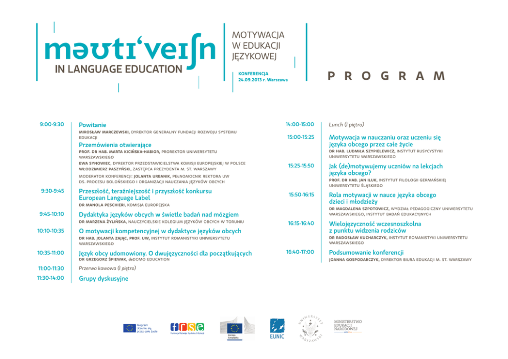 Motywacja w edukacji językowej p r o g r a m KONFERENCJA 24.09.2013 r. Warszawa 9:00-9:30 Powitanie mirosław marczewski, dyrektor generalny fundacji rozwoju systemu edukacji Przemówienia otwierające 9:30-9:45 14:00-15:00 15:00-15:25 15:25-15:50 Przeszłość, teraźniejszość i przyszłość konkursu European Language Label 15:50-16:15 10:10-10:35 O motywacji kompetencyjnej w dydaktyce języków obcych Język obcy udomowiony. O dwujęzyczności dla początkujących 11:00-11:30 Przerwa kawowa (I piętro) 11:30-14:00 Grupy dyskusyjne dr grzegorz śpiewak, dedomo education Rola motywacji w nauce języka obcego dzieci i młodzieży dr magdalena szpotowicz, wydział pedagogiczny uniwersytetu warszawskiego, instytut badań edukacyjnych 16:15-16:40 Wielojęzyczność wczesnoszkolna z punktu widzenia rodziców dr radosław kucharczyk, instytut romanistyki uniwersytetu warszawskiego dr hab. jolanta zając, prof. uw, instytut romanistyki uniwersytetu warszawskiego 10:35-11:00 Jak (de)motywujemy uczniów na lekcjach języka obcego? prof. dr hab. jan iluk, instytut filologii germańskiej uniwersytetu śląskiego Dydaktyka języków obcych w świetle badań nad mózgiem dr marzena żylińska, nauczycielskie kolegium języków obcych w toruniu Motywacja w nauczaniu oraz uczeniu się języka obcego przez całe życie dr hab. ludmiła szypielewicz, instytut rusycystyki uniwersytetu warszawskiego prof. dr hab. marta kicińska-habior, prorektor uniwersytetu warszawskiego ewa synowiec, dyrektor przedstawicielstwa komisji europejskiej w polsce włodzimierz paszyński, zastępca prezydenta m. st. warszawy moderator konferencji: jolanta urbanik, pełnomocnik rektora uw ds. procesu bolońskiego i organizacji nauczania języków obcych dr manola peschieri, komisja europejska 9:45-10:10 Lunch (I piętro) 16:40-17:00 Podsumowanie konferencji joanna gospodarczyk, dyrektor biura edukacji m. st. warszawy Grupy dyskusyjne: Europejskie Portfolio Językowe – warsztat Europejskiego Centrum Języków Nowożytnych (ECML) Rady Europy sala: 111-113 Nowe grupy odbiorców w nauce języków obcych Motywowanie do nauki języków rzadziej używanych sala: 207 sala: 308 Motywacja w metodyce, metoda w motywacji Moderator: Moderator: sala: aula Wpływ działań instytucjonalnych na motywowanie uczniów i nauczycieli w edukacji językowej Moderator: sala: 114-116 Anna Grabowska, Fundacja Rozwoju Systemu Edukacji Moderator: Danuta Szczęsna, Biuro Uznawalności Wykształcenia i Wymiany Międzynarodowej Justyna Maziarska-Lesisz, Ośrodek Rozwoju Edukacji dr michael langner, dr jürgen friedrich, Europejskie Centrum Języków Nowożytnych (ECML) Rady Europy; Działania ECML na rzecz tworzenia sieci i promocji Europejskiego Portfolio Językowego jako narzędzia wspierającego refleksyjne nauczanie języków dr małgorzata pamuła-behrens, Uniwersytet Pedagogiczny w Krakowie; Refleksyjny nauczyciel, myślący uczniowie – Europejskie Portfolio Językowe w praktyce dr michael langner, Europejskie Centrum Języków Nowożytnych (ECML) Rady Europy; Przykłady wykorzystania EPJ w Szwajcarii i Czechach dr jürgen friedrich, Europejskie Centrum Języków Nowożytnych (ECML) Rady Europy; ePlatforma EPJ na rzecz nauczania kompetencji komunikacyjnej i interkulturowej lechosław szafranek, Fundacja Rozwoju Systemu Edukacji; Portfolio Europass jako narzędzie wspierające w nauczaniu języków obcych dr anna jaroszewska, Instytut Germanistyki Uniwersytetu Warszawskiego; Edukacja obcojęzyczna polskich seniorów z perspektywy teorii motywacji dr maciej smuk, Instytut Romanistyki Uniwersytetu Warszawskiego; Czynniki psychologiczne w nauce języków obcych bartosz wilimborek, Instytut Głuchoniemych; „Sign me English”. Prezentacja projektu nagrodzonego European Language Label 2013 dr elżbieta gajek, Instytut Lingwistyki Stosowanej Uniwersytetu Warszawskiego; Interkulturowe QQanie polsko-chińskie. Prezentacja projektu nagrodzonego European Language Label 2013 monika nowakowska-twaróg, mikołaj nowakowski, „Globalnet”; Share – e-learning w nauczaniu języków obcych dla grup zawodowych na przykładzie projektu Leonardo da Vinci prof. dr hab. władysław miodunka, Uniwersytet Jagielloński; Wpływ certyfikacji języka polskiego na jakość nauczania dr grażyna czetwertyńska, Instytut Badań Interdyscyplinarnych „Artes Liberales” Uniwersytetu Warszawskiego; „Włącz Polskę” – modułowy system materiałów edukacyjnych dla dzieci polskich uczących się za granicą anna ní ghallachoir, Narodowy Uniwersytet Irlandii w Maynooth; Certyfikacja języka irlandzkiego daniela kohn, Uniwersytet Medycyny i Farmacji Victora Babeșa w Timişoarze; Nowa norma. Jak funkcja określa formę i zawartość współczesnych rumuńskich podręczników marta kędzia, dr anna sołtys, Społeczna Akademia Nauk w Łodzi; Wielojęzyczne rodziny: wspieranie rodzin wielojęzycznych – lingwistycznego skarbu Europy Jacek Członkowski, Stowarzyszenie PASE dr melanie ellis, Instytut Badań Edukacyjnych; Motywacja w kształceniu kompetencji mówienia renata klimek-kowalska, Polskie Stowarzyszenie – Europa Języków i Kultur; Zaciekawić, zadziwić, zmotywować – metoda stacji dydaktycznych na lekcjach języka obcego pierangela diadori, Università per Stranieri di Siena; Motywacja nauczycieli i uczniów na lekcji: pytania sprawdzające a pytania motywujące do poszukiwania odpowiedzi roman deeken, Kaiserin-Augusta-Schule w Kolonii na zaproszenie Goethe-Institut w Warszawie; Indywidualizacja i motywacja poprzez elektroniczne środki przekazu luiza wójtowicz-waga, Stowarzyszenie PASE; O kontraktowaniu się z uczniem dorosłym – czy takie motywowanie ma sens? Moderator: Anna Atłas, Fundacja Rozwoju Systemu Edukacji jolanta urbanik, Uniwersytet Warszawski; Projekt MOLAN – sieć wymiany informacji o dobrych praktykach wspierających motywację do nauki języków anna atłas, Fundacja Rozwoju Systemu Edukacji, Nauka języków obcych w ramach progra