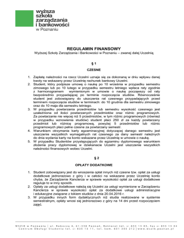 REGULAMIN FINANSOWY Wyższej Szkoły Zarządzania i Bankowości w Poznaniu – zwanej dalej Uczelnią §1 CZESNE 1. Zapłatę należności na rzecz Uczelni uznaje się za dokonaną w dniu wpływu danej kwoty na wskazany przez Uczelnię rachunek bankowy Uczelni. 2. Student, który podpisze umowę o naukę po 10 września w przypadku semestru zimowego lub po 10 lutego w przypadku semestru letniego wpłaca raty zgodnie z harmonogramem wymienionym w umowie o naukę począwszy od raty bezpośrednio przypadającej po terminie rozpoczęcia studiów. Równocześnie student jest zobowiązany do uiszczenia rat czesnego przypadających przed terminem rozpoczęcia studiów w terminach: do 10 grudnia dla semestru zimowego oraz do 10 maja dla semestru letniego. 3. W przypadku powtarzania przedmiotów lub semestru wysokość czesnego jest uzależniona od ilości powtarzanych przedmiotów oraz różnic programowych. Za powtarzanie nie więcej niż 5 przedmiotów, w tym różnic programowych (również w przypadku wznowienia studiów) student płaci 250 zł za każdy powtarzany przedmiot lub różnicę programową, powyżej 5 przedmiotów lub różnic programowych płaci pełne czesne za powtarzany semestr. 4. Warunkiem otrzymania karty egzaminacyjnej dotyczącej danego semestru jest uiszczenie wszystkich wymagalnych rat czesnego za dany semestr należnych do dnia wydania karty na konto wskazane przez Uczelnię w umowie o naukę. 5. W przypadku Studentów przystępujących do egzaminu dyplomowego warunkiem złożenia pracy dyplomowej w dziekanacie Uczelni jest uiszczenie wszystkich należności finansowych wobec Uczelni. §2 OPŁATY DODATKOWE 1. Student zobowiązany jest do wnoszenia opłat innych niż czesne tzw. opłat za usługi dodatkowe jednorazowo z góry i w całości na wskazane przez Uczelnię konto chyba, że Zarządzenie Kanclerza w sprawie wysokości opłat za usługi dodatkowe reguluje to w inny sposób. 2. Opłaty za usługi dodatkowe należą się Uczelni za usługi wymienione w Zarządzeniu Kanclerza w sprawie wysokości opłat za dodatkowe usługi administracyjne i edukacyjne związane z tokiem studiów z dnia 20.04.2016 r. 3. W przypadku innych form dydaktycznych niż studia realizowane w systemie semestralnym, opłaty wnosi się jednorazowo z góry na 14 dni przed rozpoczęciem zajęć. §3 ROZLICZENIA WZAJEMNE I WARUNKI REALIZACJI USŁUG ZE STRONY UCZELNI 1. Uczelnia ma prawo nie wydać karty egzaminacyjnej Studentowi w przypadku zalegania z płatnością rat czesnego lub innych opłat należnych w danym semestrze, które winny być zaksięgowane na uczelnianym koncie Studenta, a także wszelkich zaległości. 2. Student ma prawo do ciągłej kontroli w Dziekanacie Uczelni ewidencji wpłat widniejących na jego uczelnianym koncie rozliczeniowym i uruchomienia procedury wyjaśniającej w przypadku jakichkolwiek niezgodności, zgodnie z § 7 niniejszego Regulaminu. 3. Dziekanat Uczelni prowadzi Kartę Zobowiązań Studenta, w ramach której Uczelnia ewidencjonuje usługi świadczone na rzecz Studenta, a tym samym jego zobowiązania finansowe wobec Uczelni. Karta Zobowiązań Studenta stanowi podstawę do określenia należności Studenta wobec Uczelni. 4. Uczelnia ma prawo nie dopuścić Studenta do egzaminu dyplomowego, jeśli Student zalega z jakimikolwiek opłatami na rzecz Uczelni. §4 SANKCJE Z TYTUŁU NIETERMINOWEGO WNOSZENIA OPŁAT 1. Student jest zobowiązany do płacenia należności wobec Uczelni terminowo i bez zwłoki. 2. W przypadku gdy Student nie opłaca należności w terminie Uczelnia ma prawo naliczyć odsetki ustawowe i zastosować sankcje określone poniżej. 3. W przypadku gdy Student zalega z zapłatą co najmniej trzech rat czesnego, w tym również z odsetkami za nieterminowe uiszczanie opłat, Uczelnia wzywa do zapłaty, wyznaczając dodatkowy siedmiodniowy termin do uregulowania zobowiązań (monit jest płatny, opłata za monit wynosi 20 zł). Nieuregulowanie zaległości w tym dodatkowym terminie może spowodować skreślenie z listy studentów. §5 FORMY KONTAKTU WZAJEMNEGO NA TLE ROZLICZEŃ 1. Wszelkie rozliczenia wzajemne pomiędzy Uczelnią a Studentem odbywają się w formie bezgotówkowej na konto bankowe. 2. Podstawową formą wyjaśnienia kwestii spornych pomiędzy Uczelnią a Studentem w sprawach finansowych jest forma pisemna za pośrednictwem Dziekanatu. §6 WYSOKOŚĆ OPŁAT 1. Studenta przez cały okres studiów obowiązuje czesne ustalone w umowie o naukę wynikające z Zarządzenia Kanclerza w sprawie wysokości czesnego. 2. Pozostałe opłaty reguluje Zarządzenie Kanclerza w sprawie wysokości opłat za dodatkowe usługi administracyjne i edukacyjne związane z tokiem studiów z dnia 20.04.2016 r. i niniejszy Regulamin Finansowy. §7 PŁATNOŚCI DO WYJAŚNIENIA 1. W przypadku rozbieżności pomiędzy stanem na koncie rozliczeniowym Studenta a jego wpłatami, Student składa pisemny wniosek o wyjaśnienie przedstawiając oryginały dowodów wpłat, których ma dotyczyć wyjaśnienie. 2. Uczelnia ma prawo sporządzenia kopii dowodów wpłat, także z potwierdzeniem za zgodność z oryginałem. 3. Wniosek do Kanclerza o wyjaśnienie ww. rozbieżności Student składa do Dziekanatu lub Biura Podawczego. 4. Czas na rozpatrzenie wniosku określa się na 30 dni, przy czym termin ten może zostać przedłużony z przyczyn niezależnych od Uczelni (np. z przyczyn długotrwałego wyjaśniania sprawy przez instytucje, które uczestniczyły przy ewentualnym przekazywaniu środków finansowych przez Studenta na konto Uczelni). 5. W przypadku stwierdzenia nadpłaty ze strony Studenta, jej zwrot następuje na rachunek wskazany przez Studenta na złożonym przez niego pisemnie wniosku. 6. Zwracane będą ewentualne nadpłaty przewyższające kwotę 10,00 zł wynikające z końcowego rozliczenia uczelnianego konta finansowego Studenta. §8 POSTANOWIENIA KOŃCOWE 1. 2. 3. 4. 5. Niniejszy Regulamin Finansowy obowiązuje studentów, którzy podpisali umowę o na