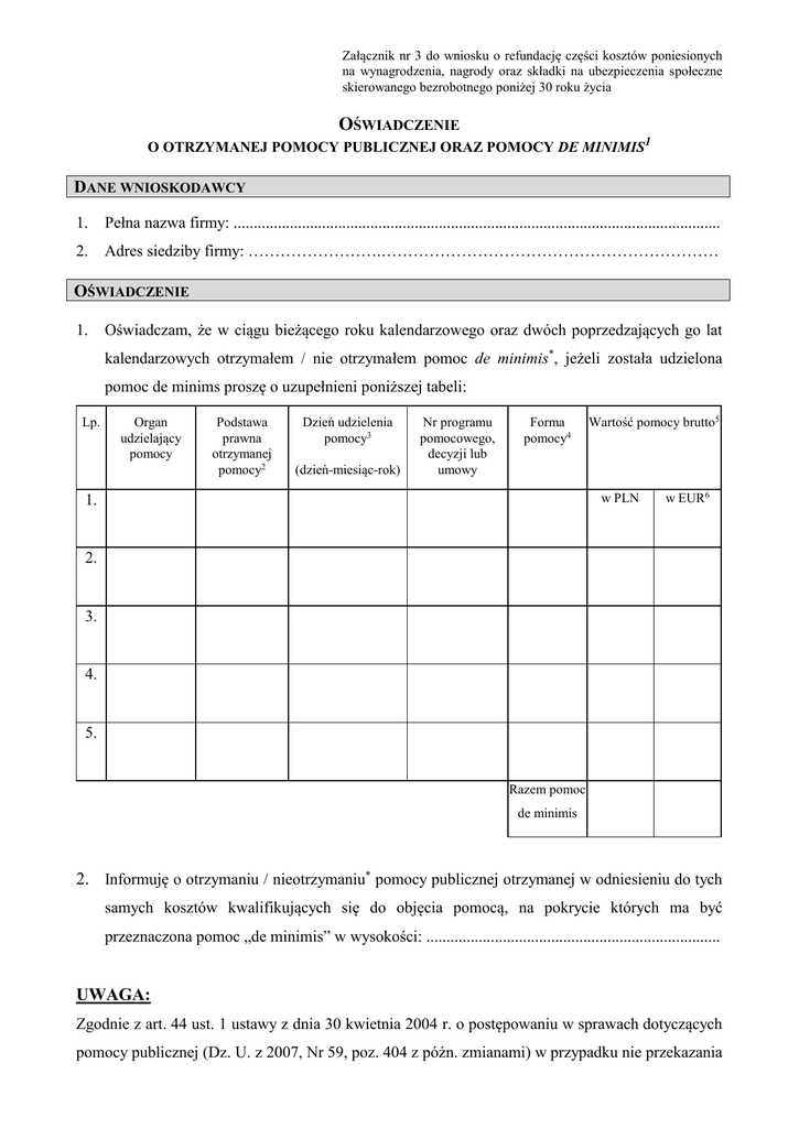 Załącznik nr 3 do wniosku o refundację części kosztów poniesionych na wynagrodzenia, nagrody oraz składki na ubezpieczenia społeczne skierowanego bezrobotnego poniżej 30 roku życia OŚWIADCZENIE O OTRZYMANEJ POMOCY PUBLICZNEJ ORAZ POMOCY DE MINIMIS1 DANE WNIOSKODAWCY 1. Pełna nazwa firmy: ......................................................................................................................... 2. Adres siedziby firmy: …………………….……………………………………………………… OŚWIADCZENIE 1. Oświadczam, że w ciągu bieżącego roku kalendarzowego oraz dwóch poprzedzających go lat kalendarzowych otrzymałem / nie otrzymałem pomoc de minimis*, jeżeli została udzielona pomoc de minims proszę o uzupełnieni poniższej tabeli: Lp. Organ udzielający pomocy Podstawa prawna otrzymanej pomocy2 Dzień udzielenia pomocy3 (dzień-miesiąc-rok) Nr programu pomocowego, decyzji lub umowy Forma pomocy4 Wartość pomocy brutto5 w PLN 1. w EUR6 2. 3. 4. 5. Razem pomoc de minimis 2. Informuję o otrzymaniu / nieotrzymaniu* pomocy publicznej otrzymanej w odniesieniu do tych samych kosztów kwalifikujących się do objęcia pomocą, na pokrycie których ma być przeznaczona pomoc „de minimis” w wysokości: ......................................................................... UWAGA: Zgodnie z art. 44 ust. 1 ustawy z dnia 30 kwietnia 2004 r. o postępowaniu w sprawach dotyczących pomocy publicznej (Dz. U. z 2007, Nr 59, poz. 404 z późn. zmianami) w przypadku nie przekazania lub przekazania nieprawdziwych informacji o pomocy publicznej, o których mowa w art. 39 oraz art. 40 ust. 1 i ust. 3 pkt 2, Prezes Urzędu Ochrony Konkurencji i Konsumentów może w drodze decyzji nałożyć na beneficjenta pomocy karę pieniężną do wysokości równowartości 10 000 euro. 1. W przypadku wskazania odpowiedzi potwierdzającej otrzymanie danej pomocy de minimis, wnioskodawca zobowiązany jest dołączyć do wniosku wszystkie zaświadczenia o pomocy de minimis, jakie otrzymał w okresie wykazanym w oświadczeniu. 2. W przypadku wskazania odpowiedzi potwierdzającej otrzymanie pomocy publicznej w odniesieniu do tych samych kosztów kwalifikujących się do objęcia pomocą, na pokrycie których ma być przeznaczona pomoc de minimis, wnioskodawca zobowiązany jest dołączyć do wniosku czytelnie wypełniony FORMULARZ INFORMACJI PRZEDSTAWIANYCH PRZY UBIEGANIU SIĘ O POMOC DE MINIMIS. Ww. formularz stanowi załącznik do rozporządzenia Rady Ministrów z dnia 29 marca 2010 r. w sprawie zakresu informacji przedstawianych przez podmiot ubiegający się o pomoc de minimis. Jeżeli natomiast odznaczono odpowiedź informującą o nieotrzymaniu pomocy, wnioskodawca zobowiązany jest przedstawić powyższy formularz wypełniony tylko w części A i C. .............................................................................. (podpis i pieczątka imienna pracodawcy lub osoby upoważnionej) Odpowiednie zaznaczyć 1 Pomoc de minimis w rozumieniu art. 2 Rozporządzenia Komisji (WE) nr 1998/2006 z dnia 15 grudnia 2006 r. w sprawie stosowania art. 87 i 88 Traktatu do pomocy de minimis (Dz. Urz. WE L 379/5 z 28.12.2006 r.) oznacza pomoc przyznaną temu samemu podmiotowi gospodarczemu w ciągu bieżącego roku kalendarzowego oraz dwóch poprzedzających go lat kalendarzowych, która łącznie z pomocą udzieloną na podstawie wniosku nie przekroczy równowartości 200 000 EURO. Wartość pomocy jest wartością brutto, tzn. nie uwzględnia potrąceń z tytułu podatków bezpośrednich. Pułap ten stosuje się bez względu na formę pomocy i jej cel. 2 Należy podać pełną podstawę prawną udzielenia pomocy (nazwa aktu prawnego). 3 Dzień nabycia przez wnioskodawcę prawa do skorzystania z pomocy, a w przypadku gdy udzielenie pomocy w formie ulgi podatkowej następuje na podstawie aktu normatywnego - terminy określone w art. 2 pkt 11 lit. a-c. 4 Pomocą jest każde wsparcie udzielone ze środków publicznych w szczególności: dotacje, pożyczki, kredyty, gwarancje, poręczenia, ulgi i zwolnienia podatkowe, zaniechanie poboru podatku, odroczenie płatności lub rozłożenie na raty płatności podatku, umorzenie zaległości podatkowej oraz inne formy wsparcia, które w jakikolwiek sposób uprzywilejowują ich beneficjenta w stosunku do konkurentów. 5 Należy podać wartość pomocy jako ekwiwalent dotacji, obliczony zgodnie z rozporządzeniem Rady Ministrów z dnia 11 sierpnia 2004 r. w sprawie szczegółowego sposobu obliczania wartości pomocy publicznej udzielanej w różnych formach (Dz. U. Nr 194, poz. 1983 i z 2006r. Nr 183, poz. 1355), wydanym na podstawie art. 11 ust. 2 ustawy z dnia 30 kwietnia 2004 r. o postępowaniu w sprawach dotyczących pomocy publicznej. 6 Należy podać wartość pomocy w euro ustaloną zgodnie z art. 11 ust. 3 ustawy z dnia 30 kwietnia 2004 r. o postępowaniu w sprawach dotyczących pomocy publicznej (Dz. U. z 2004 r. Nr 123, poz. 1291) - równowartość pomocy w euro ustala się wg kursu średniego walut obcych, ogłaszanego przez Narodowy Bank Polski, obowiązującego w dniu udzielenia pomocy.