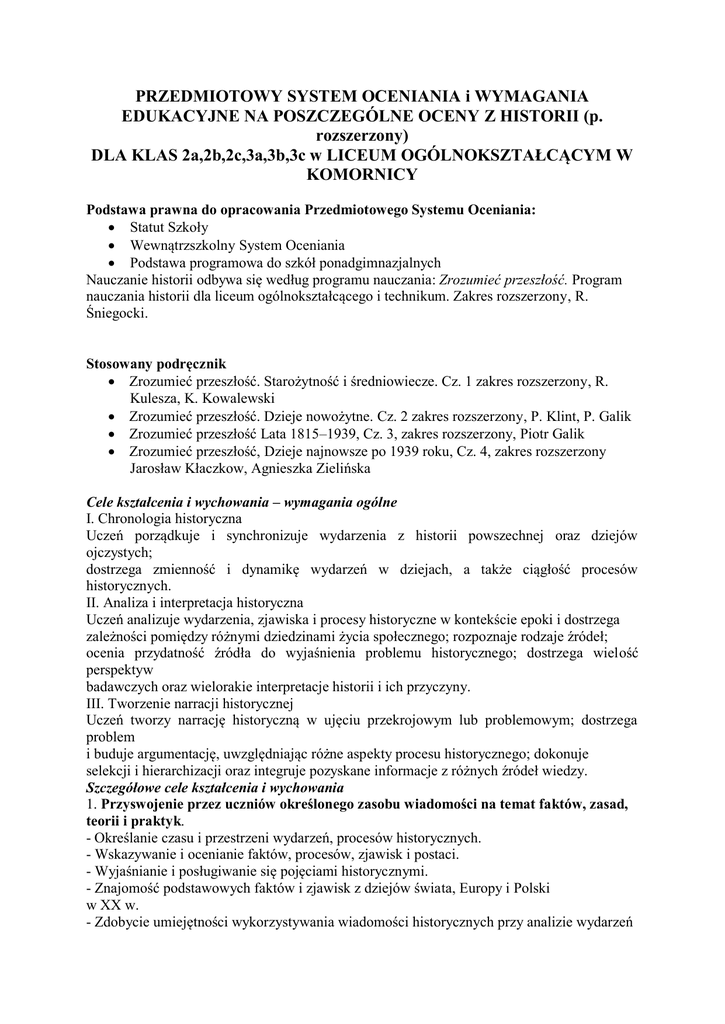 PRZEDMIOTOWY SYSTEM OCENIANIA i WYMAGANIA EDUKACYJNE NA POSZCZEGÓLNE OCENY Z HISTORII (p. rozszerzony) DLA KLAS 2a,2b,2c,3a,3b,3c w LICEUM OGÓLNOKSZTAŁCĄCYM W KOMORNICY Podstawa prawna do opracowania Przedmiotowego Systemu Oceniania: Statut Szkoły Wewnątrzszkolny System Oceniania Podstawa programowa do szkół ponadgimnazjalnych Nauczanie historii odbywa się według programu nauczania: Zrozumieć przeszłość. Program nauczania historii dla liceum ogólnokształcącego i technikum. Zakres rozszerzony, R. Śniegocki. Stosowany podręcznik Zrozumieć przeszłość. Starożytność i średniowiecze. Cz. 1 zakres rozszerzony, R. Kulesza, K. Kowalewski Zrozumieć przeszłość. Dzieje nowożytne. Cz. 2 zakres rozszerzony, P. Klint, P. Galik Zrozumieć przeszłość Lata 1815–1939, Cz. 3, zakres rozszerzony, Piotr Galik Zrozumieć przeszłość, Dzieje najnowsze po 1939 roku, Cz. 4, zakres rozszerzony Jarosław Kłaczkow, Agnieszka Zielińska Cele kształcenia i wychowania – wymagania ogólne I. Chronologia historyczna Uczeń porządkuje i synchronizuje wydarzenia z historii powszechnej oraz dziejów ojczystych; dostrzega zmienność i dynamikę wydarzeń w dziejach, a także ciągłość procesów historycznych. II. Analiza i interpretacja historyczna Uczeń analizuje wydarzenia, zjawiska i procesy historyczne w kontekście epoki i dostrzega zależności pomiędzy różnymi dziedzinami życia społecznego; rozpoznaje rodzaje źródeł; ocenia przydatność źródła do wyjaśnienia problemu historycznego; dostrzega wielość perspektyw badawczych oraz wielorakie interpretacje historii i ich przyczyny. III. Tworzenie narracji historycznej Uczeń tworzy narrację historyczną w ujęciu przekrojowym lub problemowym; dostrzega problem i buduje argumentację, uwzględniając różne aspekty procesu historycznego; dokonuje selekcji i hierarchizacji oraz integruje pozyskane informacje z różnych źródeł wiedzy. Szczegółowe cele kształcenia i wychowania 1. Przyswojenie przez uczniów określonego zasobu wiadomości na temat faktów, zasad, teorii i praktyk. - Określanie czasu i przestrzeni wydarzeń, procesów historycznych. - Wskazywanie i ocenianie faktów, procesów, zjawisk i postaci. - Wyjaśnianie i posługiwanie się pojęciami historycznymi. - Znajomość podstawowych faktów i zjawisk z dziejów świata, Europy i Polski w XX w. - Zdobycie umiejętności wykorzystywania wiadomości historycznych przy analizie wydarzeń współczesnych. 2. Zdobycie przez uczniów umiejętności wykorzystania posiadanych wiadomości podczas wykonywania zadań i rozwiązywania problemów. - Dostrzeganie zmienności i dynamiki wydarzeń w dziejach, a także ciągłości procesów historycznych. - Rozpoznawanie rodzajów źródeł. - Ocenianie przydatności źródła do wyjaśnienia problemu historycznego. - Czerpanie informacji z różnych źródeł, selekcja informacji. - Odróżnianie opinii od faktów. - Posługiwanie się mapą do wyjaśniania zjawisk i procesów historycznych i społecznych. 3. Kształtowanie u uczniów postaw warunkujących sprawne i odpowiedzialne funkcjonowanie we współczesnym świecie. - Pogłębianie postaw obywatelskich i patriotycznych. - Utrwalanie postaw poszanowania tradycji i kultury własnego narodu. - Kształtowanie postaw poszanowania dla innych kultur i tradycji. - Utrwalanie szacunku dla dokonań poprzednich pokoleń. - Podejmowanie inicjatyw oraz doskonalenie pracy zespołowej. Kształcenie w zakresie rozszerzonym ma za zadanie poszerzyć wiedzę uczniów oraz rozwinąć u nich umiejętności nabyte na wcześniejszych etapach edukacji. Powinno również wspomóc ogólny rozwój intelektualny ucznia, tak by był on przygotowany do dalszej nauki na poziomie studiów wyższych. 1. Ugruntowanie i udoskonalenie wiedzy, umiejętności i postaw kształconych podczas wcześniejszych etapów edukacji, w tym restrukturyzacja wiedzy historycznej: a) poszerzenie wiedzy o podstawach odrębności różnych cywilizacji; b) pogłębienie wiedzy o strukturach społecznych, ideologiach społeczno-politycznych, systemach filozoficzno-religijnych, prądach kulturowych; c) pogłębienie rozumienia dynamiki oraz złożoności przemian kulturowych; d) rozwijanie zdolności krytycznego czytania i oceniania różnorodnych przekazów poprzez pogłębioną pracę ze źródłami historycznymi; e) rozwijanie takich umiejętności, jak ocena przydatności źródła do badania wybranego problemu, ocena wiarygodności źródła, syntetyzowanie informacji zaczerpniętych z różnych źródeł. 2. Kształtowanie umiejętności wykorzystania ugruntowanej wiedzy do opisu i oceny problemów historycznych z uwzględnieniem zasad naukowego badania przeszłości. 3. Pogłębienie umiejętności prezentowania wyników własnej pracy w zróżnicowanych formach, a także kształtowanie zdolności formułowania opinii i wniosków historycznych w formie obszernych wypowiedzi ustnych i pisemnych oraz obrony własnych sądów w dyskusji. 4. Kształtowanie zdolności rozumienia, że jednostki i rozmaite grupy społeczne w różny sposób opisują i interpretują historię (tak w przeszłości, jak i obecnie), oraz kształtowanie umiejętności krytycznej analizy różnych interpretacji historii. 5. Wskazywanie związków pomiędzy przeszłością i teraźniejszością oraz zachęcanie do rozważania różnorodnych następstw przeszłych i obecnych zjawisk historycznych. 6. Umożliwianie wykorzystania wiedzy i umiejętności historycznych zgodnie z zainteresowaniami i zdolnościami ucznia. 7. Wyposażenie ucznia w wiedzę i umiejętność dokonywania ocen, które umożliwią mu świadome i racjonalne kształtowanie tożsamości oraz wybór systemu wartości, poprzez: a) zapoznanie z różnymi rodzajami wspólnot ludzkich; b) zapoznanie z różnymi systemami wartości ukształtowanymi w różnych cywilizacjach i kulturach; c) zapoznanie z korzeniami i wartościami europejskiego kręgu kultury chrześcij