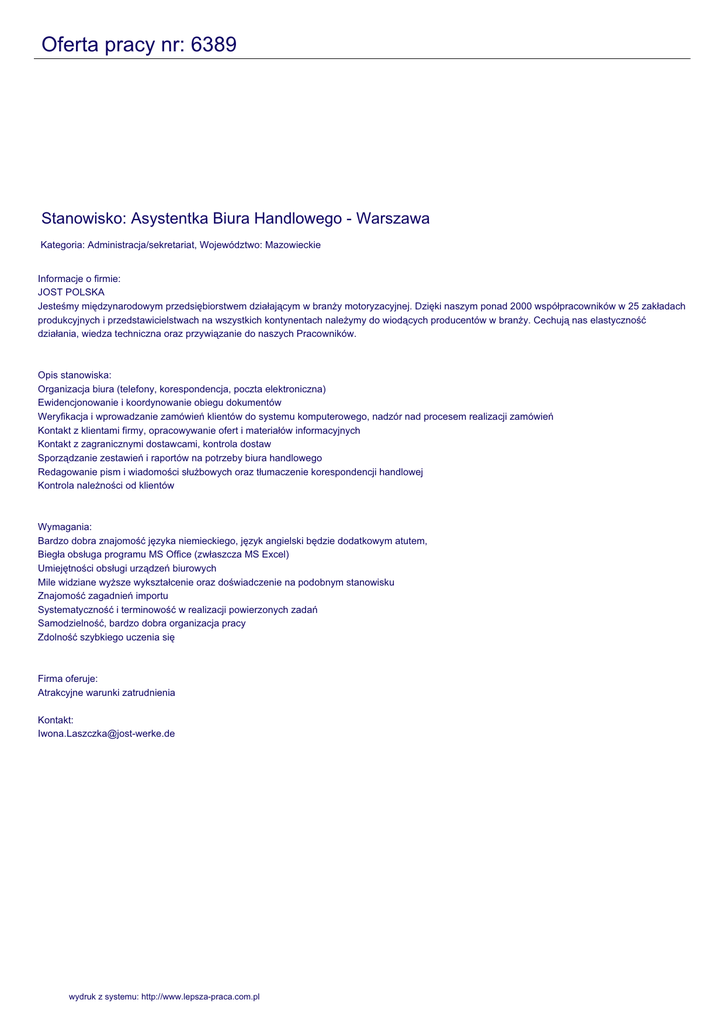 Oferta pracy nr: 6389 Stanowisko: Asystentka Biura Handlowego - Warszawa Kategoria: Administracja/sekretariat, Województwo: Mazowieckie Informacje o firmie: JOST POLSKA Jesteśmy międzynarodowym przedsiębiorstwem działającym w branży motoryzacyjnej. Dzięki naszym ponad 2000 współpracowników w 25 zakładach produkcyjnych i przedstawicielstwach na wszystkich kontynentach należymy do wiodących producentów w branży. Cechują nas elastyczność działania, wiedza techniczna oraz przywiązanie do naszych Pracowników. Opis stanowiska: Organizacja biura (telefony, korespondencja, poczta elektroniczna) Ewidencjonowanie i koordynowanie obiegu dokumentów Weryfikacja i wprowadzanie zamówień klientów do systemu komputerowego, nadzór nad procesem realizacji zamówień Kontakt z klientami firmy, opracowywanie ofert i materiałów informacyjnych Kontakt z zagranicznymi dostawcami, kontrola dostaw Sporządzanie zestawień i raportów na potrzeby biura handlowego Redagowanie pism i wiadomości służbowych oraz tłumaczenie korespondencji handlowej Kontrola należności od klientów Wymagania: Bardzo dobra znajomość języka niemieckiego, język angielski będzie dodatkowym atutem, Biegła obsługa programu MS Office (zwłaszcza MS Excel) Umiejętności obsługi urządzeń biurowych Mile widziane wyższe wykształcenie oraz doświadczenie na podobnym stanowisku Znajomość zagadnień importu Systematyczność i terminowość w realizacji powierzonych zadań Samodzielność, bardzo dobra organizacja pracy Zdolność szybkiego uczenia się Firma oferuje: Atrakcyjne warunki zatrudnienia Kontakt: [email protected] wydruk z systemu: http://www.lepsza-praca.com.pl