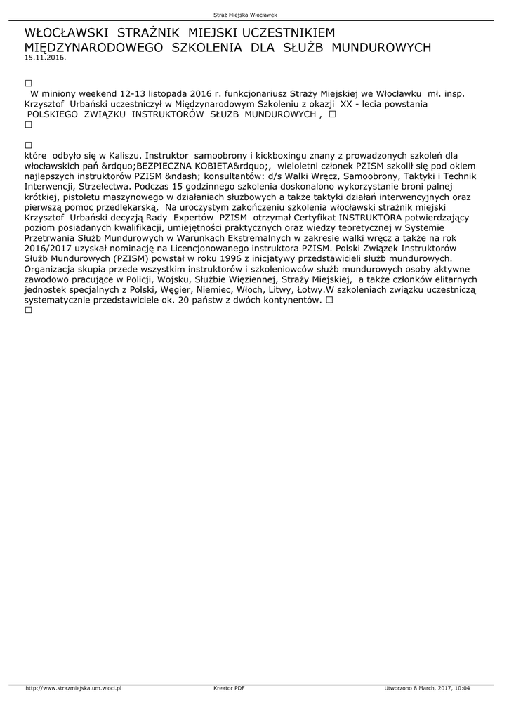 Straż Miejska Włocławek WŁOCŁAWSKI STRAŻNIK MIEJSKI UCZESTNIKIEM MIĘDZYNARODOWEGO SZKOLENIA DLA SŁUŻB MUNDUROWYCH 15.11.2016. W miniony weekend 12-13 listopada 2016 r. funkcjonariusz Straży Miejskiej we Włocławku mł. insp. Krzysztof Urbański uczestniczył w Międzynarodowym Szkoleniu z okazji XX - lecia powstania POLSKIEGO ZWIĄZKU INSTRUKTORÓW SŁUŻB MUNDUROWYCH , które odbyło się w Kaliszu. Instruktor samoobrony i kickboxingu znany z prowadzonych szkoleń dla włocławskich pań ”BEZPIECZNA KOBIETA”, wieloletni członek PZISM szkolił się pod okiem najlepszych instruktorów PZISM – konsultantów: d/s Walki Wręcz, Samoobrony, Taktyki i Technik Interwencji, Strzelectwa. Podczas 15 godzinnego szkolenia doskonalono wykorzystanie broni palnej krótkiej, pistoletu maszynowego w działaniach służbowych a także taktyki działań interwencyjnych oraz pierwszą pomoc przedlekarską. Na uroczystym zakończeniu szkolenia włocławski strażnik miejski Krzysztof Urbański decyzją Rady Expertów PZISM otrzymał Certyfikat INSTRUKTORA potwierdzający poziom posiadanych kwalifikacji, umiejętności praktycznych oraz wiedzy teoretycznej w Systemie Przetrwania Służb Mundurowych w Warunkach Ekstremalnych w zakresie walki wręcz a także na rok 2016/2017 uzyskał nominację na Licencjonowanego instruktora PZISM. Polski Związek Instruktorów Służb Mundurowych (PZISM) powstał w roku 1996 z inicjatywy przedstawicieli służb mundurowych. Organizacja skupia przede wszystkim instruktorów i szkoleniowców służb mundurowych osoby aktywne zawodowo pracujące w Policji, Wojsku, Służbie Więziennej, Straży Miejskiej, a także członków elitarnych jednostek specjalnych z Polski, Węgier, Niemiec, Włoch, Litwy, Łotwy.W szkoleniach związku uczestniczą systematycznie przedstawiciele ok. 20 państw z dwóch kontynentów. http://www.strazmiejska.um.wlocl.pl Kreator PDF Utworzono 8 March, 2017, 10:04