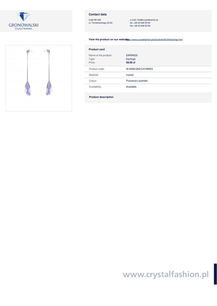 Powered by TCPDF (www.tcpdf.org) Contact data Łódź 90-349 ul. Tymienieckiego 22/24 e-mail: [email protected] tel. +48 42 648 05 60 fax +48 42 648 05 80 https://www.crystalfashion.pl/pl/produkt/60/254/earings.html View the product on our website: Product card Name of the product: Type: Price: EARINGS Earrings 68.00 zł Product code: W-6690/283/C/K/MM23 Material: crystal Colour: Provence Lavender Availability: Available Product description