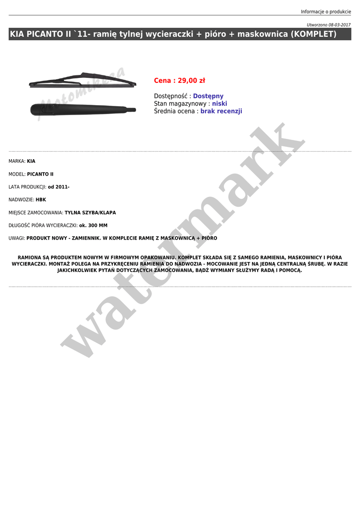 Informacje o produkcie Utworzono 08-03-2017 KIA PICANTO II `11- ramię tylnej wycieraczki + pióro + maskownica (KOMPLET) Cena : 29,00 zł MARKA: KIA MODEL: PICANTO II LATA PRODUKCJI: od 2011NADWOZIE: HBK er m ar k Dostępność : Dostępny Stan magazynowy : niski Średnia ocena : brak recenzji MIEJSCE ZAMOCOWANIA: TYLNA SZYBA/KLAPA DŁUGOŚĆ PIÓRA WYCIERACZKI: ok. 300 MM UWAGI: PRODUKT NOWY - ZAMIENNIK. W KOMPLECIE RAMIĘ Z MASKOWNICĄ + PIÓRO w at RAMIONA SĄ PRODUKTEM NOWYM W FIRMOWYM OPAKOWANIU. KOMPLET SKŁADA SIĘ Z SAMEGO RAMIENIA, MASKOWNICY I PIÓRA WYCIERACZKI. MONTAŻ POLEGA NA PRZYKRĘCENIU RAMIENIA DO NADWOZIA - MOCOWANIE JEST NA JEDNĄ CENTRALNĄ ŚRUBĘ. W RAZIE JAKICHKOLWIEK PYTAŃ DOTYCZĄCYCH ZAMOCOWANIA, BĄDŻ WYMIANY SŁUŻYMY RADĄ I POMOCĄ.