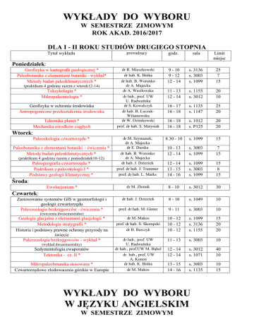 WYKŁADY DO WYBORU W SEMESTRZE ZIMOWYM ROK AKAD. 2016/2017 DLA I - II ROKU STUDIÓW DRUGIEGO STOPNIA prowadzący Tytuł wykładu godz. sala Limit miejsc dr R. Mieszkowski dr hab. K. Bińka dr hab. B. Woronko dr A. Majecka dr A. Wasiłowska dr hab., prof. UW U. Radwańska dr S. Kowalczyk dr hab. B. ŁuczakWilamowska dr W. Ozimkowski prof. dr hab. S. Matysiak 9 - 10 9 - 12 12 - 14 s. 3136 s. 3003 s. 1099 25 7 15 11 - 13 12 - 14 s. 1155 s. 3012 20 10 16 - 17 16 - 18 s. 1135 s. 1147 25 20 16 - 18 16 - 18 s. 1012 s. P125 20 20 8.30 - 10 s. 1099 15 10 - 13 12 - 14 s. 3003 s. 1099 7 15 Paleogeografia czwartorzędu * Praktikum z paleontologii I * Podstawy geologii klimatycznej * dr M. Szymanek, dr A. Majecka dr E. Durska dr hab. B. Woronko dr A. Majecka dr hab. J. Dzierżek prof. dr hab. J. Trammer prof. dr hab. L. Marks 12 - 14 13 - 15 14 - 16 s. 1099 s. 3003 s. 1099 15 8 15 Ewolucjonizm * dr M. Złotnik 8 - 10 s. 3012 30 Zastosowanie systemów GIS w geomorfologii i geologii czwartorzędu Paleozoologia bezkręgowców - ćwiczenia * dr hab. J. Dzierżek 8 - 10 s. 1049 10 prof. dr hab. M. Ginter 9 - 11 s. 3003 10 dr M. Makos prof. dr hab. S. Skompski dr B. Barczyk 10 - 12 10 - 12 10 - 12 s. 1099 s. 3136 s. 1155 15 20 20 dr hab., prof. UW U. Radwańska dr hab., prof.UW M. Bąbel dr hab., prof. UW A. Konon dr hab. K. Bińka dr M. Makos 11 - 13 s. 3003 10 12 - 14 12 - 14 s. 3012 s. 1071 40 10 13 - 15 14 - 16 s. 3003 s. 1135 10 15 Poniedziałek: Geofizyka w kartografii geologicznej * Paleobotanika z elementami botaniki - wykład* Metody badań paleoklimatycznych * (praktikum 4 godziny razem z wtorek12-14) Toksykologia * Mikropaleontologia * Geofizyka w ochronie środowiska Antropogeniczne przekształcenia środowiska Tektonika planet * Mechanika ośrodków ciągłych Wtorek: Paleoekologia czwartorzędu * Paleobotanika z elementami botaniki – ćwiczenia * Metody badań paleoklimatycznych * (praktikum 4 godziny razem z poniedziałek10-12) Środa: Czwartek: (ćwiczenia dwusemestralne) Geologia glacjalna z elementami glacjologii * Metodologia stratygrafii * Historia i podstawy prawne ochrony przyrody na świecie Paleozoologia bezkręgowców - wykład * (wykład dwusemestralny) Sedymentologia ewaporatów Tektonika - cz. II * Mikropaleobotanika stosowana * Czwartorzędowe zlodowacenia górskie w Europie WYKŁADY DO WYBORU W JĘZYKU ANGIELSKIM W SEMESTRZE ZIMOWYM ROK AKAD. 2016/2017 DLA I - II ROKU STUDIÓW DRUGIEGO STOPNIA Lp. 1 2 3 4 Tytuł Applied stratigraphy Prowadzący dr hab. M.Barski dr hab. A. Żylińska Engineering geological properties of oil-contaminated soils – a discussion course Regional geology of Poland dr D. Izdebska-Mucha Sedimentology of clastic rocks – a discussion course dr hab. A.Wysocka, prof. UW prof. dr hab. I.Walaszczyk Terminy zajęć zajęcia w ECEG w Chęcinach na koszt własny studentów (około 200 zł) w terminie: 22-27 stycznia 2017r. zajęcia w piątek w godz. 14-18 co 2 tygodnie zajęcia w dniach: 11, 13, 18, 20, 25, 27 października; 03 listopada 2016 r.; 10 i 12 stycznia 2017r. 10 spotkań w dniach: 07 października; 18 i 25 listopada; 02, 09 i 16 grudnia 2016 r. oraz 10, 13, 17 i 20 stycznia 2017r. UWAGA: Przedmioty oznaczone * i czerwoną barwą są obowiązkowe dla niektórych specjalności I i II roku studiów drugiego stopnia. Jeżeli jesteś studentem danej specjalności (patrz plan ramowy dla tej specjalności) to nie możesz ich wybrać jako przedmioty do wyboru. Powyższych przedmiotów nie mogą również wybierać studenci rejestrujący się na zajęcia dla II, III i IV roku studiów I-go stopnia (na kierunku geologia i/lub geologia stosowana). Rejestracja na zajęcia do wyboru wyłącznie w USOSweb pod adresem http://usosweb.dak.uw.edu.pl
