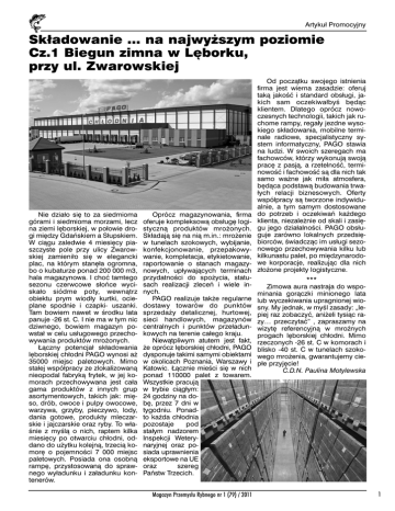 Artykuł Promocyjny Składowanie … na najwyższym poziomie Cz.1 Biegun zimna w Lęborku, przy ul. Zwarowskiej Nie działo się to za siedmioma górami i siedmioma morzami, lecz na ziemi lęborskiej, w połowie drogi między Gdańskiem a Słupskiem. W ciągu zaledwie 4 miesięcy piaszczyste pole przy ulicy Zwarowskiej zamieniło się w elegancki plac, na którym stanęła ogromna, bo o kubaturze ponad 200 000 m3, hala magazynowa. I choć tamtego sezonu czerwcowe słońce wyciskało siódme poty, wewnątrz obiektu prym wiodły kurtki, ocieplane spodnie i czapki- uszanki. Tam bowiem nawet w środku lata panuje -26 st. C. I nie ma w tym nic dziwnego, bowiem magazyn powstał w celu usługowego przechowywania produktów mrożonych. Łączny potencjał składowania lęborskiej chłodni PAGO wynosi aż 35000 miejsc paletowych. Mimo stałej współpracy ze zlokalizowaną nieopodal fabryką frytek, w jej komorach przechowywana jest cała gama produktów z innych grup asortymentowych, takich jak: mięso, drób, owoce i pulpy owocowe, warzywa, grzyby, pieczywo, lody, dania gotowe, produkty mleczarskie i jajczarskie oraz ryby. To właśnie z myślą o nich, raptem kilka miesięcy po otwarciu chłodni, oddano do użytku kolejną, trzecią komorę o pojemności 7 000 miejsc paletowych. Posiada ona osobną rampę, przystosowaną do sprawnego wyładunku i załadunku kontenerów. Oprócz magazynowania, firma oferuje kompleksową obsługę logistyczną produktów mrożonych. Składają się na nią m.in.: mrożenie w tunelach szokowych, wybijanie, konfekcjonowanie, przepakowywanie, kompletacja, etykietowanie, raportowanie o stanach magazynowych, upływających terminach przydatności do spożycia, statusach realizacji zleceń i wiele innych. PAGO realizuje także regularne dostawy towarów do punktów sprzedaży detalicznej, hurtowej, sieci handlowych, magazynów centralnych i punktów przeładunkowych na terenie całego kraju. Niewątpliwym atutem jest fakt, że oprócz lęborskiej chłodni, PAGO dysponuje takimi samymi obiektami w okolicach Poznania, Warszawy i Katowic. Łącznie mieści się w nich ponad 110000 palet z towarem. Wszystkie pracują w trybie ciągłym: 24 godziny na dobę, przez 7 dni w tygodniu. Ponadto każda chłodnia pozostaje pod stałym nadzorem Inspekcji Weterynaryjnej oraz posiada uprawnienia eksportowe na UE oraz szereg Państw Trzecich. Magazyn Przemysłu Rybnego nr 1 (79) / 2011 Od początku swojego istnienia firma jest wierna zasadzie: oferuj taką jakość i standard obsługi, jakich sam oczekiwałbyś będąc klientem. Dlatego oprócz nowoczesnych technologii, takich jak ruchome rampy, regały jezdne wysokiego składowania, mobilne terminale radiowe, specjalistyczny system informatyczny, PAGO stawia na ludzi. W swoich szeregach ma fachowców, którzy wykonują swoją pracę z pasją, a rzetelność, terminowość i fachowość są dla nich tak samo ważne jak miła atmosfera, będąca podstawą budowania trwałych relacji biznesowych. Oferty współpracy są tworzone indywidualnie, a tym samym dostosowane do potrzeb i oczekiwań każdego klienta, niezależnie od skali i zasięgu jego działalności. PAGO obsługuje zarówno lokalnych przedsiębiorców, świadcząc im usługi sezonowego przechowywania kilku lub kilkunastu palet, po międzynarodowe korporacje, realizując dla nich złożone projekty logistyczne. *** Zimowa aura nastraja do wspominania gorączki minionego lata lub wyczekiwania upragnionej wiosny. My jednak, w myśl zasady: „lepiej raz zobaczyć, aniżeli tysiąc razy… przeczytać” , zapraszamy na wizytę referencyjną w mroźnych progach lęborskiej chłodni. Mimo rzeczonych -26 st. C w komorach i blisko -40 st. C w tunelach szokowego mrożenia, gwarantujemy ciepłe przyjęcie! C.D.N. Paulina Motylewska 1