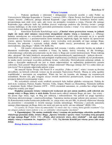 Katecheza 14 Wiara i rozum 1. Podczas spotkania z rektorami i delegacjami wyższych uczelni z całej Polski na Uniwersytecie Mikołaja Kopernika w Toruniu 7 czerwca 1999 r. Ojciec Święty Jan Paweł II powiedział między innymi: „Odkrycie, jakiego dokonał Kopernik i jego znaczenie w kontekście historii nauki, przypominają nam stale żywy spór, jaki toczy się pomiędzy rozumem a wiarą. Chociaż dla samego Kopernika jego odkrycie stało się źródłem jeszcze większego podziwu dla Stwórcy świata i potęgi rozumu ludzkiego, to dla wielu było powodem poróżnienia rozumu z wiarą”. Czy zatem rozum i wiara rzeczywiście nie dadzą się pogodzić? 2. Katechizm Kościoła Katolickiego uczy: „Chociaż wiara przewyższa rozum, to jednak nigdy nie może mieć miejsca rzeczywista niezgodność między wiarą a rozumem (...). «Dlatego badanie metodyczne we wszystkich dyscyplinach naukowych, jeżeli tylko prowadzi się je w sposób prawdziwie naukowy i z poszanowaniem norm moralnych, naprawdę nigdy nie będzie się sprzeciwiać wierze, sprawy bowiem świeckie i sprawy wiary wywodzą swój początek od tego samego Boga. Owszem, kto pokornie i wytrwale usiłuje zbadać tajniki rzeczy, prowadzony jest niejako, choć nieświadomie, ręką Boga».” (KKK 159; KDK 36). 3. Od czasów oświecenia, głoszącego kult rozumu i wiedzy, człowiek boryka się jednak z dramatem rozdźwięku między rozumem a wiarą. Są ludzie, którzy twierdzą, że dla światłego, wykształconego człowieka przyznawanie się do wiary w Boga jest czymś niestosownym. Wiarę traktują jako „ukojenie” dla ludzi biednych, niezaradnych, niewykształconych, zapóźnionych – jednym słowem – maluczkich tego świata. Z zachwytu nad postępem współczesnej cywilizacji zrodziło się też przekonanie, że nauka może rozwiązać wszystkie problemy świata i człowieka. Doświadczenie pokazuje jednak, że żadna z dyscyplin naukowych nie jest w stanie odpowiedzieć na najbardziej podstawowe pytania człowieka: Kim jestem? Skąd przychodzę i dokąd zmierzam? Dlaczego istnieje zło? Co czeka mnie po tym życiu? Na te pytania odpowiada jedynie wiara. Jak nauczał Ojciec Święty Jan Paweł II w encyklice „Fides et ratio”, wiara i rozum są dwoma skrzydłami, na których człowiek wznosi się do poznania Najwyższej Prawdy. Muszą ze sobą zgodnie współdziałać i nawzajem się uzupełniać. Wiara nie boi się rozumu, ale domaga się rozumowych uzasadnień. Rozum zaś, gdy osiągnie szczyt swoich możliwości poznawczych, uznaje za konieczne przyjęcie dalszych rozstrzygnięć wiary. We wszystkich czasach wielu wielkich uczonych było ludźmi głęboko wierzącymi. Należą do nich m.in. Linneusz, Pasteur, Kepler, Newton, Volta, Amper, Planck czy Heisenberg. Niemiecki noblista w dziedzinie fizyki Albert Einstein (1879 – 1955) stwierdził natomiast, że „wiedza bez religii kuleje, religia bez wiedzy jest ślepa”. Dogłębne poznanie świata i dziejowych wydarzeń nie jest zatem możliwe, jeśli człowiek nie uznaje wiary w Boga, który w nich działa. Rozum może odkryć istnienie Boga, ale sam – bez wiary – nie pozna Jego istoty, tego, że Bóg jest miłością i miłosierdziem. Nie potrafi też pojąć tajemnicy Chrystusa ukrzyżowanego i zmartwychwstałego. Tajemnicę można przyjąć jedynie przy pomocy wiary. Za Katechizmem trzeba koniecznie podkreślić, że „racją wiary nie jest fakt, że prawdy objawione okazują się prawdziwe i zrozumiałe w świetle naszego rozumu naturalnego. Wierzymy z powodu autorytetu samego objawiającego się Boga, który nie może ani sam się mylić, ani nas okłamać” (KKK 156). Co czynisz, by Twoja wiara się umacniała? Co może stać się z wiarą, która gardzi rozumem? Czy nie ulegasz pokusie wiary jedynie w to, co widzialne i dostrzegalne zmysłami? 4. Zapamiętajmy: Nie można rozdzielić wiary i rozumu nie pozbawiając człowieka możliwości właściwego poznania siebie, świata i Boga. „Sprawy świeckie i sprawy wiary wywodzą swój początek od tego samego Boga” (KKK 159). „Wiedz, abyś uwierzył; wierz, abyś wiedział” – tak ujął relacje między wiarą a rozumem św. Augustyn (354 – 430). Tej dewizie Kościół jest wierny przez całe swoje dzieje. Biskup Roman Marcinkowski