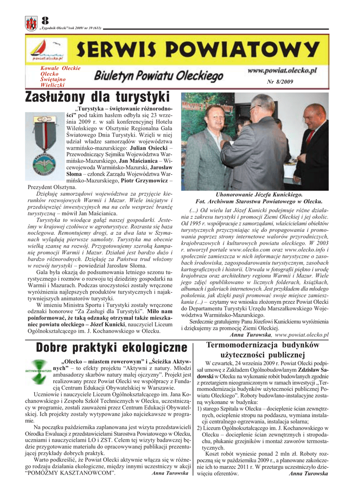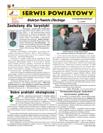 & Tygodnik Olecki/rok 2009/ nr 39 (611) Kowale Oleckie Olecko wiêtajno Wieliczki Nr 8/2009 Zas³u¿ony dla turystyki Turystyka wiêtowanie ró¿norodnoci pod takim has³em odby³a siê 23 wrzenia 2009 r. w sali konferencyjnej Hotelu Wileñskiego w Olsztynie Regionalna Gala wiatowego Dnia Turystyki. Wziêli w niej udzia³ w³adze samorz¹dów województwa warmiñsko-mazurskiego: Julian Osiecki Przewodnicz¹cy Sejmiku Województwa Warmiñsko-Mazurskiego, Jan Macianica Wicewojewoda Warmiñsko-Mazurski, Jaros³aw S³oma cz³onek Zarz¹du Województwa Warmiñsko-Mazurskiego, Piotr Grzymowicz Prezydent Olsztyna. Dziêkujê samorz¹dowi województwa za przyjêcie kierunków rozwojowych Warmii i Mazur. Wiele inicjatyw i przedsiêwziêæ inwestycyjnych ma na celu wesprzeæ bran¿ê turystyczn¹ mówi³ Jan Macianica. Turystyka to wiod¹ca ga³¹ naszej gospodarki. Jestemy w krajowej czo³ówce w agroturystyce. Rozrasta siê baza noclegowa. Remontujemy drogi, a za dwa lata w Szymanach wyl¹duj¹ pierwsze samoloty. Turystyka ma obecnie wielk¹ szansê na rozwój. Przygotowujemy szerok¹ kampaniê promocji Warmii i Mazur. Dzia³añ jest bardzo du¿o i bardzo ró¿norodnych. Dziêkujê za Pañstwa trud w³o¿ony w rozwój turystyki powiedzia³ Jaros³aw S³oma. Gala by³a okazj¹ do podsumowania letniego sezonu turystycznego i rozmów o rozwoju tej dziedziny gospodarki na Warmii i Mazurach. Podczas uroczystoci zosta³y wrêczone wyró¿nienia najlepszych produktów turystycznych i najaktywniejszych animatorów turystyki. W imieniu Ministra Sportu i Turystyki zosta³y wrêczone odznaki honorowe Za Zas³ugi dla Turystyki. Mi³o nam poinformowaæ, ¿e tak¹ odznakê otrzyma³ tak¿e mieszkaniec powiatu oleckiego Józef Kunicki, nauczyciel Liceum Ogólnokszta³c¹cego im. J. Kochanowskiego w Olecku. Uhonorowanie Józefa Kunickiego. Fot. Archiwum Starostwa Powiatowego w Olecku. (...) Od wielu lat Józef Kunicki podejmuje ró¿ne dzia³ania z zakresu turystyki i promocji Ziemi Oleckiej i jej okolic. Od 1995 r. wspó³pracuje z samorz¹dami, w³acicielami obiektów turystycznych przyczyniaj¹c siê do propagowania i promowania poprzez strony internetowe walorów przyrodniczych, krajobrazowych i kulturowych powiatu oleckiego. W 2003 r. utworzy³ portale www.olecko.com oraz www.olecko.info i spo³ecznie zamieszcza w nich informacje turystyczne o zasobach rodowiska, zagospodarowaniu turystycznym, zasobach kartograficznych i historii. Utrwala w fotografii piêkno i urodê krajobrazu oraz architektury regionu Warmii i Mazur. Wiele jego zdjêæ opublikowano w licznych folderach, ksi¹¿kach, albumach i galeriach internetowych. Jest przyk³adem dla m³odego pokolenia, jak dziêki pasji promowaæ swoje miejsce zamieszkania (...) czytamy we wniosku z³o¿onym przez Powiat Olecki do Departamentu Turystyki Urzêdu Marsza³kowskiego Województwa Warmiñsko-Mazurskiego. Serdecznie gratulujemy Panu Józefowi Kunickiemu wyró¿nienia i dziêkujemy za promocjê Ziemi Oleckiej. Anna Turowska, www.powiat.olecko.pl Dobre praktyki ekologiczne Olecko miastem rowerowym i cie¿ka Aktywnych to efekty projektu Aktywni z natury. M³odzi ambasadorzy skarbów natury ma³ej ojczyzny. Projekt jest realizowany przez Powiat Olecki we wspó³pracy z Fundacj¹ Centrum Edukacji Obywatelskiej w Warszawie. Uczniowie i nauczyciele Liceum Ogólnokszta³c¹cego im. Jana Kochanowskiego i Zespo³u Szkó³ Technicznych w Olecku, uczestnicz¹cy w programie, zostali zauwa¿eni przez Centrum Edukacji Obywatelskiej. Ich projekty zosta³y wytypowane jako najciekawsze w programie. Na pocz¹tku padziernika zaplanowana jest wizyta przedstawicieli Orodka Ewaluacji z przedstawicielami Starostwa Powiatowego w Olecku, uczniami i nauczycielami LO i ZST. Celem tej wizyty badawczej bêdzie przygotowanie materia³u do opracowywanej publikacji prezentuj¹cej przyk³ady dobrych praktyk. Warto podkreliæ, ¿e Powiat Olecki aktywnie w³¹cza siê w ró¿nego rodzaju dzia³ania ekologiczne, miêdzy innymi uczestniczy w akcji POMÓMY KASZTANOWCOM. Anna Turowska Termomodernizacja budynków u¿ytecznoci publicznej W czwartek, 24 wrzenia 2009 r. Powiat Olecki podpisa³ umowê z Zak³adem Ogólnobudowlanym Zdzis³aw Sadowski w Olecku na wykonanie robót budowlanych zgodnie z przetargiem nieograniczonym w ramach inwestycji Termomodernizacja budynków u¿ytecznoci publicznej Powiatu Oleckiego. Roboty budowlano-instalacyjne zostan¹ wykonane w budynku: 1) starego Szpitala w Olecku docieplenie cian zewnêtrznych, ocieplenie stropu na poddaszu, wymiana instalacji centralnego ogrzewania, instalacja solarna; 2) Liceum Ogólnokszta³c¹cego im. J. Kochanowskiego w Olecku docieplenie cian zewnêtrznych i stropodachu, p³ukanie grzejników i monta¿ zaworów termostatycznych. Koszt robót wyniesie ponad 2 mln z³. Roboty rozpoczn¹ siê w padzierniku 2009 r., a planowane zakoñczenie ich to marzec 2011 r. W przetargu uczestniczy³o dziewiêciu oferentów. Anna Turowska ' Postaw na edukacjê w szkole ponadgimnazjalnej powiatu W sali konferencyjnej Starostwa Powiatowego w Olecku 21 wrzenia 2009 r. odby³o siê posiedzenie Powiatowej Rady Zatrudnienia w Olecku. Podczas spotkania Wicestarosta Olecki Maria Dzienisiewicz zaprezentowa³a cele i g³ówne dzia³ania projektu Dowiedz siê wiêcej o kierunkach kszta³cenia w powiecie oleckim!, który realizowany jest przez Powiat Olecki od wrzenia 2009 r. rodki na jego urzeczywistnienie, to jest 50.000 z³, pochodz¹ z Europejskiego Funduszu Spo³ecznego w ramach Dzia³ania 9.5. Oddolne inicjatywy edukacyjne na obszarach wiejskich Programu Operacyjnego Kapita³ Ludzki. Poprzez szereg dzia³añ promuj¹cych ofertê kierunków kszta³cenia szkó³ ponadgimnazjalnych powiatu oleckiego spotkania informacyjno-promocyjne w gimnazjach powiatu, emisjê reklam radiowych, publikacjê reklam prasowych, wydanie publikacji i nagranie filmu promocyjnego zachêcimy uczniów gimnazjów do podejmowania nauki w naszych szko³ach. Mamy nadziejê, ¿e realizacja p