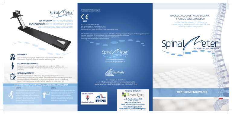 ® SYSTEM CERTYFIKOWANY JAKO „Urządzenie medyczne klasy I/M” EWOLUCJA KOMPLETNEGO BADANIA SYSTEMU SZKIELETOWEGO 3D BIOMETRIC POSTURAL EXAM DLA PACJENTA JEST TO TYLKO ZDJĘCIE DLA SPECJALISTY JEST TO OBIEKTYWNE BADANIE W CELU UZYSKANIA PEWNEJ DIAGNOZY 0398 SYSTEM OPATENTOWANY - CERTYFIKAT CE Zarejestrowany we Włoskim Ministerstwie Zdrowia „Katalog urządzeń medycznych” Nazwa i model: SPINALMETER Kod przyznany przez producenta: SP_2011 Klasyfikacja CE: Klasa I z funkcją pomiarów Klasyfikacja CND: V0399 Urządzenia z funkcją pomiarów – inny SPINALMETER jest zarejestrowany z numerem 477944/R w „Katalogu Urządzeń Medycznych” Włoskiego Minsterstwa Zdrowia, które może być konsultowane przez oddziały Narodowej Służby Zdrowia. Umowa z CONSIP na zakup online przez Administrację Publiczną na stronie internetowej www.acquistinretepa.it ® 3D BIOMETRIC POSTURAL EXAM ® UNIKALNY ESAME BIOMETRICO POSTURALE 3D SpinalMeter jest jedynym medycznym urządzeniem, które potrafi analizować kręgosłup poprzez modele matematyczne. Email: [email protected] Strona: www.spinalmeter.it BEZ PROMIENIOWANIA Bez promieniowania dla obsługującego oraz pacjenta. Możliwe jest przeprowadzenie badań większej ilości osób oraz powtarzanie w razie potrzeby. NATYCHMIASTOWY ® INFORMATION TECHNOLOGY s.r.l. Badanie trwa zaledwie kilka minut. Diagnoza jest natychmiastowa. Instrumenty korygujące mogą zostać zastosowane natychmiast na podstawie wyników badania SpinalMeter, a efekt korekcji może zostać sprawdzony natychmiastowo (aparat ortodontyczny, stabilizator łuku stopy itd). NIEKTÓRE DZIEDZINY WYKORZYSTANIA URZĄDZENIA SPINALMETER SPORTY SZKOŁA Przesiewowe badanie posturalne dla całej drużyny w celu ustalenia indywidualnego treningu dla każdego sportowca; jest to najlepsza inwestycja dla całej drużyny jak i dla sportowca, który będzie mógł zapewnić większą wydajność zmniejszając ryzyko kontuzji. Przesiewowe badanie posturalne dla wszystkich uczniów, bezpośrednio w szkołach, w celu zapobiegania zaburzeń kolumny kręgosłupa podczas fazy rozwoju, kiedy nadal możlwa jest interwencja w sposób efektywny i nieinwazyjny. Via del Maglio, 6 - 05100 Terni Email: [email protected] | Strona: www.maestraleit.it Numer telefonu: +39 0744 43 62 25 | Fax: +39 0744 43 19 44 Wyłączny dystrybutor ul. E. Wasilewskiego 20/8 30-305 Kraków Tel: 0048 12 345 20 31 Email: [email protected] www.itmedicalgroup.com www.facebook,com/itmedicalgroup BEZ PROMIENIOWANIA polski SPINALMETER ZMIENIA SPOSÓB BADANIA KOLUMNY KRĘGOSŁUPA SOLIDNE ZALETY URZĄDZENIA DLA PACJENTA ORAZ DLA PLACÓWKI MEDYCZNEJ PROSTE, SZYBKIE, NIEINWAZYJNE I BEZPIECZNE Badanie SPINALMETER: brak promieniowania, maksymalny poziom bezpieczeństwa, możliwość powtórzenia badania nawet w krótkich odstępach czasu, doskonałe urządzenie do stosowania w profilaktyce. SpinalMeter to pomoc diagnostyczna, która pozwala na wykrycie nieprawidłowości kręgosłupa, szczególnie paramorfizmów takich jak skolioza, kifoza czy lordoza oraz na obliczenie aż do 3 kątów Cobba. Badanie nie używa promieniowania, jest ono bezpieczne do przeprowadzania systematycznych badań kontrolnych oraz do zweryfikowania efektywności wybranego leczenia. Rewolucyjne w swoim rodzaju, unikalne na świecie, urządzenie SpinalMeter potrafi przeprowadzić serię biometrycznych pomiarów z odwzorowaniem 3D kolumny kręgosłupa w czasie rzeczywistym, pozwalając specjalistom medycznym na trafną diagnozę opartą na obiektywnych danych oraz na zapobieganiu i/lub wykrywaniu licznych, bolesnych symptomów u pacjentów. Radykalna zmiana w diagnostycznym podejściu do oceny postawy sprawiła, że Maestrale Information Technology srl, pod naukową dyrektywą Departamentu Medycyny Sportowej – ASL2 – Uniwersytetu w Perugii, stworzył urządzenie medyczne SpinalMeter. Wykorzystanie tego urządzenia zapewnia otrzymanie wszystkich informacji potrzebnych do zlecenia leczenia konkretnego problemu oraz pozwala na liczne interdyscyplinarne relacje ze specjalistami, jeżeli wskazuje na to złożoność procedury diagnostycznej. BIOMETRYCZNE BADANIE POSTURALNE W CZTERECH KROKACH Uzyskanie obrazu następuje poprzez zrobienie cyfrowego zdjęcia, a więc brak promieniowania. Ta cecha jest absolutną rewolucją i niesłychanie wpływa na leczenie profilaktyczne, pozwalając przebadać oraz monitorować dużą ilość osób w placówkach publicznych i prywatnych, ale także bezpośrednio w szkołach, centrach sportowych itd... Profesjonalny specjalista medyczny rozstawia markery na ciele pacjenta lub wybiera predefiniowane anatomiczne punkty na zdjęciu w programie za pomocą myszy. SpinalMeter, poprzez uzyskane zdjęcia, natychmiast przeprowadza kompletne odwzorowanie ciała przedstawiając strukturę szkieletową w 3D. Program tworzy rekonstrukcję za pomocą matematycznych (nie statystycznych) modeli, które pozwalają na opracowanie specyficznego klinicznego przypadku. Biometryczne pomiary są uzupełniane innymi danymi, które są bardzo ważne w prawidłowej diagnozie, takimi jak obliczenie niektórych kątów, które zostały utworzone, obliczenie powierzchni, pomiaru kątów Cobba, pozycji bocznej i pozycji garba. Możliwe jest także porównanie z poprzednimi badaniami oraz ze zdjęciami rentgenowskimi. Z klinicznego punktu widzenia zalety dla publicznych placówek są ogromne, a oszczędność kosztów dla systemów opieki zdrowotnej jest znacząca z powodu braku leczenia profilaktycznego: w Europie każdego roku ponad 600 milionów dni roboczych jest straconych z powodu patologii związanych ze złą postawą kręgosłupa. Bóle w odcinkach szyjnym i lędźwiowym są przyczyną najczęstszych powodów nieobecności. (źródło: Europejska Agencja Bezpieczeństwa i Zdrowia w Pracy). GŁÓWNE DZIEDZINY ZASTOSOWANIA URZĄDZENIA Posturologia Możliwość wykonania niezliczonej ilości zdjęć pozwala specjalistom na sprawdzenie efektywności instrumentów ko
