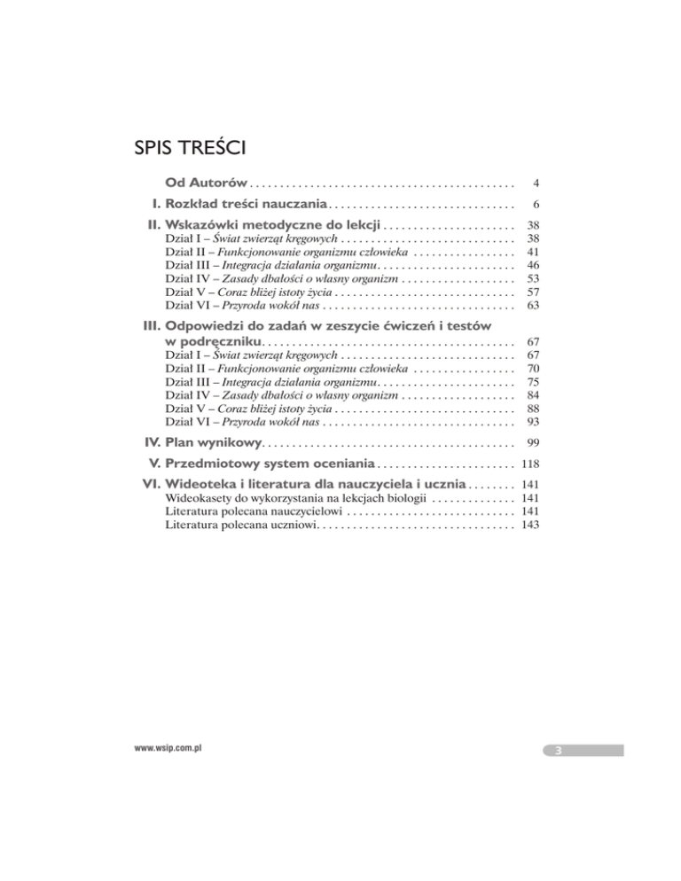 SPIS TREŚCI Od Autorów . . . . . . . . . . . . . . . . . . . . . . . . . . . . . . . . . . . . . . . . . . . . 4 I. Rozkład treści nauczania . . . . . . . . . . . . . . . . . . . . . . . . . . . . . . . 6 II. Wskazówki metodyczne do lekcji . . . . . . . . . . . . . . . . . . . . . . 38 Dział I – Świat zwierząt kręgowych . . . . . . . . . . . . . . . . . . . . . . . . . . . . . Dział II – Funkcjonowanie organizmu człowieka . . . . . . . . . . . . . . . . . Dział III – Integracja działania organizmu. . . . . . . . . . . . . . . . . . . . . . . Dział IV – Zasady dbałości o własny organizm . . . . . . . . . . . . . . . . . . . Dział V – Coraz bliżej istoty życia . . . . . . . . . . . . . . . . . . . . . . . . . . . . . . Dział VI – Przyroda wokół nas . . . . . . . . . . . . . . . . . . . . . . . . . . . . . . . . 38 41 46 53 57 63 III. Odpowiedzi do zadań w zeszycie ćwiczeń i testów w podręczniku . . . . . . . . . . . . . . . . . . . . . . . . . . . . . . . . . . . . . . . . . . 67 Dział I – Świat zwierząt kręgowych . . . . . . . . . . . . . . . . . . . . . . . . . . . . . Dział II – Funkcjonowanie organizmu człowieka . . . . . . . . . . . . . . . . . Dział III – Integracja działania organizmu. . . . . . . . . . . . . . . . . . . . . . . Dział IV – Zasady dbałości o własny organizm . . . . . . . . . . . . . . . . . . . Dział V – Coraz bliżej istoty życia . . . . . . . . . . . . . . . . . . . . . . . . . . . . . . Dział VI – Przyroda wokół nas . . . . . . . . . . . . . . . . . . . . . . . . . . . . . . . . 67 70 75 84 88 93 IV. Plan wynikowy. . . . . . . . . . . . . . . . . . . . . . . . . . . . . . . . . . . . . . . . . . 99 V. Przedmiotowy system oceniania . . . . . . . . . . . . . . . . . . . . . . . 118 VI. Wideoteka i literatura dla nauczyciela i ucznia . . . . . . . . 141 Wideokasety do wykorzystania na lekcjach biologii . . . . . . . . . . . . . . 141 Literatura polecana nauczycielowi . . . . . . . . . . . . . . . . . . . . . . . . . . . . 141 Literatura polecana uczniowi . . . . . . . . . . . . . . . . . . . . . . . . . . . . . . . . . 143 www.wsip.com.pl 3