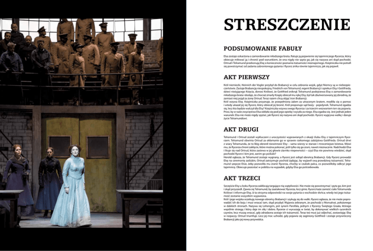 Streszczenie PODSUMOWANIE FABUŁY Elsa zostaje oskarżona o zamordowanie młodszego brata. Ratuje ją pojawienie się tajemniczego Rycerza, który obiecuje miłować ją i chronić pod warunkiem, że ona nigdy nie spyta go, jak się nazywa ani skąd pochodzi. Ortrud i Telramund przekonują Elsę o konieczności poznania tożsamości nieznajomego. Księżniczka nie potrafi się powstrzymać od zadania zabronionego pytania i Rycerz znika równie tajemniczo, jak się pojawił. AKT PIERWSZY Król niemiecki, Heinrich der Vogler przybył do Brabancji w celu zebrania wojsk, gdyż Niemcy są w niebezpieczeństwie. Zastaje Brabancję niespokojną. Friedrich von Telramund, regent Brabancji i opiekun Elsy i Gottfrieda, dzieci nieżyjącego Księcia, donosi Królowi, że Gottfried zniknął. Telramund podejrzewa Elsę o zamordowanie młodszego brata i dodaje, że chociaż zmarły Książę obiecał mu rękę Elsy, był tak zbulwersowany jej zbrodnią, że zamiast niej pojął za żonę Ortrud. Teraz razem chcą objąć tron Brabancji. Król wzywa Elsę. Księżniczka przyznaje, że przepełniona żalem za utraconym bratem, modliła się o pomoc i wtedy ukazał jej się Rycerz, który obiecał jej bronić. Król proponuje sąd boży - pojedynek. Telramund zgadza się, lecz kto będzie walczył dla Elsy? Księżniczka wzywa swego Rycerza i za trzecim wezwaniem ten się pojawia. Prosi, by w razie zwycięstwa Elsa oddała się pod jego opiekę i wyszła za niego. Elsa zgadza się. Jest jednak jeden warunek: Elsa nie może nigdy spytać, jak Rycerz się nazywa ani skąd pochodzi. Rycerz wygrywa walkę i daruje życie Telramundowi. AKT DRUGI Telramund i Ortrud zostali wykluczeni z uroczystości wyprawianych z okazji ślubu Elsy z tajemniczym Rycerzem. Telramund obwinia Ortrud za okłamanie go w sprawie rzekomego zabójstwa Gottfrieda. Ortrud drwi z wiary Telramunda, że to Bóg obronił niewinność Elsy – sama wierzy w starsze i mroczniejsze bóstwa. Mówi mu, że Rycerza chroni zaklęcie, które można pokonać, jeśli tylko się go zrani, nawet nieznacznie. Nadchodzi Elsa i lituje się nad Ortrud, która zasiewa w jej głowie ziarnko niepewności – czyż Elsa nie powinna wiedzieć, skąd pochodzi Rycerz i kim jest, zanim go poślubi? Herold ogłasza, że Telramund zostaje wygnany, a Rycerz jest odtąd obrońcą Brabancji. Gdy Rycerz prowadzi Elsę na ceremonię zaślubin, Ortrud zatrzymuje pochód żądając, by wyjawił swą prawdziwą tożsamość. Telramund szepcze Elsie, żeby pozwoliła mu zranić Rycerza, choćby w czubek palca, co pozwoliłoby odkryć jego tajemnicę. Obiecuje pozostać w pobliżu na wypadek, gdyby Elsa go potrzebowała. AKT TRZECI Szczęście Elsy u boku Rycerza zakłócają targające nią wątpliwości. Nie może się powstrzymać i pyta go, kim jest i skąd przyszedł. Zjawia się Telramund, by zaatakować Rycerza, lecz ginie. Rycerz każe zanieść ciało Telramunda Królowi i informuje Elsę, iż ta otrzyma odpowiedzi na swoje pytania o wschodzie słońca; wtedy też jego tożsamość zostanie wszystkim wyjawiona. Król i jego wojska oczekują nowego obrońcy Brabancji i szykują się do walki. Rycerz ogłasza, że nie może poprowadzić ich do boju i musi wracać tam, skąd przybył. Wyjawia zebranym, że pochodzi z Monsalvat, położonego w dalekich stronach. Nazywa się Lohengrin, jest synem Parsifala, jednym z Rycerzy Świętego Graala, którego wspólnie strzegą i który daje im siłę i dobro. Rycerze ci wyruszają w świat, by dokonywać wielkich rycerskich czynów, lecz muszą wracać, gdy zdradzona zostaje ich tożsamość. Teraz też musi już odjechać, zostawiając Elsę w rozpaczy. Ortrud triumfuje. Lecz jej moc uchodzi, gdy pojawia się zaginiony Gottfried i zostaje przywrócony Brabancji jako jej nowy przywódca. Synopsis PLOT SUMMARY Elsa stands accused of the murder of her younger brother. She is saved by the appearance of a mysterious Knight. He tells her that he will love and protect her but that she must never ask his name or where he comes from. Ortrud and Telramund convince Elsa that she must find out who he is. She is unable to resist asking the forbidden question and the Knight leaves as mysteriously as he arrived. ACT ONE King Heinrich of the Germans has come to Brabant to recruit fighting forces, as Germany is under threat. He finds Brabant in turmoil. Friedrich von Telramund, the appointed regent of Brabant and guardian to Elsa and Gottfried, the late Duke’s children, tells the King that Gottfried has disappeared. Telramund suspects Elsa of having murdered her young brother and adds that, although the late Duke had promised him Elsa’s hand in marriage, her crime has so appalled him that he has instead married Ortrud. Together they now claim the throne of Brabant. The King summons Elsa. She confesses that, grieving for her lost brother, she prayed for help and was visited by a vision of a Knight who promised to defend her. The King proposes a trial by combat. Telramund accepts, but who will champion Elsa? She calls upon her Knight and, at the third summons, he appears. He asks Elsa to entrust herself to his protection and to marry him if he is victorious. Elsa agrees. There is one condition: Elsa must never ask the Knight’s name or where he comes from. The Knight wins the fight, sparing Telramund’s life. ACT TWO Telramund and Ortrud have been excluded from the festivities taking place to celebrate Elsa’s wedding to the mysterious Knight. Telramund blames Ortrud for having lied to him about Gottfried’s supposed murder. Ortrud ridicules Telramund for believing that God has protected Elsa’s innocence – she believes in older and darker gods. She tells him that the Knight is under a protective spell, which can be broken the moment he is wounded, however slightly. Elsa appears and takes pity on Ortrud, who begins to sow the seeds of doubt in her mind – should Elsa not know where the Knight comes from and who he is before marrying 