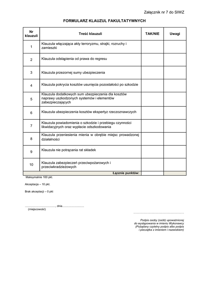 Załącznik nr 7 do SIWZ FORMULARZ KLAUZUL FAKULTATYWNYCH Nr klauzuli Treść klauzuli TAK/NIE 1 Klauzula włączająca akty terroryzmu, strajki, rozruchy i zamieszki 2 Klauzula odstąpienia od prawa do regresu 3 Klauzula przezornej sumy ubezpieczenia 4 Klauzula pokrycia kosztów usunięcia pozostałości po szkodzie 5 Klauzula dodatkowych sum ubezpieczenia dla kosztów naprawy uszkodzonych systemów i elementów zabezpieczających 6 Klauzula ubezpieczenia kosztów ekspertyz rzeczoznawczych 7 Klauzula powiadomienia o szkodzie i przebiegu czynności likwidacyjnych oraz wypłacie odszkodowania 8 Klauzula przeniesienia mienia w obrębie miejsc prowadzonej działalności 9 Klauzula nie potrącania rat składek 10 Klauzula zabezpieczeń przeciwpożarowych i przeciwkradzieżowych Uwagi Łącznie punktów: Maksymalnie 100 pkt. Akceptacja – 10 pkt. Brak akceptacji – 0 pkt ......................................., dnia............................ (miejscowość) ……………………………………………… Podpis osoby (osób) upoważnionej do występowania w imieniu Wykonawcy (Pożądany czytelny podpis albo podpis i pieczątka z imieniem i nazwiskiem)
