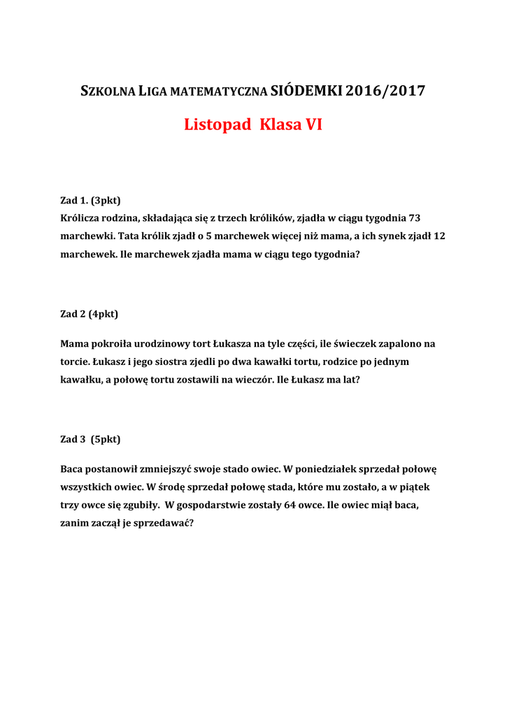 SZKOLNA LIGA MATEMATYCZNA SIÓDEMKI 2016/2017 Listopad Klasa VI Zad 1. (3pkt) Królicza rodzina, składająca się z trzech królików, zjadła w ciągu tygodnia 73 marchewki. Tata królik zjadł o 5 marchewek więcej niż mama, a ich synek zjadł 12 marchewek. Ile marchewek zjadła mama w ciągu tego tygodnia? Zad 2 (4pkt) Mama pokroiła urodzinowy tort Łukasza na tyle części, ile świeczek zapalono na torcie. Łukasz i jego siostra zjedli po dwa kawałki tortu, rodzice po jednym kawałku, a połowę tortu zostawili na wieczór. Ile Łukasz ma lat? Zad 3 (5pkt) Baca postanowił zmniejszyć swoje stado owiec. W poniedziałek sprzedał połowę wszystkich owiec. W środę sprzedał połowę stada, które mu zostało, a w piątek trzy owce się zgubiły. W gospodarstwie zostały 64 owce. Ile owiec miął baca, zanim zaczął je sprzedawać?