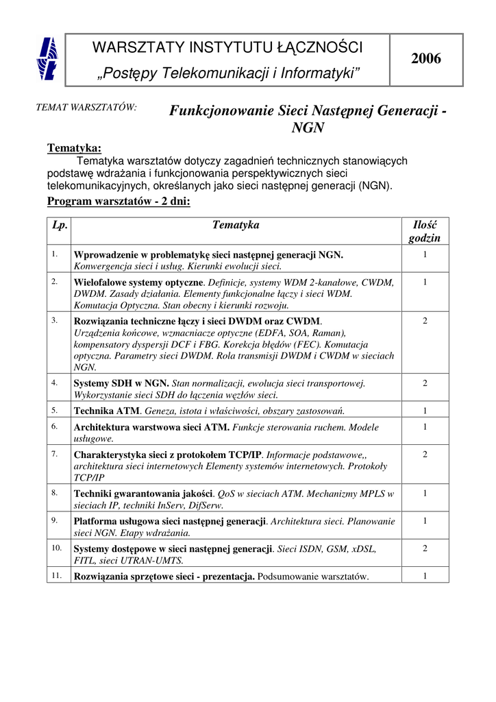 WARSZTATY INSTYTUTU ŁĄCZNOŚCI 2006 „Postępy Telekomunikacji i Informatyki” TEMAT WARSZTATÓW: Funkcjonowanie Sieci Następnej Generacji NGN Tematyka: Tematyka warsztatów dotyczy zagadnień technicznych stanowiących podstawę wdrażania i funkcjonowania perspektywicznych sieci telekomunikacyjnych, określanych jako sieci następnej generacji (NGN). Program warsztatów - 2 dni: Lp. Tematyka Ilość godzin 1. Wprowadzenie w problematykę sieci następnej generacji NGN. Konwergencja sieci i usług. Kierunki ewolucji sieci. 1 2. Wielofalowe systemy optyczne. Definicje, systemy WDM 2-kanałowe, CWDM, DWDM. Zasady działania. Elementy funkcjonalne łączy i sieci WDM. Komutacja Optyczna. Stan obecny i kierunki rozwoju. 1 3. Rozwiązania techniczne łączy i sieci DWDM oraz CWDM. Urządzenia końcowe, wzmacniacze optyczne (EDFA, SOA, Raman), kompensatory dyspersji DCF i FBG. Korekcja błędów (FEC). Komutacja optyczna. Parametry sieci DWDM. Rola transmisji DWDM i CWDM w sieciach NGN. 2 4. Systemy SDH w NGN. Stan normalizacji, ewolucja sieci transportowej. Wykorzystanie sieci SDH do łączenia węzłów sieci. 2 5. Technika ATM. Geneza, istota i właściwości, obszary zastosowań. 1 6. Architektura warstwowa sieci ATM. Funkcje sterowania ruchem. Modele usługowe. 1 7. Charakterystyka sieci z protokołem TCP/IP. Informacje podstawowe,, architektura sieci internetowych Elementy systemów internetowych. Protokoły TCP/IP 2 8. Techniki gwarantowania jakości. QoS w sieciach ATM. Mechanizmy MPLS w sieciach IP, techniki InServ, DifSerw. 1 9. Platforma usługowa sieci następnej generacji. Architektura sieci. Planowanie sieci NGN. Etapy wdrażania. 1 10. Systemy dostępowe w sieci następnej generacji. Sieci ISDN, GSM, xDSL, FITL, sieci UTRAN-UMTS. 2 11. Rozwiązania sprzętowe sieci - prezentacja. Podsumowanie warsztatów. 1