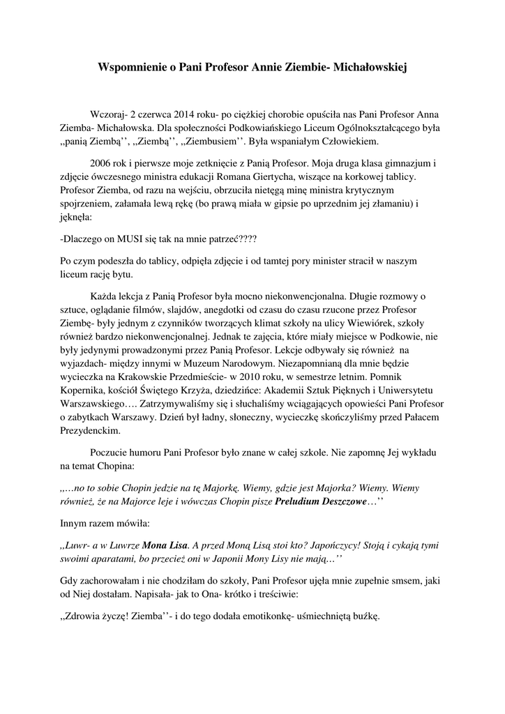 Wspomnienie o Pani Profesor Annie Ziembie- Michałowskiej Wczoraj- 2 czerwca 2014 roku- po ciężkiej chorobie opuściła nas Pani Profesor Anna Ziemba- Michałowska. Dla społeczności Podkowiańskiego Liceum Ogólnokształcącego była ,,panią Ziembą’’, ,,Ziembą’’, ,,Ziembusiem’’. Była wspaniałym Człowiekiem. 2006 rok i pierwsze moje zetknięcie z Panią Profesor. Moja druga klasa gimnazjum i zdjęcie ówczesnego ministra edukacji Romana Giertycha, wiszące na korkowej tablicy. Profesor Ziemba, od razu na wejściu, obrzuciła nietęgą minę ministra krytycznym spojrzeniem, załamała lewą rękę (bo prawą miała w gipsie po uprzednim jej złamaniu) i jęknęła: -Dlaczego on MUSI się tak na mnie patrzeć???? Po czym podeszła do tablicy, odpięła zdjęcie i od tamtej pory minister stracił w naszym liceum rację bytu. Każda lekcja z Panią Profesor była mocno niekonwencjonalna. Długie rozmowy o sztuce, oglądanie filmów, slajdów, anegdotki od czasu do czasu rzucone przez Profesor Ziembę- były jednym z czynników tworzących klimat szkoły na ulicy Wiewiórek, szkoły również bardzo niekonwencjonalnej. Jednak te zajęcia, które miały miejsce w Podkowie, nie były jedynymi prowadzonymi przez Panią Profesor. Lekcje odbywały się również na wyjazdach- między innymi w Muzeum Narodowym. Niezapomnianą dla mnie będzie wycieczka na Krakowskie Przedmieście- w 2010 roku, w semestrze letnim. Pomnik Kopernika, kościół Świętego Krzyża, dziedzińce: Akademii Sztuk Pięknych i Uniwersytetu Warszawskiego…. Zatrzymywaliśmy się i słuchaliśmy wciągających opowieści Pani Profesor o zabytkach Warszawy. Dzień był ładny, słoneczny, wycieczkę skończyliśmy przed Pałacem Prezydenckim. Poczucie humoru Pani Profesor było znane w całej szkole. Nie zapomnę Jej wykładu na temat Chopina: ,,…no to sobie Chopin jedzie na tę Majorkę. Wiemy, gdzie jest Majorka? Wiemy. Wiemy również, że na Majorce leje i wówczas Chopin pisze Preludium Deszczowe…’’ Innym razem mówiła: ,,Luwr- a w Luwrze Mona Lisa. A przed Moną Lisą stoi kto? Japończycy! Stoją i cykają tymi swoimi aparatami, bo przecież oni w Japonii Mony Lisy nie mają…’’ Gdy zachorowałam i nie chodziłam do szkoły, Pani Profesor ujęła mnie zupełnie smsem, jaki od Niej dostałam. Napisała- jak to Ona- krótko i treściwie: ,,Zdrowia życzę! Ziemba’’- i do tego dodała emotikonkę- uśmiechniętą buźkę. Dzięki Kochanej Pani Profesor zwiedzałam zabytki Krakowa, Zakopanego… Profesor Ziemba uwielbiała Kraków, więc gdy tylko dowiedziała się, iż będę w ferie zimowe najpierw w Krakowie, później w Zakopanem- błyskawicznie wymyśliła mi zadanie: -Helka, to Ty pozwiedzasz zabytki, a potem napiszesz mi piękną relację! Więc biegałam po kościołach Krakowa, po krakowskim Rynku, po Muzeum Narodowym (akurat była wystawa prac Francisco Goyi), a w Zakopanem byłam w willi ,,Atma’’, w Teatrze Witkacego, na cmentarzu na Pęksowym Brzyzku- między innymi, oczywiście, bo tego, o czego zwiedzenie prosiła mnie Profesor Ziemba było znacznie więcej. Po przeczytaniu rzeczonej pracy, pierwsze zdanie- wypowiedziane na jednym wydechu- jakie padło z ust Pani Profesor, gdy mnie zobaczyła na szkolnym korytarzu, brzmiało: -Hela, piękna praca, stówa, a w ogóle to bardzo ładnie wyglądasz! Za chwilę jeszcze dodała: -A jak tam Kraków? Jak moje miasto? Pewnie piękne, ośnieżone… Gdy moja nauka na Wiewiórek zbliżała się ku końcowi, w jednej z rozmów Pani Profesor stwierdziła: -Wiesz co, Helka? Obie żeśmy schudły przez te pięć lat! Zdrowo wówczas się uśmiałyśmy. Wyjechałam poza Warszawę na studia, ale pozostawałam z Panią Profesor w kontakcie e-mailowym. 26 lipca 2013 roku były imieniny Anny, więc wysłałam Jej życzenia. Odpowiedź brzmiała: ,,Wzruszona Ziemba dziękuje…’’ Pani Profesor! To ja Pani dziękuję… Za dobroć, ciepło, za opiekę… Jestem dumna, że mogę zaliczać się do grona Pani uczniów. Miałam w Pani Przyjaciela. ,,Przyjaciela’’ przez duże ,,p’’. Teraz, gdy nadal do mnie nie dociera, że nie spotkam już Pani na szkolnym korytarzu, że nie zamienię z Panią Profesor choć kilku słów, w głowie mam słowa utworu ,,Kolęda dla nieobecnych”: ,,Daj nam wiarę, że to ma sens, że nie trzeba żałować Przyjaciół. Gdyż gdziekolwiek są- dobrze im jest, bo są z nami, choć w innej postaci. I przekonaj, że tak ma być, że po głosach tych wciąż drży powietrze. Że odeszli po to, by żyć i tym razem będą żyć wiecznie…” Pani Profesor, nie mówię: ,,żegnaj’’. Powiem: ,,do zobaczenia’’. Przecież na pewno kiedyś się spotkamy… Helena Sarna, matura 2011, Wrocław 3.06.2014.