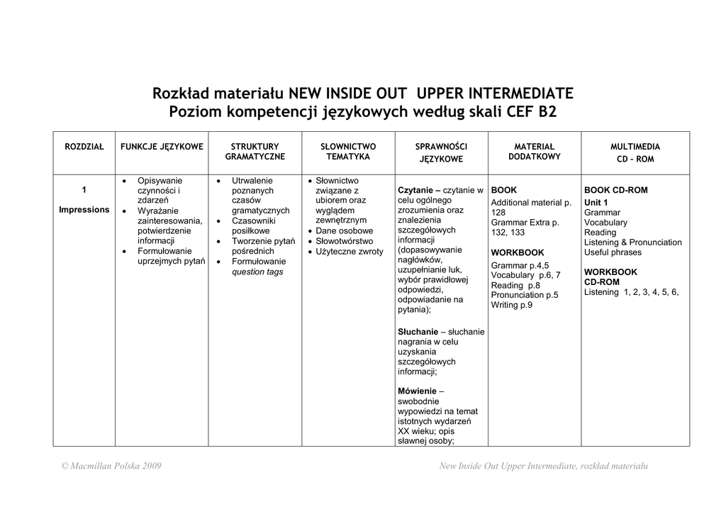 Rozkład materiału NEW INSIDE OUT UPPER INTERMEDIATE Poziom kompetencji językowych według skali CEF B2 ROZDZIAŁ FUNKCJE JĘZYKOWE 1 Impressions Opisywanie czynności i zdarzeń Wyrażanie zainteresowania, potwierdzenie informacji Formułowanie uprzejmych pytań STRUKTURY GRAMATYCZNE Utrwalenie poznanych czasów gramatycznych Czasowniki posiłkowe Tworzenie pytań pośrednich Formułowanie question tags SŁOWNICTWO TEMATYKA Słownictwo związane z ubiorem oraz wyglądem zewnętrznym Dane osobowe Słowotwórstwo Użyteczne zwroty SPRAWNOŚCI JĘZYKOWE Czytanie – czytanie w celu ogólnego zrozumienia oraz znalezienia szczegółowych informacji (dopasowywanie nagłówków, uzupełnianie luk, wybór prawidłowej odpowiedzi, odpowiadanie na pytania); MATERIAŁ DODATKOWY BOOK Additional material p. 128 Grammar Extra p. 132, 133 WORKBOOK Grammar p.4,5 Vocabulary p.6, 7 Reading p.8 Pronunciation p.5 Writing p.9 MULTIMEDIA CD – ROM BOOK CD-ROM Unit 1 Grammar Vocabulary Reading Listening & Pronunciation Useful phrases WORKBOOK CD-ROM Listening 1, 2, 3, 4, 5, 6, Słuchanie – słuchanie nagrania w celu uzyskania szczegółowych informacji; Mówienie – swobodnie wypowiedzi na temat istotnych wydarzeń XX wieku; opis sławnej osoby; © Macmillan Polska 2009 New Inside Out Upper Intermediate, rozkład materiału ROZDZIAŁ FUNKCJE JĘZYKOWE STRUKTURY GRAMATYCZNE SŁOWNICTWO TEMATYKA SPRAWNOŚCI JĘZYKOWE MATERIAŁ DODATKOWY MULTIMEDIA CD – ROM Pisanie – list nieformalny; Wymowa – intonacja w question tags 2 Generations Opisywanie relacji rodzinnych Wyrażanie przymusu i pozwolenia Wyrażanie opinii o czynnościach Konstrukcje bezokolicznikowe oraz z końcówką – ing Konstrukcja make/ let Konstrukcje bezokolicznikowe z przymiotnikami Czasowniki frazowe Przymiotniki występujące z określonymi przyimkami Użyteczne zwroty Czytanie – czytanie w celu ogólnego zrozumienia oraz znalezienia szczegółowych informacji (uzupełnianie luk, wybór prawidłowej odpowiedzi); Słuchanie – słuchanie nagrania w celu uzyskania szczegółowych informacji; BOOK Grammar Extra p. 132, 133 WORKBOOK Grammar p.10,11 Vocabulary p.12, 13 Listening p.14 Pronunciation p.13 Writing p.15 BOOK CD-ROM Unit 2 Grammar Vocabulary Reading Listening & Pronunciation Useful phrases WORKBOOK CD-ROM Listening 7,8, 9, Mówienie – opisywanie relacji między nastolatkami a rodzicami; rozmowa o szkolnych wymianach międzynarodowych uczniów; relacjonowanie zdarzeń Pisanie – e-mail; Wymowa – © Macmillan Polska 2008 New Inside Out Upper intermediate, rozkład materiału 2 ROZDZIAŁ FUNKCJE JĘZYKOWE STRUKTURY GRAMATYCZNE SŁOWNICTWO TEMATYKA SPRAWNOŚCI JĘZYKOWE MATERIAŁ DODATKOWY MULTIMEDIA CD – ROM samogłoski 3 Gold Opisywanie czynności hipotetycznych w odniesieniu do teraźniejszości i przeszłości Mowa zależna Kolokacje z make, have, take Okresy warunkowe Typowe zwroty z czasownikami take, make, have Słownictwo związane z pieniędzmi i biznesem Metafora Użyteczne zwroty Czytanie – czytanie w celu ogólnego zrozumienia oraz znalezienia szczegółowych informacji (uzupełnienie luk wybranymi słowami; wybór właściwej odpowiedzi; wyszukanie elementów leksykalnych w tekście); BOOK Grammar Extra p. 134, 135 WORKBOOK Grammar p.16, 17 Vocabulary p.18,19 Pronunciation p.19 Reading p. 20 Writing p.21 BOOK CD-ROM Unit 3 Grammar Vocabulary Reading Listening & Pronunciation Useful phrases WORKBOOK CD-ROM Listening 10, 11, 12, 13, 14, Słuchanie – weryfikacja poprawności podanych stwierdzeń; wybranie właściwej odpowiedzi; Mówienie – wyrażanie opinii na podane tematy; wypowiedzi na temat sytuacji hipotetycznych; opisywanie przedmiotów i wydarzeń z nimi związanych © Macmillan Polska 2008 New Inside Out Upper intermediate, rozkład materiału 3 ROZDZIAŁ FUNKCJE JĘZYKOWE STRUKTURY GRAMATYCZNE SŁOWNICTWO TEMATYKA SPRAWNOŚCI JĘZYKOWE MATERIAŁ DODATKOWY MULTIMEDIA CD – ROM Pisanie – opis REVIEW A 4 Powtórzenie, utrwalenie i poszerzenie nabytych w rozdziale umiejętności i wiadomości Wyrażanie współczucia, rad i zaleceń Challenge Powtórzenie i utrwalenie struktur gramatycznych z rozdziałów 1-3 Powtórzenie i utrwalenie słownictwa z rozdziałów 1-3 Czasy narracyjne Future continuous Future perfect Słowotwórstwo Kolokacje Czasowniki złożone Powtórzenie i utrwalenie wiadomości gramatyczno leksykalnych: Rozdział 1, 2, 3 Ćwiczenia powtórzeniowe i samoocena stopnia opanowania materiału Czytanie – czytanie w celu ogólnego zrozumienia; układanie zdań z rozsypanych wyrazów; uzupełnienie zdań; szczegółowe zrozumienie treści; uzupełnienie luk w tekście; poprawianie błędów; wskazanie konkretnych informacji; BOOK CD-ROM Review unit A BOOK Additional material p.128, 131 Grammar Extra p.134, 135 WORKBOOK Grammar p.22, 23 Vocabulary p.24, 25 Listening p.26 Pronunciation p.23 Writing p.27 BOOK CD-ROM Unit 4 Grammar Vocabulary Reading Listening & Pronunciation Useful phrases WORKBOOK CD-ROM Listening 15, 16, 17,18, 19, 20, Słuchanie – słuchanie nagrania w celu uzyskania © Macmillan Polska 2008 New Inside Out Upper intermediate, rozkład materiału 4 ROZDZIAŁ FUNKCJE JĘZYKOWE STRUKTURY GRAMATYCZNE SŁOWNICTWO TEMATYKA SPRAWNOŚCI JĘZYKOWE MATERIAŁ DODATKOWY MULTIMEDIA CD – ROM szczegółowych informacji; Mówienie – wyrażanie opinii; Pisanie –pisanie artykułu 5 Ritual Opisywanie czynności nawykowych w teraźniejszości i przeszłości Wyrażanie krytyki w stosunku do nawyków innych osób Will, would, used to do wyrażenia teraźniejszości i przeszłości Czasowniki, po których występują zarówno konstrukcje bezokolicznikowe jak i forma -ing czasowników Zwroty z go Słownictwo związane ze ślubami Czytanie – czytanie w celu ogólnego zrozumienia oraz znalezienia szczegółowych informacji (uzupełnianie luk, wybór prawidłowej odpowiedzi, odpowiadanie na pytania); BOOK BOOK CD-ROM Grammar Extra p.136, Unit 5 137 Grammar Vocabulary Reading WORKB