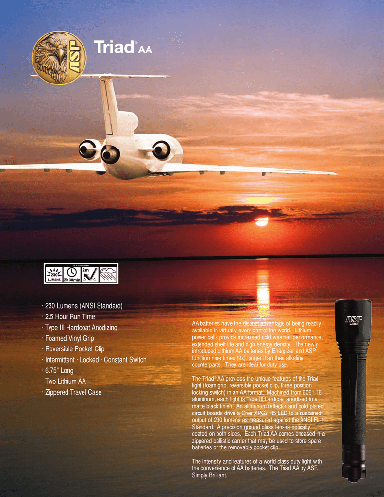 Triad AA ® · 230 Lumens (ANSI Standard) · 2.5 Hour Run Time · Type III Hardcoat Anodizing · Foamed Vinyl Grip · Reversible Pocket Clip · Intermittent · Locked · Constant Switch · 6.75" Long · Two Lithium AA · Zippered Travel Case AA batteries have the distinct advantage of being readily available in virtually every part of the world. Lithium power cells provide increased cold weather performance, extended shelf life and high energy density. The newly introduced Lithium AA batteries by Energizer and ASP function nine times (9x) longer than their alkaline counterparts. They are ideal for duty use. The Triad® AA provides the unique features of the Triad light (foam grip, reversible pocket clip, three position locking switch) in an AA format. Machined from 6061 T6 aluminum, each light is Type III hardcoat anodized in a matte black finish. An aluminum reflector and gold plated circuit boards drive a Cree XPG2 R5 LED to a sustained output of 230 lumens as measured against the ANSI FL-1 Standard. A precision ground glass lens is optically coated on both sides. Each Triad AA comes encased in a zippered ballistic carrier that may be used to store spare batteries or the removable pocket clip. The intensity and features of a world class duty light with the convenience of AA batteries. The Triad AA by ASP. Simply Brilliant. Triad AA . . . Simply Brilliant Lens Gasket Pocket Clip Machined Aluminum Parabolic Reflecting Chamber Battery Tube O-Ring Seal Computer Micro Switch Overmolded Activation Button Glass Lens Bezel High Output Cree XPG2 R5 LED Background Designed to professional law enforcement standards Aerospace aluminum construction Precision machined No sharp edges O-ring sealed for maximum water resistance Distinct profile Specifications Length Diameter Weight System Flashlight Output 6.75" 171.4 mm 1.4" 35.6 mm 6.1 ounces 172.4 grams (with batteries) 3 volt 230 lumens (ANSI Standard) Foamed Vinyl Grip Front Clip Groove Power Cells (recommended) Two 1.5 volt Lithium (AA) PTC protected Safety vent Ten year shelf life 2.5 hours continuous run time Leak proof Vibration resistant Link case Pocket Clip Detachable Three Position Rotary Sleeve Circuit Board Contact Reflector Assembly Parabolic Extremely durable Computer calculated ray traces Long distance penetrating beam Room illuminating halo Gasket sealed LED Assembly Proprietary heat management Custom driver Smart chip technology Gasket sealed Power Cell Tube Foamed vinyl grip O-ring sealed Body 6061 T6 high strength aluminum Matte black finish Type III hardcoat anodized Coated threads for durability Exterior and interior scratch and corrosion protection Foamed vinyl grip Front clip groove Rear clip groove Rear Clip Groove Locking Switch Back mounted Quick and positive switch location under stress O-ring sealed activation button Locked (center) Constant on/off switch activation (right) Intermittent switch activation (left) O-ring sealed switch cover PC board positive circuit contact Sensitive and quiet switch activation Computer micro switch controlled Self-cleaning (no carbon buildup) Fail safe (backup) switch circuits Replaceable modular switch assemblies Optional intermittent switch activation O-ring sealed connection to the light body Rotate one full turn to prevent accidental activation Belt Case Injection molded Accessory Case Ballistic Weave Zippered Warranty Limited Lifetime TLC Tactical Light Cases protect and securely retain the Triad.® Travel Cases provide protection for the Triad or accessories. SWITCH ACTIVATION • ° Intermittent Locked Constant ® “Simply Brilliant” Triad AA ASP, INC . Box 1794 . Appleton, WI 54912 . (920) 735-6242 . asp-usa.com © 2011 ASP