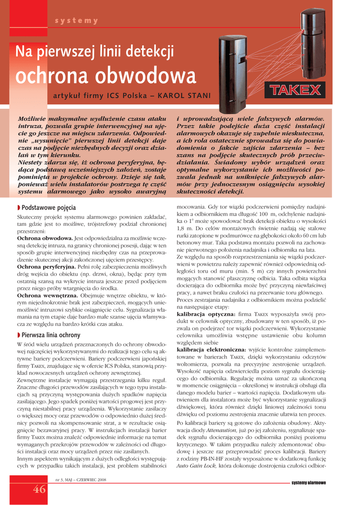 systemy Na pierwszej linii detekcji ochrona obwodowa artykuł firmy ICS Polska – KAROL STANI Możliwie maksymalne wydłużenie czasu ataku intruza, pozwala grupie interwencyjnej na ujęcie go jeszcze na miejscu zdarzenia. Odpowiednie „wysunięcie” pierwszej linii detekcji daje czas na podjęcie niezbędnych decyzji oraz działań w tym kierunku. Niestety zdarza się, iż ochrona peryferyjna, będąca podstawą wcześniejszych założeń, zostaje pominięta w projekcie ochrony. Dzieje się tak, ponieważ wielu instalatorów postrzega tę część systemu alarmowego jako wysoko awaryjną i wprowadzającą wiele fałszywych alarmów. Przez takie podejście duża część instalacji alarmowych okazuje się zupełnie nieskuteczna, a ich rola ostatecznie sprowadza się do powiadomienia o fakcie zajścia zdarzenia – bez szans na podjęcie skutecznych prób przeciwdziałania. Świadomy wybór urządzeń oraz optymalne wykorzystanie ich możliwości pozwala jednak na uniknięcie fałszywych alarmów przy jednoczesnym osiągnięciu wysokiej skuteczności detekcji. w Podstawowe pojęcia mocowania. Gdy tor wiązki podczerwieni pomiędzy nadajnikiem a odbiornikiem ma długość 100 m, odchylenie nadajnika o 1° może spowodować brak detekcji obiektu o wysokości 1,8 m. Do celów montażowych świetnie nadają się stalowe rurki zatopione w podmurówce na głębokości około 60 cm lub betonowy mur. Taka podstawa montażu pozwoli na zachowanie pierwotnego położenia nadajnika i odbiornika na lata. Ze względu na sposób rozprzestrzeniania się wiązki podczerwieni w powietrzu należy zapewnić również odpowiednią odległości toru od muru (min. 5 m) czy innych powierzchni mogących stanowić płaszczyznę odbicia. Taka odbita wiązka docierająca do odbiornika może być przyczyną niewłaściwej pracy, a nawet braku czułości na przerwanie toru głównego. Proces zestrajania nadajnika z odbiornikiem można podzielić na następujące etapy: kalibracja optyczna: firma TAKEX wyposażyła swój produkt w celownik optyczny, zbudowany w ten sposób, iż pozwala on podejrzeć tor wiązki podczerwieni. Wykorzystanie celownika umożliwia wstępne ustawienie obu kolumn względem siebie kalibracja elektroniczna: wyjście kontrolne zaimplementowane w barierach TAKEX, dzięki wykorzystaniu odczytów woltomierza, pozwala na precyzyjne zestrojenie urządzeń. Wysokość napięcia odzwierciedla poziom sygnału docierającego do odbiornika. Regulację można uznać za ukończoną w momencie osiągnięcia – określonej w instrukcji obsługi dla danego modelu barier – wartości napięcia. Dodatkowym ułatwieniem dla instalatora może być wykorzystanie sygnalizacji dźwiękowej, która również dzięki liniowej zależności tonu dźwięku od poziomu zestrojenia znacznie ułatwia ten proces. Skuteczny projekt systemu alarmowego powinien zakładać, tam gdzie jest to możliwe, trójstrefowy podział chronionej przestrzeni: Ochrona obwodowa. Jest odpowiedzialna za możliwie wczesną detekcję intruza, na granicy chronionej posesji, dając w ten sposób grupie interwencyjnej niezbędny czas na przeprowadzenie skutecznej akcji zakończonej ujęciem przestępcy. Ochrona peryferyjna. Pełni rolę zabezpieczenia możliwych dróg wejścia do obiektu (np. drzwi, okna), będąc przy tym ostatnią szansą na wykrycie intruza jeszcze przed podjęciem przez niego próby wtargnięcia do środka. Ochrona wewnętrzna. Obejmuje wnętrze obiektu, w którym niejednokrotnie brak jest zabezpieczeń, mogących uniemożliwić intruzowi szybkie osiągnięcie celu. Sygnalizacja włamania na tym etapie daje bardzo małe szanse ujęcia włamywacza ze względu na bardzo krótki czas ataku. w Pierwsza linia ochrony W śród wielu urządzeń przeznaczonych do ochrony obwodowej najczęściej wykorzystywanymi do realizacji tego celu są aktywne bariery podczerwieni. Bariery podczerwieni japońskiej firmy TAKEX, znajdujące się w ofercie ICS Polska, stanowią przykład nowoczesnych urządzeń ochrony zewnętrznej. Zewnętrzne instalacje wymagają przestrzegania kilku reguł. Znaczne długości przewodów zasilających w tego typu instalacjach są przyczyną występowania dużych spadków napięcia zasilającego. Jego spadek poniżej wartości progowej jest przyczyną niestabilnej pracy urządzenia. Wykorzystanie zasilaczy o większej mocy oraz przewodów o odpowiednio dużej średnicy pozwoli na skompensowanie strat, a w rezultacie osiągnięcie bezawaryjnej pracy. W instrukcjach instalacji barier firmy TAKEX można znaleźć odpowiednie informacje na temat wymaganych przekrojów przewodów w zależności od długości instalacji oraz mocy urządzeń przez nie zasilanych. Innym aspektem wynikającym z dużych odległości występujących w przypadku takich instalacji, jest problem stabilności nr 3, MAJ – CZERWIEC 2008 46 Po kalibracji bariery są gotowe do założenia obudowy. Aktywacja diody Attenaution, już po jej założeniu, sygnalizuje spadek sygnału docierającego do odbiornika poniżej poziomu krytycznego. W takim przypadku należy zdemontować obudowę i jeszcze raz przeprowadzić proces kalibracji. Bariery z rodziny PB-IN-HF zostały wyposażone w dodatkową funkcję Auto Gain Lock, która dokonuje dostrojenia czułości odbior- Rys. 1. Możliwe konfiguracje zestawienia barier na celu zwiększenie bezawaryjności również mają duże znaczenie. Bardzo częstą przyczyną występowania fałszywych alarmów w instalacjach zewnętrznych barier podczerwieni są powszechnie występujące naturalne źródła fal z tego zakresu. Firma TAKEX wykorzystuje opatentowaną technologię podwójnej modulacji częstotliwości wiązki. Dzięki wykorzystaniu w transmisji tzw. fali nośnej o wielkiej częstotliwości (w.cz.) sygnał zostaje przesłany w pasmie, którego naturalne emitery w przyrodzie nie istnieją. Wpływ obcego źródła promieniowania podczerwonego w takim przypadku jest zerowy, a co za tym idzie odporność tych bar