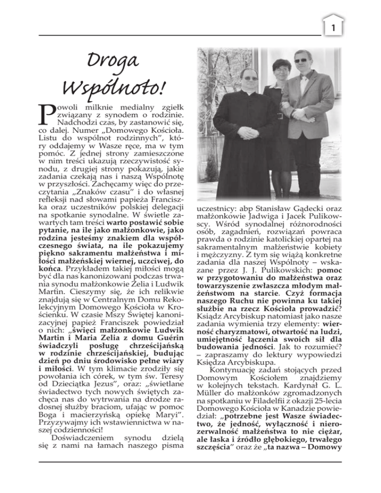 1 P Droga Wspólnoto! owoli milknie medialny zgiełk związany z synodem o rodzinie. Nadchodzi czas, by zastanowić się, co dalej. Numer „Domowego Kościoła. Listu do wspólnot rodzinnych”, który oddajemy w Wasze ręce, ma w tym pomóc. Z jednej strony zamieszczone w nim treści ukazują rzeczywistość synodu, z drugiej strony pokazują, jakie zadania czekają nas i naszą Wspólnotę w przyszłości. Zachęcamy więc do przeczytania „Znaków czasu” i do własnej refleksji nad słowami papieża Franciszka oraz uczestników polskiej delegacji na spotkanie synodalne. W świetle zawartych tam treści warto postawić sobie pytanie, na ile jako małżonkowie, jako rodzina jesteśmy znakiem dla współczesnego świata, na ile pokazujemy piękno sakramentu małżeństwa i miłości małżeńskiej wiernej, uczciwej, do końca. Przykładem takiej miłości mogą być dla nas kanonizowani podczas trwania synodu małżonkowie Zelia i Ludwik Martin. Cieszymy się, że ich relikwie znajdują się w Centralnym Domu Rekolekcyjnym Domowego Kościoła w Krościenku. W czasie Mszy Świętej kanonizacyjnej papież Franciszek powiedział o nich: „święci małżonkowie Ludwik Martin i Maria Zelia z domu Guérin świadczyli posługę chrześcijańską w rodzinie chrześcijańskiej, budując dzień po dniu środowisko pełne wiary i miłości. W tym klimacie zrodziły się powołania ich córek, w tym św. Teresy od Dzieciątka Jezus”, oraz: „świetlane świadectwo tych nowych świętych zachęca nas do wytrwania na drodze radosnej służby braciom, ufając w pomoc Boga i macierzyńską opiekę Maryi”. Przyzywajmy ich wstawiennictwa w naszej codzienności! Doświadczeniem synodu dzielą się z nami na łamach naszego pisma uczestnicy: abp Stanisław Gądecki oraz małżonkowie Jadwiga i Jacek Pulikowscy. Wśród synodalnej różnorodności osób, zagadnień, rozwiązań powraca prawda o rodzinie katolickiej opartej na sakramentalnym małżeństwie kobiety i mężczyzny. Z tym się wiążą konkretne zadania dla naszej Wspólnoty – wskazane przez J. J. Pulikowskich: pomoc w przygotowaniu do małżeństwa oraz towarzyszenie zwłaszcza młodym małżeństwom na starcie. Czyż formacja naszego Ruchu nie powinna ku takiej służbie na rzecz Kościoła prowadzić? Ksiądz Arcybiskup natomiast jako nasze zadania wymienia trzy elementy: wierność charyzmatowi, otwartość na ludzi, umiejętność łączenia swoich sił dla budowania jedności. Jak to rozumieć? – zapraszamy do lektury wypowiedzi Księdza Arcybiskupa. Kontynuację zadań stojących przed Domowym Kościołem znajdziemy w kolejnych tekstach. Kardynał G. L. Müller do małżonków zgromadzonych na spotkaniu w Filadelfii z okazji 25-lecia Domowego Kościoła w Kanadzie powiedział: „potrzebne jest Wasze świadectwo, że jedność, wyłączność i nierozerwalność małżeństwa to nie ciężar, ale łaska i źródło głębokiego, trwałego szczęścia” oraz że „ta nazwa – Domowy 2 Kościół – jest równocześnie wielkim zobowiązaniem i konkretnym programem”. O tym, co jeszcze wydarzyło się na dalekim kontynencie amerykańskim, dowiemy się z tekstu Agnieszki i Tomasza Talagów, uczestników Światowego Spotkania Rodzin oraz małżonków prowadzących sesję o pilotowaniu kręgów. Biskup Andrzej Czaja podczas podsumowania pracy formacyjnej Domowego Kościoła na Górze Św. Anny wskazał, że „trzeba solidnej pracy u podstaw. I na kogo liczyć, jak nie na wspólnoty i ruchy kościelne? Do kogo się zwrócić, jak nie do tak licznych kręgów Domowego Kościoła?”. Jak temu wszystkiemu zaradzić? Od czego zacząć? Odpowiedź znajdujemy w naszej formacji – w rzetelnym wypełnianiu zobowiązań oraz w solidnym przygotowywaniu się do miesięcznych spotkań w kręgu. W tym roku w szczególny sposób przyzywamy Ducha Świętego, odkrywamy Jego dary i prosimy o nie. Wykorzystajmy więc jak najlepiej ten czas, by zobaczyć, do jakich zadań w Kościele wzywa mnie/nas Pan Bóg! Przed nami też Rok Święty – Nadzwyczajny Jubileusz Miłosierdzia, rozpoczynający się 8 grudnia, w święto patronalne naszego Ruchu. Niech Maryja, Matka Miłosierdzia, wyprasza nam potrzebne łaski, byśmy potrafili służyć miłosierdziem tym, których Pan Bóg stawia na naszej drodze. Niech w tym roku często w naszej modlitwie osobistej, małżeńskiej i rodzinnej towarzyszą słowa modlitwy przygotowanej specjalnie na ten czas: „Panie Jezu Chryste, Ty nauczyłeś nas, abyśmy byli miłosierni, jak Ojciec nasz niebieski i powiedziałeś nam, że kto widzi Ciebie, widzi także i Jego. Ukaż nam Twoje oblicze, a będziemy zbawieni. Twój wzrok pełen miłości uwolnił Zacheusza oraz Mateusza od niewoli pieniądza, a nierządnicę i Magdalenę od szukania szczęścia wyłącznie w rzeczach stworzonych. Wzrok ten sprawił, że Piotr zapłakał po zdradzie, a żałujący Dobry Łotr usłyszał zapewnienie o Raju. Pozwól nam tak wysłuchać słów, które wypowiedziałeś do Samarytanki, jakbyś je wypowiedział do każdego nas: O, gdybyś znała dar Boży! Ty, który jesteś Obliczem widzialnym Ojca niewidzialnego, Boga, który objawia swoją wszechmoc przede wszystkim przez przebaczenie i miłosierdzie: spraw, aby Kościół na świecie stał się widzialnym obliczem Ciebie, swojego Pana zmartwychwstałego i uwielbionego. Ty zechciałeś również, aby Twoi słudzy przybrani byli w słabość po to, aby mogli okazywać słuszne współczucie tym, którzy trwają w niewiedzy i błędzie: niech każda osoba, która się do nich zwraca, czuje się oczekiwana, kochana oraz doświadcza przebaczenia od Boga. Poślij Twojego Ducha i uświęć wszystkich nas Jego namaszczeniem, aby Jubileusz Miłosierdzia był rokiem łaski od Pana, a Twój Kościół z odnowionym entuzjazmem mógł nieść dobrą nowinę ubogim, głosić wolność więźniom i uciśnionym oraz przywracać wzrok niewidomym. Prosimy o to za wstawiennictwem Maryi, Matki 