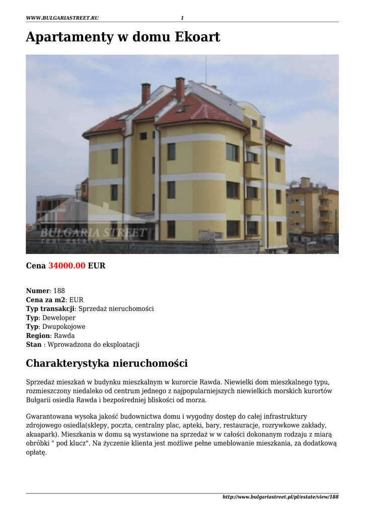 WWW.BULGARIASTREET.RU 1 Apartamenty w domu Ekoart Cena 34000.00 EUR Numer: 188 Cena za m2: EUR Typ transakcji: Sprzedaż nieruchomości Typ: Deweloper Typ: Dwupokojowe Region: Rawda Stan : Wprowadzona do eksploatacji Charakterystyka nieruchomości Sprzedaż mieszkań w budynku mieszkalnym w kurorcie Rawda. Niewielki dom mieszkalnego typu, rozmieszczony niedaleko od centrum jednego z najpopularniejszych niewielkich morskich kurortów Bułgarii osiedla Rawda i bezpośredniej bliskości od morza. Gwarantowana wysoka jakość budownictwa domu i wygodny dostęp do całej infrastruktury zdrojowego osiedla(sklepy, poczta, centralny plac, apteki, bary, restauracje, rozrywkowe zakłady, akuapark). Mieszkania w domu są wystawione na sprzedaż w w całości dokonanym rodzaju z miarą obróbki " pod klucz". Na życzenie klienta jest możliwe pełne umeblowanie mieszkania, za dodatkową opłatę. http://www.bulgariastreet.pl/pl/estate/view/188 WWW.BULGARIASTREET.RU 2 Infrastruktura ● ● ● ● ● Bankomat Supermarket Sklep Internet Telewizja kablowa Informacje o regionie Przedtem Rawda była międzynarodowym centrum dziecięcego turyzmu i odpoczynku. Przez ostatnie lata Rawda przekształcił się na współczesny wielofunkcyjny morski kurort, który stał się niezwykle popularnym u cudzoziemskich turystów, w tej liczbie u Rosjan. Wiele osób wybierają Rawda dla spokojnego rodzinnego odpoczynku, w tej liczbie z dziećmi. Malownicze bułgarskie osiedle Rawda jest rozmieszczone na południowym czarnomorskim nadbrzeżu Bułgarii w półtora kilometrach od prastarego miasta Nesebar. Popularny bułgarski kurort Słoneczny brzeg znajduje się zaledwie 5 km, a międzynarodowy port lotniczy m. Burgas - do 30 km Klimat Miękki śródziemnomorski klimat z dużą ilością słonecznych godzin(2 200 - 2 300) korzystnie wyróżniają Rawdе od innych kurortów. Temperatura latem waha się od 20 do 30 stopni Celsjusza, a wody - 20-26 stopni Celsjusza. Plaże Świeże powietrze i przezroczysta czysta morska woda - wizytówka Rawdy. Plaże Rawda - wygodne i bezpieczne z drobnym złocistym piaskiem. Są najbardziej znane dwie plaże - Południowa i druga, która jest rozmieszczona między przylądkiem Rawdy i przylądkiem Akrotiria. Tu są wszystkie atrybuty dla komfortowego plażowego odpoczynku - szezlongi, parasole, kawiarnie, fachowa ochrona i animatorzy. Infrastruktura Mimo to, że Rawda jest osiedlem, infrastruktura jest opracowana i jest całe potrzebne nie tylko dla odpoczynku, ale i dla całorocznego pobytu. W Rawdzie stale mieszka miejscowa ludność. W osiedlu funkcjonują następne obiekty: municypalne i prywatne dziecięce sadki, szkoła, poczta, filie banków, supermarket, sklepy, warzywne sklepy, medyczne centrum, apteki i sportowy kompleks z trenażerem salą. Dla amatorów śródziemnomorskiej i internacjonalnej kuchni w Rawdzie są 10 wytwornych restauracji, a smakoszy, co oddaje przewagę bułgarskiej kuchni, ucieszy całe dziesięć knajp. Liczne kawiarnie i bistro, rozmieszczone po całym osiedlu, zaproponują dostatek zakąsek i deserów. http://www.bulgariastreet.pl/pl/estate/view/188 WWW.BULGARIASTREET.RU 3 Kontakty Agencja "Ulica Bułgarska" (Bulgaria Street Ltd) Bułgaria m. Burgas, 8000 ul. Mitropolit Simeon 3 Strona: www.bulgariastreet.ru Tel: + 359 894 51 50 51 Tel: + 48 223 906 334 Mail: [email protected] Mail: [email protected] Skype: bulstreet http://www.bulgariastreet.pl/pl/estate/view/188