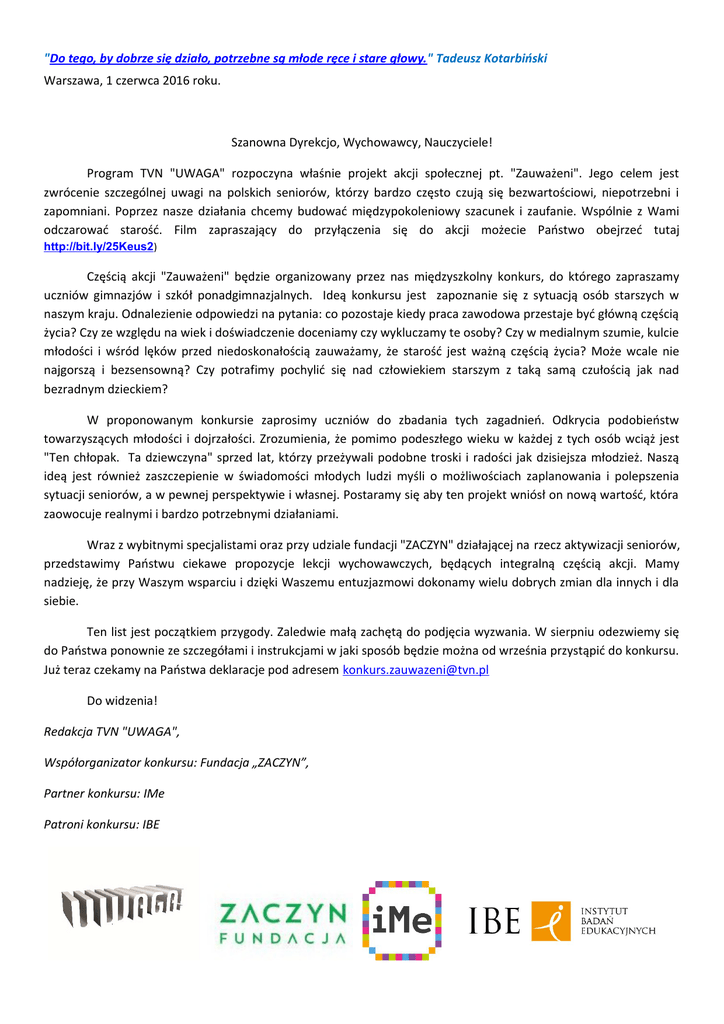 "Do tego, by dobrze się działo, potrzebne są młode ręce i stare głowy." Tadeusz Kotarbiński Warszawa, 1 czerwca 2016 roku. Szanowna Dyrekcjo, Wychowawcy, Nauczyciele! Program TVN "UWAGA" rozpoczyna właśnie projekt akcji społecznej pt. "Zauważeni". Jego celem jest zwrócenie szczególnej uwagi na polskich seniorów, którzy bardzo często czują się bezwartościowi, niepotrzebni i zapomniani. Poprzez nasze działania chcemy budować międzypokoleniowy szacunek i zaufanie. Wspólnie z Wami odczarować starość. Film zapraszający do przyłączenia się do akcji możecie Państwo obejrzeć tutaj http://bit.ly/25Keus2) Częścią akcji "Zauważeni" będzie organizowany przez nas międzyszkolny konkurs, do którego zapraszamy uczniów gimnazjów i szkół ponadgimnazjalnych. Ideą konkursu jest zapoznanie się z sytuacją osób starszych w naszym kraju. Odnalezienie odpowiedzi na pytania: co pozostaje kiedy praca zawodowa przestaje być główną częścią życia? Czy ze względu na wiek i doświadczenie doceniamy czy wykluczamy te osoby? Czy w medialnym szumie, kulcie młodości i wśród lęków przed niedoskonałością zauważamy, że starość jest ważną częścią życia? Może wcale nie najgorszą i bezsensowną? Czy potrafimy pochylić się nad człowiekiem starszym z taką samą czułością jak nad bezradnym dzieckiem? W proponowanym konkursie zaprosimy uczniów do zbadania tych zagadnień. Odkrycia podobieństw towarzyszących młodości i dojrzałości. Zrozumienia, że pomimo podeszłego wieku w każdej z tych osób wciąż jest "Ten chłopak. Ta dziewczyna" sprzed lat, którzy przeżywali podobne troski i radości jak dzisiejsza młodzież. Naszą ideą jest również zaszczepienie w świadomości młodych ludzi myśli o możliwościach zaplanowania i polepszenia sytuacji seniorów, a w pewnej perspektywie i własnej. Postaramy się aby ten projekt wniósł on nową wartość, która zaowocuje realnymi i bardzo potrzebnymi działaniami. Wraz z wybitnymi specjalistami oraz przy udziale fundacji "ZACZYN" działającej na rzecz aktywizacji seniorów, przedstawimy Państwu ciekawe propozycje lekcji wychowawczych, będących integralną częścią akcji. Mamy nadzieję, że przy Waszym wsparciu i dzięki Waszemu entuzjazmowi dokonamy wielu dobrych zmian dla innych i dla siebie. Ten list jest początkiem przygody. Zaledwie małą zachętą do podjęcia wyzwania. W sierpniu odezwiemy się do Państwa ponownie ze szczegółami i instrukcjami w jaki sposób będzie można od września przystąpić do konkursu. Już teraz czekamy na Państwa deklaracje pod adresem [email protected] Do widzenia! Redakcja TVN "UWAGA", Współorganizator konkursu: Fundacja „ZACZYN”, Partner konkursu: IMe Patroni konkursu: IBE