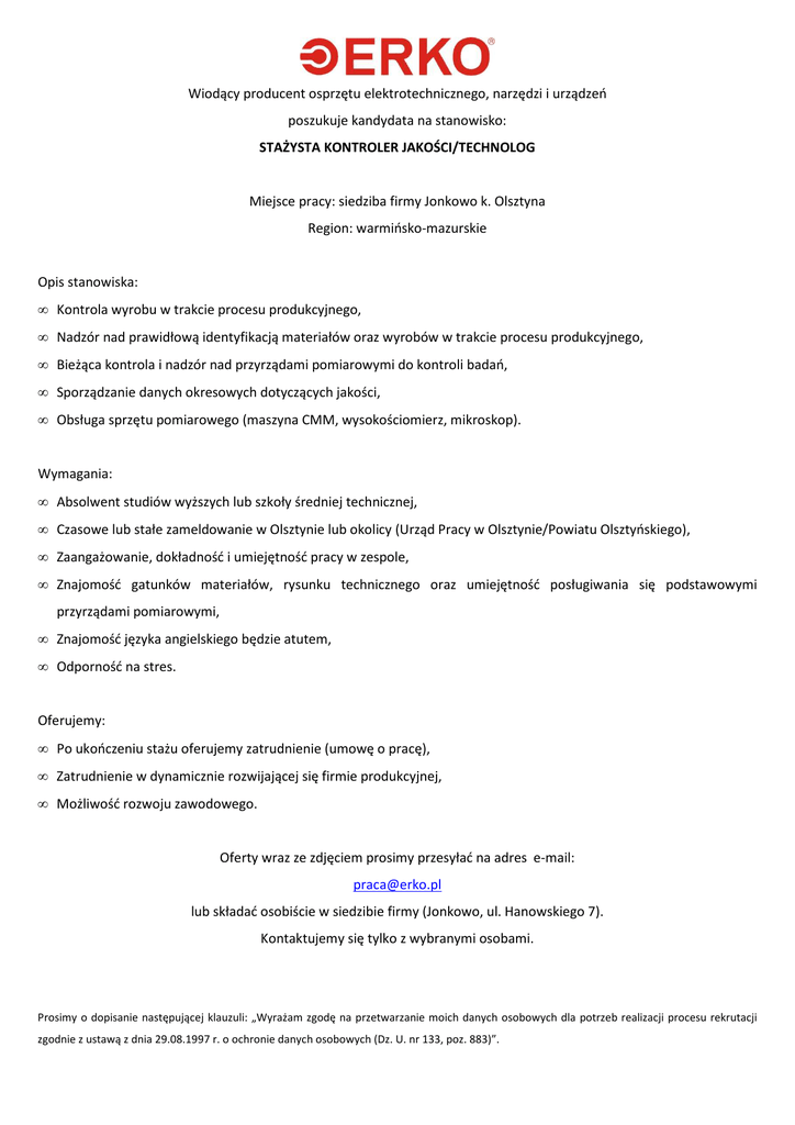Wiodący producent osprzętu elektrotechnicznego, narzędzi i urządzeń poszukuje kandydata na stanowisko: STAŻYSTA KONTROLER JAKOŚCI/TECHNOLOG Miejsce pracy: siedziba firmy Jonkowo k. Olsztyna Region: warmińsko-mazurskie Opis stanowiska: • Kontrola wyrobu w trakcie procesu produkcyjnego, • Nadzór nad prawidłową identyfikacją materiałów oraz wyrobów w trakcie procesu produkcyjnego, • Bieżąca kontrola i nadzór nad przyrządami pomiarowymi do kontroli badań, • Sporządzanie danych okresowych dotyczących jakości, • Obsługa sprzętu pomiarowego (maszyna CMM, wysokościomierz, mikroskop). Wymagania: • Absolwent studiów wyższych lub szkoły średniej technicznej, • Czasowe lub stałe zameldowanie w Olsztynie lub okolicy (Urząd Pracy w Olsztynie/Powiatu Olsztyńskiego), • Zaangażowanie, dokładność i umiejętność pracy w zespole, • Znajomość gatunków materiałów, rysunku technicznego oraz umiejętność posługiwania się podstawowymi przyrządami pomiarowymi, • Znajomość języka angielskiego będzie atutem, • Odporność na stres. Oferujemy: • Po ukończeniu stażu oferujemy zatrudnienie (umowę o pracę), • Zatrudnienie w dynamicznie rozwijającej się firmie produkcyjnej, • Możliwość rozwoju zawodowego. Oferty wraz ze zdjęciem prosimy przesyłać na adres e-mail: [email protected] lub składać osobiście w siedzibie firmy (Jonkowo, ul. Hanowskiego 7). Kontaktujemy się tylko z wybranymi osobami. Prosimy o dopisanie następującej klauzuli: „Wyrażam zgodę na przetwarzanie moich danych osobowych dla potrzeb realizacji procesu rekrutacji zgodnie z ustawą z dnia 29.08.1997 r. o ochronie danych osobowych (Dz. U. nr 133, poz. 883)”.