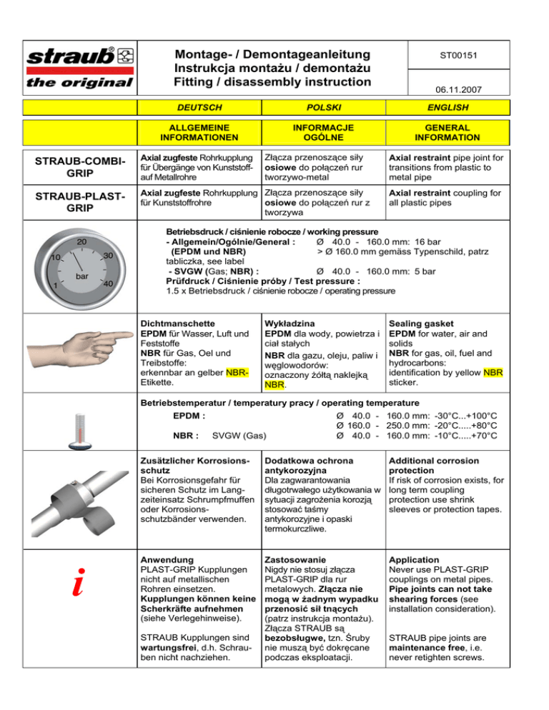 Montage- / Demontageanleitung Instrukcja montażu / demontażu Fitting / disassembly instruction ST00151 06.11.2007 DEUTSCH POLSKI ENGLISH ALLGEMEINE INFORMATIONEN INFORMACJE OGÓLNE GENERAL INFORMATION Złącza przenoszące siły osiowe do połączeń rur tworzywo-metal STRAUB-COMBIGRIP Axial zugfeste Rohrkupplung für Übergänge von Kunststoffauf Metallrohre STRAUB-PLASTGRIP Axial zugfeste Rohrkupplung Złącza przenoszące siły für Kunststoffrohre osiowe do połączeń rur z tworzywa Axial restraint pipe joint for transitions from plastic to metal pipe Axial restraint coupling for all plastic pipes Betriebsdruck / ciśnienie robocze / working pressure - Allgemein/Ogólnie/General : Ø 40.0 - 160.0 mm: 16 bar (EPDM und NBR) > Ø 160.0 mm gemäss Typenschild, patrz tabliczka, see label - SVGW (Gas; NBR) : Ø 40.0 - 160.0 mm: 5 bar Prüfdruck / Ciśnienie próby / Test pressure : 1.5 x Betriebsdruck / ciśnienie robocze / operating pressure Dichtmanschette EPDM für Wasser, Luft und Feststoffe NBR für Gas, Oel und Treibstoffe: erkennbar an gelber NBREtikette. Wykładzina EPDM dla wody, powietrza i ciał stałych NBR dla gazu, oleju, paliw i węglowodorów: oznaczony żółtą naklejką NBR. Sealing gasket EPDM for water, air and solids NBR for gas, oil, fuel and hydrocarbons: identification by yellow NBR sticker. Betriebstemperatur / temperatury pracy / operating temperature EPDM : NBR : i SVGW (Gas) Ø 40.0 - 160.0 mm: -30°C...+100°C Ø 160.0 - 250.0 mm: -20°C.....+80°C Ø 40.0 - 160.0 mm: -10°C.....+70°C Zusätzlicher Korrosionsschutz Bei Korrosionsgefahr für sicheren Schutz im Langzeiteinsatz Schrumpfmuffen oder Korrosionsschutzbänder verwenden. Dodatkowa ochrona antykorozyjna Dla zagwarantowania długotrwałego użytkowania w sytuacji zagrożenia korozją stosować taśmy antykorozyjne i opaski termokurczliwe. Additional corrosion protection If risk of corrosion exists, for long term coupling protection use shrink sleeves or protection tapes. Anwendung PLAST-GRIP Kupplungen nicht auf metallischen Rohren einsetzen. Kupplungen können keine Scherkräfte aufnehmen (siehe Verlegehinweise). Zastosowanie Nigdy nie stosuj złącza PLAST-GRIP dla rur metalowych. Złącza nie mogą w żadnym wypadku przenosić sił tnących (patrz instrukcja montażu). Złącza STRAUB są bezobsługwe, tzn. Śruby nie muszą być dokręcane podczas eksploatacji. Application Never use PLAST-GRIP couplings on metal pipes. Pipe joints can not take shearing forces (see installation consideration). STRAUB Kupplungen sind wartungsfrei, d.h. Schrauben nicht nachziehen. STRAUB pipe joints are maintenance free, i.e. never retighten screws. Montageanleitung Instrukcja montażu Fitting instruction A n o p ST00151 06.11.07 VORBEREITUNG PRZYGOTOWANIE PREPARATION Rohrenden entgraten und Oberfläche von Farbe und Beschichtung reinigen. Keine Schmutzpartikel unter den Dichtlippen. Usunąć zadziory na zakończeniach. Oczyścić powierzchnię rur z „luźnych” powłok zewnętrznych (farby itp.) Niedopuszczalne jest występowanie brudu pod wargami uszczelnienia. De-burr and remove sharp edges from pipe ends. Clean the pipe surface from impurities (bad coating). No dirt under sealing lips. Halbe Kupplungsbreite auf beiden Rohrenden markieren und bei Rohren aus Weich-Thermoplasten STRAUB Stützring einsetzen. Stützringe im Zusammenhang mit allen mech. Reinigungssystemen (Molche, Lanze usw.) nicht geeignet. Zaznacz pół szerokości złącza na obu końcach łączonych rur. Dla rur wykonanych z miękkich materiałów termoplastycznych użyj usztywniających pierścieni wewnętrznych STRAUB-PG. Nie stosować czyszczenia mechanicznego na instalacjach z pierścieniami wewnętrznymi. Mark half-width of pipe joint on both pipe ends as fitting guide. For pipes made of soft-thermoplastic materials use STRAUB-PG stiffening rings. Do not use mechanical cleaning systems (pigs, lances etc.) on pipe systems with stiffening rings. Kupplung aufschieben. Die Kupplung nicht zerlegen. Kupplung nicht fallenlassen. Nasuń złącze na końce rur. Fit the pipe joint over the pipe end. Do not dismantle the pipe joint. Do not drop the pipe joint. Nie demontować złącza. Nie upuszczać złącza. B q © by STRAUB AUSRICHTEN DER ROHRE PARAMETRU RUR PIPE ALIGNMENT Rohrendenabstand R Odległość między rurami R Distance between pipe ends R Rohr-AD Tube AD Pipe AD Ø (mm) ohne Bandeinlage bez wkładki without strip insert Rmax. (mm) mit Bandeinlage z wkładką with strip insert 38.0 (40) - 48.3 (50) 5 10 60.3 (63) - 114.3 (114.3) 10 25 139.7 (125) - 256.0 (250.0) 15 35 STRAUB WERKE AG • CH-7323 Wangs/Switzerland • Tel. + 41/81/725 41 00 • Fax + 41/81/725 41 01 • www.straub.ch • [email protected] Bandeinlagen einsetzen bei: grossen Rohrendenabständen (Pkt. q) Gummi-Quellung Vacuum äusserem Überdruck Bandeinlagen sind Sonderzubehör und müssen separat bestellt werden. (Werk anfragen) r s t Strip inserts are used in case of: large distance between pipe ends (point q) swelling due to agressive liquids vacuum under outside pressure Strip inserts are extras and must be ordered seperately. (Contact factory) Achsversatz 1 % vom Rohraussendurchmesser (max. 3 mm). Grösseren Achsversatz in Auswinkelung abändern (Kardan). Przesunięcie osiowe 1 % średnicy zewnętrznej (max. 3 mm). Większe przesunięcia muszą być zamienione na przesunięcia kątowe (kardan). Linear misalignment 1 % of outer diameter (max. 3 mm) is admissible. Larger misalignment must be rectified into angular deflection (cardan). Auswinkelung α Odchylenie kątowe α Angular deflection α bis Ø 60.3 mm ⇒ 5° ab Ø 76.1 mm ⇒ 4° ab Ø 225.0 mm ⇒ 2° Rohrendenabstand R Punkt q berücksichtigen. do Ø 60.3 mm ⇒ 5° od Ø 76.1 mm ⇒ 4° od Ø 225.0 mm ⇒ 2° Odległości między rurami R patrz punkt q up to Ø 160.0 mm ⇒ 5° Ø from 76.1 mm ⇒ 4° Ø Ø from 225.0 mm⇒ 2° Distance between pipe ends R see point q Aussendurchmesserdifferenzen bis Ø 100 m