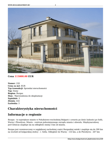 WWW.BULGARIASTREET.RU 1 Cena 115000.00 EUR Numer: 220 Cena za m2: EUR Typ transakcji: Sprzedaż nieruchomości Typ: Domy Region: Burgas Stan : Wprowadzona do eksploatacji Sypialnie: 3 Ziemia: 432 Łazienka: 3 Charakterystyka nieruchomości Informacje o regionie Burgas - to największe miasto w Południowo-wschodniej Bułgarii i czwarty po ilości ludności po Sofii, Warny i Plowdywa. Miasto - centrum jednoimiennego zarządu miasta i obwodu. Międzynarodowy port lotniczy znajduje się na odległości mniej 5 km od miasta. Burgas jest rozmieszczony w najgłębszej zachodniej części Burgaskiej zatoki i znajduje się do 390 km na wschód od bułgarskiej stolicy - r. Sofia. Odległość do Warny - 133 km, a do Plowdywu - 267 km http://www.bulgariastreet.pl/pl/estate/view/220 WWW.BULGARIASTREET.RU 2 Klimat Klimat w Burgasie jest subtropikalny i wilgotny. Temperatura powietrza latem składa 22,7 stopniów Celsjusza, a w zimie temperatura 2,1 stopni Celsjusza. Infrastruktura Miasto Burgas ma opracowaną infrastrukturę europejskiego poziomu. Po pierwsze, miasto jest dużym kolejowym centrum i morskim portem. Tu znajdują się kilka dworców autobusowych i międzynarodowego portu lotniczego. Aktywnie rozwija się spożywczy, elektronowy przemysł, budowa maszyn i do obróbki metali. Gospodarka rolna, leśny przemysł, budownictwo i turyzm najważniejsze branże, co przynosi stabilny dochód i miejsca pracy. Miasto ma w rozporządzeniu doskonałą infrastrukturę, konieczną dla stałego pobytu : sadki, szkoły, sklepy, rynki, polikliniki, apteki, banki, restauracje, kawiarnie, bary, bistro, duża ilość parkowych i stref odpoczynku. Słynny Nadmorski park i pobliska plaża jest zwłaszcza ulubiony mieszkańcami miasta i gośćmi miasta. http://www.bulgariastreet.pl/pl/estate/view/220 WWW.BULGARIASTREET.RU 3 http://www.bulgariastreet.pl/pl/estate/view/220 WWW.BULGARIASTREET.RU 4 http://www.bulgariastreet.pl/pl/estate/view/220 WWW.BULGARIASTREET.RU 5 Kontakty Agencja "Ulica Bułgarska" (Bulgaria Street Ltd) Bułgaria m. Burgas, 8000 ul. Mitropolit Simeon 3 Strona: www.bulgariastreet.ru Tel: + 359 894 51 50 51 Tel: + 48 223 906 334 Mail: [email protected] Mail: [email protected] Skype: bulstreet http://www.bulgariastreet.pl/pl/estate/view/220