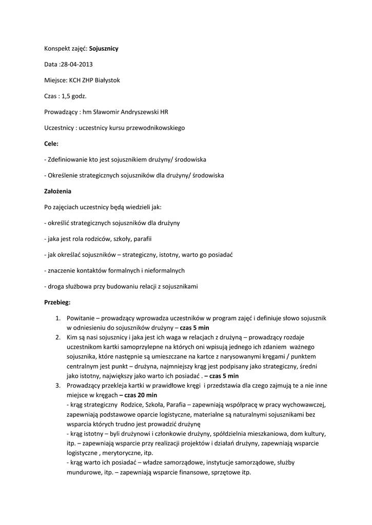 Konspekt zajęć: Sojusznicy Data :28-04-2013 Miejsce: KCH ZHP Białystok Czas : 1,5 godz. Prowadzący : hm Sławomir Andryszewski HR Uczestnicy : uczestnicy kursu przewodnikowskiego Cele: - Zdefiniowanie kto jest sojusznikiem drużyny/ środowiska - Określenie strategicznych sojuszników dla drużyny/ środowiska Założenia Po zajęciach uczestnicy będą wiedzieli jak: - określić strategicznych sojuszników dla drużyny - jaka jest rola rodziców, szkoły, parafii - jak określać sojuszników – strategiczny, istotny, warto go posiadać - znaczenie kontaktów formalnych i nieformalnych - droga służbowa przy budowaniu relacji z sojusznikami Przebieg: 1. Powitanie – prowadzący wprowadza uczestników w program zajęć i definiuje słowo sojusznik w odniesieniu do sojuszników drużyny – czas 5 min 2. Kim są nasi sojusznicy i jaka jest ich waga w relacjach z drużyną – prowadzący rozdaje uczestnikom kartki samoprzylepne na których oni wpisują jednego ich zdaniem ważnego sojusznika, które następnie są umieszczane na kartce z narysowanymi kręgami / punktem centralnym jest punkt – drużyna, najmniejszy krąg jest podpisany jako strategiczny, średni jako istotny, największy jako warto ich posiadać . – czas 5 min 3. Prowadzący przekleja kartki w prawidłowe kręgi i przedstawia dla czego zajmują te a nie inne miejsce w kręgach – czas 20 min - krąg strategiczny Rodzice, Szkoła, Parafia – zapewniają współpracę w pracy wychowawczej, zapewniają podstawowe oparcie logistyczne, materialne są naturalnymi sojusznikami bez wsparcia których trudno jest prowadzić drużynę - krąg istotny – byli drużynowi i członkowie drużyny, spółdzielnia mieszkaniowa, dom kultury, itp. – zapewniają wsparcie przy realizacji projektów i działań drużyny, zapewniają wsparcie logistyczne , merytoryczne, itp. - krąg warto ich posiadać – władze samorządowe, instytucje samorządowe, służby mundurowe, itp. – zapewniają wsparcie finansowe, sprzętowe itp. 4. Jak pracować z sojusznikami – ukazanie sprawdzonych przykładów z jakimi spotkali się kursanci w swojej pracy – swobodne wypowiedzi uczestników. Prowadzący zajęcia prosi o przedstawienie metod w jaki sposób obecnie kursanci pracują z sojusznikami - 10 min. 5. Jak pracować z sojusznikami - ukazanie metod pracy z sojusznikami – 20 min - rodzice – udział w życiu drużyny / dzień na obozie, wspólne święta, zapraszanie na przyrzeczenie i inne wspólne działania drużyny. Informacje meilowe z obozów, galerie zdjęć z obozu, wizyty w domu członków drużyny , itp. - szkoła – plan współpracy, wspólne imprezy, wsparcie wychowawcze, itp. - parafia – określenie zasad współpracy, uczestnictwo w życiu parafii, itp. - byli członkowie drużyny – jak i w czym mogą pomóc - dom kultury – określenie zasad współpracy, itp. - spółdzielnia mieszkaniowa – jw. - pozostali sojusznicy – z określeniem zakresu współpracy i zasad współpracy 6. My i nasi sojusznicy – analiza SWOT – omówienie mocnych i słabych stron współpracy z sojusznikami i przenikania się relacji sojuszników w kręgach - 15 min - prowadzący omawia mocne i słabe strony budowania relacji z sojusznikami – z racji na to że kursanci pochodzą z różnych środowisk analiza SWOT ma być wykonana indywidualnie przez uczestników kursu 7. O czym należy pamiętać przy relacjach z sojusznikami – kiedy z kontaktów nieformalnych należy przejść do kontaktów formalnych czyli kiedy należy włączyć hufiec – 10 min. - prowadzący opisuje zasady współpracy na przykładach pozyskania sprzętu, harcówki, itp. Czyli kiedy i jak należy wprowadzać pomoc jednostki organizacyjnej 8. Podsumowanie warsztatów – wyciągniecie wniosków przez kursantów – swobodna dyskusja - 5 min