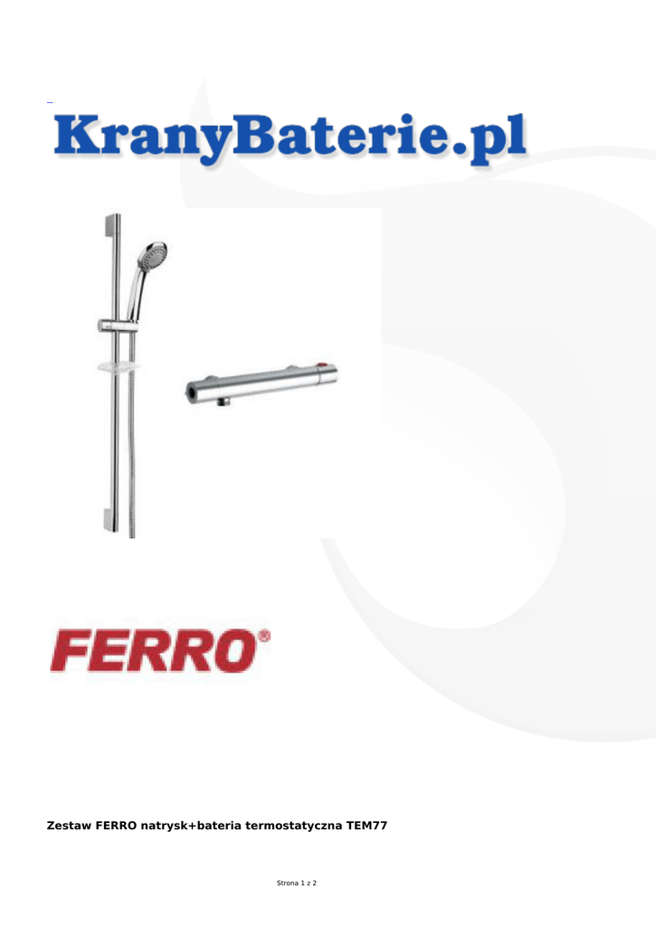 Zestaw FERRO natrysk+bateria termostatyczna TEM77 Strona 1 z 2 Bateria termostatyczna Ferro TERNI TEM7 regulator termostatyczny blokada gorącej wody Safe Stop 38°C montaż naścienny przyłącze mimośrodowe G1⁄2 rozstaw 150 ± 20 mm podłączenie natrysku G1⁄2 Natrysk przesuwny drążek metalowy przesuwny 800 mm rączka natrysku 3-funkcyjna strumienie: deszcz, masaż, mieszany średnica rączki natrysku 83 mm system easy clean wąż natryskowy 1500 mm w oplocie metalowym, końcówka węża stożkowa mydelniczka zestaw montażowy Strona 2 z 2