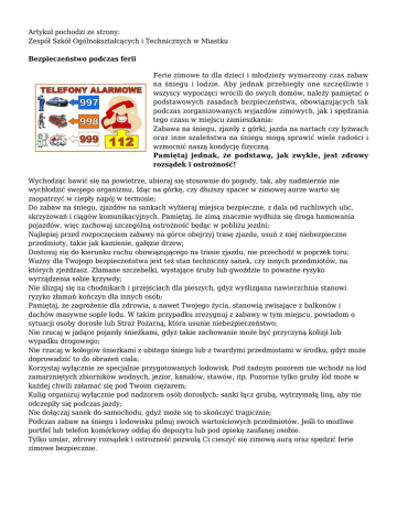 Artykuł pochodzi ze strony: Zespół Szkół Ogólnokształcących i Technicznych w Miastku Bezpieczeństwo podczas ferii Ferie zimowe to dla dzieci i młodzieży wymarzony czas zabaw na śniegu i lodzie. Aby jednak przebiegły one szczęśliwie i wszyscy wypoczęci wrócili do swych domów, należy pamiętać o podstawowych zasadach bezpieczeństwa, obowiązujących tak podczas zorganizowanych wyjazdów zimowych, jak i spędzania tego czasu w miejscu zamieszkania: Zabawa na śniegu, zjazdy z górki, jazda na nartach czy łyżwach oraz inne szaleństwa na śniegu mogą sprawić wiele radości i wzmocnić naszą kondycję fizyczną. Pamiętaj jednak, że podstawą, jak zwykle, jest zdrowy rozsądek i ostrożność! Wychodząc bawić się na powietrze, ubieraj się stosownie do pogody, tak, aby nadmiernie nie wychłodzić swojego organizmu. Idąc na górkę, czy dłuższy spacer w zimowej aurze warto się zaopatrzyć w ciepły napój w termosie; Do zabaw na śniegu, zjazdów na sankach wybieraj miejsca bezpieczne, z dala od ruchliwych ulic, skrzyżowań i ciągów komunikacyjnych. Pamiętaj, że zimą znacznie wydłuża się droga hamowania pojazdów, więc zachowaj szczególną ostrożność będąc w pobliżu jezdni; Najlepiej przed rozpoczęciem zabawy na górce obejrzyj trasę zjazdu, usuń z niej niebezpieczne przedmioty, takie jak kamienie, gałęzie drzew; Dostosuj się do kierunku ruchu obowiązującego na trasie zjazdu, nie przechodź w poprzek toru; Ważny dla Twojego bezpieczeństwa jest też stan techniczny sanek, czy innych przedmiotów, na których zjeżdżasz. Złamane szczebelki, wystające śruby lub gwoździe to poważne ryzyko wyrządzenia sobie krzywdy; Nie ślizgaj się na chodnikach i przejściach dla pieszych, gdyż wyślizgana nawierzchnia stanowi ryzyko złamań kończyn dla innych osób; Pamiętaj, że zagrożenie dla zdrowia, a nawet Twojego życia, stanowią zwisające z balkonów i dachów masywne sople lodu. W takim przypadku zrezygnuj z zabawy w tym miejscu, powiadom o sytuacji osoby dorosłe lub Straż Pożarną, która usunie niebezpieczeństwo; Nie rzucaj w jadące pojazdy śnieżkami, gdyż takie zachowanie może być przyczyną kolizji lub wypadku drogowego; Nie rzucaj w kolegów śnieżkami z ubitego śniegu lub z twardymi przedmiotami w środku, gdyż może doprowadzić to do obrażeń ciała; Korzystaj wyłącznie ze specjalnie przygotowanych lodowisk. Pod żadnym pozorem nie wchodź na lód zamarzniętych zbiorników wodnych, jezior, kanałów, stawów, itp. Pozornie tylko gruby lód może w każdej chwili załamać się pod Twoim ciężarem; Kulig organizuj wyłącznie pod nadzorem osób dorosłych; sanki łącz grubą, wytrzymałą liną, aby nie odczepiły się podczas jazdy; Nie dołączaj sanek do samochodu, gdyż może się to skończyć tragicznie; Podczas zabaw na śniegu i lodowisku pilnuj swoich wartościowych przedmiotów. Jeśli to możliwe portfel lub telefon komórkowy oddaj do depozytu lub pod opiekę zaufanej osobie. Tylko umiar, zdrowy rozsądek i ostrożność pozwolą Ci cieszyć się zimową aurą oraz spędzić ferie zimowe bezpiecznie. opublikował: ZSOiT w Miastku data publikacji: 2015-01-28 17:39:49 data ostatniej aktualizacji: 2015-01-28 17:48:06