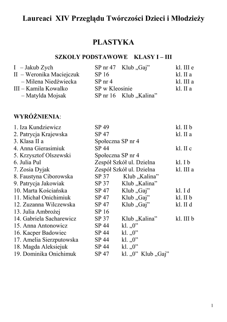 Laureaci XIV Przeglądu Twórczości Dzieci i Młodzieży PLASTYKA SZKOŁY PODSTAWOWE I – Jakub Zych II – Weronika Maciejczuk – Milena Niedźwiecka III – Kamila Kowalko – Matylda Mojsak KLASY I – III SP nr 47 Klub „Gaj” SP 16 SP nr 4 SP w Kleosinie SP nr 16 Klub „Kalina” kl. III e kl. II a kl. III a kl. II a SP 49 SP 47 Społeczna SP nr 4 SP 44 Społeczna SP nr 4 Zespół Szkół ul. Dzielna Zespół Szkół ul. Dzielna SP 37 Klub „Kalina” SP 37 Klub „Kalina” SP 47 Klub „Gaj” SP 47 Klub „Gaj” SP 47 Klub „Gaj” SP 16 SP 37 Klub „Kalina” SP 44 kl. „0” SP 44 kl. „0” SP 44 kl. „0” SP 44 kl. „0” SP 47 kl. „0” Klub „Gaj” kl. II b kl. II a WYRÓŻNIENIA: 1. Iza Kundziewicz 2. Patrycja Krajewska 3. Klasa II a 4. Anna Gierasimiuk 5. Krzysztof Olszewski 6. Julia Pul 7. Zosia Dyjak 8. Faustyna Ciborowska 9. Patrycja Jakowiak 10. Marta Kościańska 11. Michał Onichimiuk 12. Zuzanna Wilczewska 13. Julia Ambrożej 14. Gabriela Sacharewicz 15. Anna Antonowicz 16. Kacper Badowiec 17. Amelia Sierzputowska 18. Magda Aleksiejuk 19. Dominika Onichimuk kl. II c kl. I b kl. III a kl. I d kl. II b kl. II d kl. III b 1 PLASTYKA – SZKOŁY PODSTAWOWE KLASY IV – VI I – Adam Wojsiat II – Ada Zawadzka III – Natalia Słomińska – Wiktoria Jakubowska SP 47 SP 44 SP 47 SP 4 kl. V d SP nr 37 SP 21 SP 47 SP 4 SP 47 SP 47 SP 47 SP 47 SP 47 SP 4 SP 37 SP 47 SP 47 SP 4 kl. IV d kl. V kl. V c kl. IV kl. V e kl. V c kl. V d kl. V d kl. V e kl. V kl. IV d kl. VI d kl. V c kl. V kl. IV d kl. IV WYRÓŻNIENIA: 1. Dawid Wysocki 2. Weronika Busłowska 3. Gabriela Piekutowska 4. Wiktoria Jakubowska 5. Magdalena Tymińska 6. Kinga Babynko 7. Urszula Skuńczyk 8. Kinga Lewonowska 9. Monika Borówko 10. Natalia Sawicka 11. Maksymilian Cylwik 12. Wiktoria Słomińska 13. Patrycja Siebiatyńska 14. Ariana Sawicka Klub „Gaj” PLASTYKA – GIMNAZJA I – Joanna Mironiuk II – Izabela Piotrowska III – Paulina Sidorowa – Grzegorz Markiewicz – Bartłomiej Dudel – Rafał Miron – Paweł Zieleniewski PG nr 11 PG nr 11 PG nr 11 kl. III kl. III (za całość prac) kl. III PG nr 5 (praca zespołowa) PUZZLE WYRÓŻNIENIA: 1. Anna Lul PG nr 11 kl. II 2 PLASTYKA – SZKOŁY PONADGIMNAZJALNE I – Sylwia Truszkowska II – Julia Maksymowicz III – Radosław Śliwonik – Mateusz Chalecki III LO (za całość) III LO Zespół Szkół Techn. i Og. kl. I 2s Zespół Szkół Bud.-Geod. WYRÓŻNIENIA: 1. Kamila Muradow 2. Mateusz Sidoruk V LO V LO kl. II d kl. I d RZEŹBA – SZKOŁY PODSTAWOWE KLASY I - III I – Martyna Kuczyńska II – Jan Jakubowski III – Patrycja Jakowiak – Michał Onichimiuk SP nr 47 Klub „Gaj” SP nr 4 SP 37 Klub „Kalina” SP nr 47 Klub „Gaj” kl. I a kl. II kl. I e kl. II SP nr 37 SP nr 37 kl. II b kl. II b WYRÓŻNIENIA: 1. Nikola Golub 2. Tomasz Kraśnicki RZEŹBA – SZKOŁY PODSTAWOWE KLASY IV - VI WYRÓŻNIENIA: 1. Monika Borówko SP nr 47 Klub „Gaj” kl. V e HAFT – GIMNAZJUM I – Magdalena Karczewska II – Natalia Kopczuk III – Natalia Lupa PG nr 16 PG nr 16 PG nr 16 kl. II b (za całość prac) kl. III b kl. III d PG nr 16 kl. I b WYRÓŻNIENIA: 1. Justyna Chalamońska 3 SZTUKA UŻYTKOWA – GIMNAZJA I – Magdalena Falkowska – Katarzyna Kozłowska II – Martyna Truskolaska III – Dominika Bieleninik Pryw. Gim. nr 6 Pryw. Gim. nr 6 PG nr 16 PG nr 16 kl. I (palma) kl. I (palma) kl. I (biżuteria) kl. I b (pudełko) WYRÓŻNIENIA – SZTUKA UŻYTKOWA – szkoły podstawowe: 1. Wiktoria Jakubowska SP nr 4 kl. IV (biżuteria) WYRÓŻNIENIA – SZTUKA UŻYTKOWA - gimnazja: 1. Paulina Pankiewicz PG nr 16 kl. I k (butelka) FOTOGRAFIA SZKOŁY PODSTAWOWE – KLASY IV – VI I – Kinga Bychowska II – Basia Szubzda III – Dominik Wądołowski MDK (za całość prac) Zespól Szkół w Sobolewie (Wieża Eiffla) SP nr 37 kl. IV d („Mój braciszek”) WYRÓŻNIENIA: 1. Jakub Wołosik 2. Bartłomiej Stelmach 3. Szymon Raszczuk 4. Magdalena Boguszewska 5. Izabela Trypus SP nr 37 SP nr 37 SP nr 37 SP nr 37 SP nr 37 kl. IV d kl. IV d (Zabytki Białegostoku) kl. IV d kl. VI a (Burza z piorunami) kl. VI a (Domek na drzewie; Ożywiona łąka) 4 FOTOGRAFIA – GIMNAZJA I – Aleksandra Plewa II – Julia Nietupska III – Kamil Policzuk MDK PG nr 8 Zespół Szkół nr 17 kl. III (zestaw 4 prac) kl. II a (Nastroje) PG nr 8 PG nr 16 PG nr 16 Zespół Szkół nr 17 PG nr 16 kl. III (cykl „Kapliczki”) kl. I b kl. III d kl. III a kl. I B (cykl „Kwiaty”) WYRÓŻNIENIA: 1. Julia Nietupska 2. Kacper Marek Znorko 3. Wiktor Klimaszewski 4. Patrycja Leszewicz 5. Justyna Chalamońska FOTOGRAFIA – SZKOŁY PONADGIMNAZJALNE: I – Tomasz Grześ II – Kamila Choroszewska III – Paulina Kundzicz – Marcin Ładny MDK (Zażynki) MDK (Zimowy staw) Zesp. Szkół Ogólnokszt. i Techn. kl. III G („Pryskający czar dzieciństwa”) III LO WYRÓŻNIENIA: 1. Beata Tryniszewska Zesp. Szkół Ogólnokszt. i Techn. kl. III A („Dom fundamentem dzieciństwa”) 2. Marta Modzelewska 3. Julia Ostapczuk XIII LO V LO 5 LITERATURA SZKOŁY PODSTAWOWE KLASY I – III POEZJA I – Maja Gryko II – Karol Pacuk III – Julia Wesołowska – Świetlica SP 49 SP nr 12 SP nr 47 SP nr 16 kl. III g („Moje wiersze”) kl. II a („Szczęśliwe dzieciństwo”) kl. II a („Szczęślwe dzieciństwo”) („Piosenka o Białymstoku”) PROZA I – Maja Gryko II – Klasa II III – Natalka Achrem SP nr 12 Społeczna SP nr 4 SP nr 12 kl. III g („Zaginiona siostra”) („Przygody jesiennych listków ”) kl. III g („Ania i Skubi”) WYRÓŻNIENIA: 1. Dominique Van Der Elst 2. Julia Łapińska 3. Ola Kondraciuk 4. Klaudia Siedlecka 5. Natalia Białobrzeska 6. Bartosz Snarski 7. Maja Denisiuk 8. Zuzanna Masłowska 9. Romana Czerwińska 10. Patrycja Dolistowska 11. Paulina Szutkiewicz 12. Krzysztof Olszewski 13. Filip Rudnik SP 49 SP 49 SP 47 SP 47 SP 16 Społeczna SP nr 4 Społeczna SP nr 4 Społeczna SP nr 4 Społeczna SP nr 4 Społeczna SP nr 4 Spo
