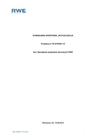 WYMAGANIA OFERTOWE_AKTUALIZACJA Przetarg nr FZ-Z/P0301/15 dot: Sprzątanie budynków biurowych RWE Warszawa, dn. 10.09.2015 ... Przetarg nr FZ-Z/P301/15 1. Dane Ogólne 1.1. RWE Stoen Operator Spółką z ograniczoną odpowiedzialnością z siedzibą przy ul. Pięknej 46, w Warszawie, zwana dalej „Zamawiającym” w imieniu i na rzecz, którego działa: RWE Polska Spółka Akcyjna z siedzibą przy ul. Wybrzeże Kościuszkowskie 41 w Warszawie zaprasza do wzięcia udziału w Przetargu na usługę sprzątania terenu oraz budynków biurowych. Celem przetargu jest wyłonienie firmy, która będzie wykonywała usługę sprzątania zgodnie z informacjami zawartymi w Wymaganiach ofertowych oraz w załącznikach w lokalizacjach przy ul. Rudzka 18, ul. Włodarzewska 68, ul. Rychlińskiego 2, ul. Piękna 46, ul. Towarowa 7a, ul. Pory 80, ul. Oszmiańska 20, Nieświeska 52, ul. Pereca 4/6, Chrzanowskiego 12, Wybrzeże Kościuszkowskie 41 Termin realizacji przedmiotu Przetargu: Umowa zostanie podpisana 3 lata. 1.2. O udzielenie zamówienia ubiegać się mogą Oferenci spełniający następujące warunki: a) posiadają niezbędne uprawnienia do występowania w obrocie prawym; b) w ostatnich 2 latach zrealizowali co najmniej 3 zadań o charakterze i złożoności porównywalnej z zakresem Przetargu; c) nie zalegają z płatnościami wobec Urzędu Skarbowego i ZUS oraz znajdują się w sytuacji finansowej pozwalającej na wykonanie przedmiotu Przetargu; d) posiadają wszystkie niezbędne dokumenty uprawniające wykonania przedmiotu przetargu. 2. Procedura Przetargowa Przetarg składa się z dwóch etapów: Etap I – Zgłoszenie chęci udziału, Etap II – Złożenie ofert w za pośrednictwem Portalu Dostawcy RWE: https://supplier.rwe.com/irj/portal/ 2.1. Etap I. Zgłoszenie chęci wzięcia udziału w Przetargu odbywa się na podstawie zeskanowanego wypełnionego i podpisanego Formularza Zgłoszenia (Załącznik 1), który 00 należy wysłać mailem w terminie do 15.10.2015r. do godziny 12 na e-mail: [email protected] 2.1.1. Zamawiający udostępni Oferentom materiały szkoleniowe dot. obsługi Portalu Dostawcy RWE. Po weryfikacji danych Oferenta materiały szkoleniowe zostaną wysłane drogą elektroniczną na adres e-mail podany na Formularzu Zgłoszenia. 2.2. Etap II – Złożenie ofert za pośrednictwem Portalu Dostawcy RWE: https://supplier.rwe.com/irj/portal/. Oferta powinna zawierać: 2.2.1. następujące dokumenty i oświadczenia: a) odpis z właściwego rejestru lub zaświadczenie o wpisie do Ewidencji Działalności Gospodarczej; b) referencje z przynajmniej 3 zrealizowanych zadań w okresie ostatnich powinno 2 lat o charakterze i złożoności porównywalnej z zakresem Przetargu. (Kontakt do osoby, która może je potwierdzić); c) propozycje wynagrodzenia zgodnie z punktem 2.2.2 d) oświadczenie o wizji lokalnej 2.2.2. wynagrodzenie: a) wysokość wynagrodzenia za realizację przedmiotu Przetargu. Wycena przedmiotu Przetargu polega na podaniu kwot bez VAT, obejmujących ceny jednostkowe przedmiotu przetargu. Wynagrodzenie musi pokrywać wartość kompletnej realizacji przedmiotu Przetargu. 2 Kod pola Przetarg nr FZ-Z/P301/15 2.3. Składanie oferty 2.3.1. Dokumenty wymienione w punkcie 2.2. (Etap II) Procedury Przetargowej należy 00 00 złożyć w terminie od 16.10.2015r. od godziny 12 do 23.10.2015r. do godziny 13 za pośrednictwem Portalu Dostawcy RWE: https://supplier.rwe.com/irj/portal/. 2.3.2. Oferta będzie wprowadzona do Portalu w języku polskim przez uprawnionego przedstawiciela Oferenta. 2.3.3. Wszystkie oferty otrzymane przez Zamawiającego w formie innej niż za pośrednictwem Portalu Dostawcy RWE lub po terminie podanym powyżej nie będą rozpatrywane. 2.4. Pozostałe wymagania 2.4.1. Oferta zostanie przesłana bezpłatnie oraz w sposób niewiążący dla Zamawiającego. 2.4.2. Zaleca się, aby Oferent zdobył wszelkie informacje, które mogą być konieczne do przygotowania oferty oraz zaakceptowania umowy. 2.4.3. Każdy Oferent przedłoży tylko jedną ofertę sam lub jako reprezentant spółki. Oferent, który przedłoży więcej niż jedną ofertę (nie dotyczy modyfikacji oferty przed upływem terminu składania ofert) zostanie wyłączony z postępowania. 2.4.4. Przy wyborze oferty Zamawiający będzie kierował się następującymi kryteriami: Cena łączna – 80% Doświadczenie – 10% System Oceny Dostawców (SOD) – 10% Zadania stanowiące przedmiot Przetargu będą oceniane łącznie/oddzielnie. 2.4.5. W szczególnie uzasadnionych przypadkach, przed upływem terminu składania ofert Zamawiający może zmodyfikować treść dokumentów Przetargowych. Każda wprowadzona przez Zamawiającego zmiana zostanie opublikowana na stronie internetowej Zamawiającego w dziale Przetargów./O każdej wprowadzonej zmianie Zamawiający poinformuje Oferenta e-mailem. Zamawiający może przedłużyć wówczas określony w pkt. 2.2.1. termin składania ofert w celu umożliwienia Oferentom uwzględnienia w przygotowywanych ofertach otrzymanych zmian. W tym przypadku wszelkie prawa i zobowiązania Zamawiającego i Oferenta odnośnie wcześniej ustalonego terminu będą podlegały ewentualnemu nowemu terminowi. 2.4.6. Termin związania ofertą handlową wynosi 90 dni od daty jej złożenia. 2.4.7. Oferent może wprowadzać zmiany lub wycofać złożoną przez siebie ofertę do końca wyznaczonego w pkt. 2.3.1 terminu składania ofert Oferent nie może wycofać oferty i wprowadzać zmian w ofercie po upływie terminu składania ofert. 2.4.8. Wszystkie oferty będą oceniane przez Komisję Przetargową. 2.4.9. Komisja Przetargowa odrzuca oferty: a) nie odpowiadające w sposób oczywisty warunkom Przetargu; b) złożone bez wymaganych lub kompletnych dokumentów; c) nieczytelne lub budzące wątpliwości co do ich treści; d) złożone po terminie lub z pominięciem Portalu Dostawcy RWE. 2.4.10. Zamawiający opublikuje na swojej stronie internetowej na okres 7 dni, nazwę Oferenta, kt