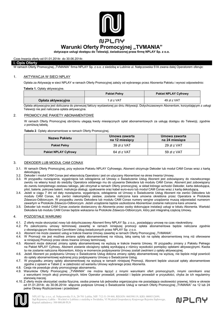 Warunki Oferty Promocyjnej „TVMANIA” dotyczące usługi dostępu do Telewizji, świadczonej przez firmę NPLAY Sp. z o.o. Czas trwania oferty od 01.01.2014r. do 30.06.2014r. I. Opis Oferty W ramach Oferty Promocyjnej „TVMANIA” firma NPLAY Sp. z o.o. z siedzibą w Lublinie ul. Nałęczowska 51A zwana dalej Operatorem oferuje: 1. AKTYWACJA W SIECI NPLAY Opłata za Aktywację w sieci NPLAY w ramach Oferty Promocyjnej zależy od wybranego przez Abonenta Pakietu i wynosi odpowiednio: Tabela 1. Opłaty aktywacyjne. Opłata aktywacyjna Pakiet Pełny Pakiet NPLAY Cyfrowy 1 zł z VAT 49 zł z VAT Opłata aktywacyjna jest doliczana do pierwszej faktury wystawionej po dniu Aktywacji. Dotychczasowym Abonentom, korzystającym z usługi Telewizji nie jest naliczana opłata aktywacyjna. 2. PROMOCYJNE PAKIETY ABONAMENTOWE W ramach Oferty Promocyjnej obniżeniu ulegają kwoty miesięcznych opłat abonamentowych za usługę dostępu do Telewizji, zgodnie z poniższą tabelą. Tabela 2. Opłaty abonamentowe w ramach Oferty Promocyjnej. 3. Nazwa Pakietu Umowa zawarta na 12 miesięcy Umowa zawarta na 24 miesiące Pakiet Pełny 39 zł z VAT 29 zł z VAT Pakiet NPLAY Cyfrowy 64 zł z VAT 59 zł z VAT DEKODER LUB MODUŁ CAM CONAX 3.1. W ramach Oferty Promocyjnej, przy wyborze Pakietu NPLAY Cyfrowego, Abonent otrzymuje Dekoder lub moduł CAM Conax wraz z kartą dekodującą. 3.2. Dekoder i moduł CAM Conax jest własnością Operatora i jest on użyczany Abonentowi na okres trwania Umowy. 3.3. W przypadku rozwiązania, wygaśnięcia lub odstąpienia od Umowy o Świadczenie Usług Abonent jest zobowiązany do niezwłocznego zwrotu na własny koszt do siedziby Operatora oddanego mu do używania Dekodera lub modułu CAM Conax. Abonent jest zobowiązany do zwrotu kompletnego zestawu takiego, jaki otrzymał w ramach Oferty promocyjnej, w skład którego wchodzi Dekoder, karta dekodująca, pilot, baterie, pokrywa baterii, instrukcja obsługi, opakowanie oraz kabel euro-euro lub moduł CAM Conax wraz z kartą dekodującą. 3.4. Jeżeli w ciągu 7 dni od daty rozwiązania, wygaśnięcia, odstąpienia od Umowy o Świadczenie Usług Abonent nie zwróci Dekodera lub modułu CAM Conax, lub zwróci niekompletny zestaw, zostanie naliczona kara umowna określona przez Operatora w Protokole Zdawczo-Odbiorczym. W przypadku zwrotu Dekodera lub modułu CAM Conax numery seryjne urządzenia muszą odpowiadać numerom zawartym w Protokole Zdawczo-Odbiorczym. Jeżeli urządzenie będzie uszkodzone Abonentowi zostanie naliczona kara umowna. 3.5. Dekoder lub moduł CAM Conax zostanie dostarczony do Abonenta przez osoby dokonujące instalacji usługi w lokalu Abonenta. Wartość Dekodera lub modułu CAM Conax będzie wskazana na Protokole Zdawczo-Odbiorczym, który jest integralną częścią Umowy. 4. POZOSTAŁE WARUNKI 4.1. Z oferty może skorzystać nowy lub dotychczasowy Abonent firmy NPLAY Sp. z o.o., posiadający umowę na czas nieokreślony. 4.2. Po zakończeniu umowy terminowej zawartej w ramach niniejszej promocji opłata abonamentowa będzie naliczana zgodnie z obowiązującym Abonenta Cennikiem Usług świadczonych przez NPLAY Sp. z o.o. 4.3. Abonent nie może zawiesić usług w trakcie trwania Umowy zawartej w ramach Oferty Promocyjnej „TVMANIA”. 4.4. W Promocji nie jest możliwa zmiana opłaty abonamentowej na niższą, taką samą lub na opłatę abonamentową inną niż oferowane w niniejszej Promocji przez okres trwania Umowy terminowej. 4.5. Abonent może dokonać zmiany opłaty abonamentowej na wyższą w trakcie trwania Umowy. W przypadku zmiany z Pakietu Pełnego na Pakiet NPLAY Cyfrowy, Abonent zostanie obciążony opłatą wynikającą z różnicy wysokości pomiędzy opłatami aktywacyjnymi. Kwota ta nie zostanie naliczona Abonentom, którzy w momencie podpisywania Umowy zostali zwolnieni z opłaty aktywacyjnej. 4.6. Jeżeli Abonent po podpisaniu Umowy o Świadczenie Usług dokona zmiany opłaty abonamentowej na wyższą, nie będzie mógł powrócić do opłaty abonamentowej wybranej przy podpisywaniu Umowy o Świadczenie Usług. 4.7. W przypadku zmiany opłaty abonamentowej na wyższą w ramach niniejszej Promocji, Abonent będzie uiszczał opłaty abonamentowe zgodne z opisem w Tabeli 2. w zależności od wariantu Umowy wybranego przez Abonenta. 4.8. Cesja nie powoduje utraty promocyjnego abonamentu. 4.9. Warunków Oferty Promocyjnej „TVMANIA” nie można łączyć z innymi warunkami ofert promocyjnych, innymi cennikami oraz z warunkami innych akcji promocyjnych, które Operator prowadził, prowadzi i będzie prowadził w przyszłości, chyba że ich regulaminy stanowią inaczej. 4.10. Z oferty może skorzystać osoba fizyczna, osoba prawna lub jednostka organizacyjna nie posiadająca osobowości prawnej, która w okresie od 01.01.2014r. do 30.06.2014r. włącznie podpisze Umowę o Świadczenie Usług w ramach Oferty Promocyjnej „TVMANIA” na 12 lub 24 pełne Okresy Rozliczeniowe i przedstawi: NPLAY Sp. z o.o., ul. Nałęczowska 51A, 20-701 Lublin, NIP: 712-31-39-868, REGON: 060398119, KRS: 0000312699, Sąd Rejonowy Lublin – Wschód w Lublinie z siedzibą w Świdniku, VI Wydział Gospodarczy Krajowego Rejestru Sądowego, Kapitał zakładowy: 500 000,00 PLN a) osoba fizyczna, obywatel RP: dowód osobisty wraz z informacją o aktualnym miejscu zameldowania (honorowane są wyłącznie dokumenty wystawione po 31.12.2000r.) b) osoba fizyczna nie posiadająca obywatelstwa polskiego i posiadająca kartę pobytu: paszport lub dowód osobisty obywatelstwa państwa Unii Europejskiej \ Europejskiego Obszaru Gospodarczego oraz kartę pobytu lub kartę pobytu obywatela Unii Europejskiej \ Europejskiego Obszaru Gospodarczego. c) Osoba fizyczna nie posiadająca obywatelstwa polskiego i nie posiadająca karty pobytu: paszport dyplomatyczny lub służbowy oraz dokument Ministerstwa Spraw Zagranicznych RP, uzasadniający przebywanie Klienta na terenie RP z wskazanym terminem, nie krótszym niż data wygaśnię