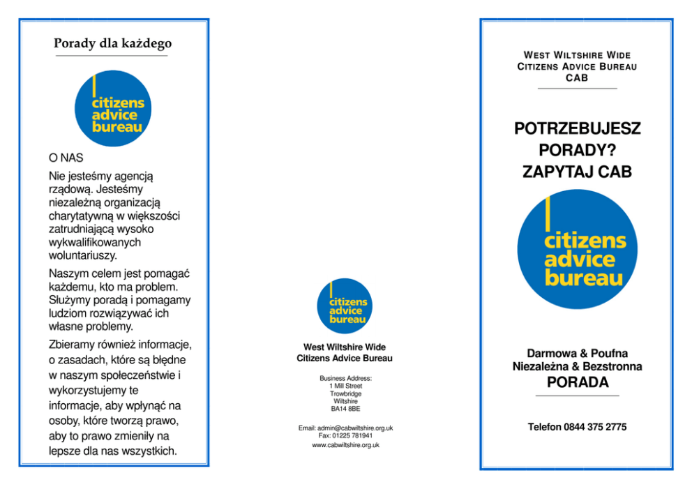 Porady dla każdego W EST W ILTSHIRE W IDE C ITIZENS ADVICE B UREAU CAB POTRZEBUJESZ PORADY? ZAPYTAJ CAB O NAS Nie jesteśmy agencją rządową. Jesteśmy niezależną organizacją charytatywną w większości zatrudniającą wysoko wykwalifikowanych woluntariuszy. Naszym celem jest pomagać każdemu, kto ma problem. Służymy poradą i pomagamy ludziom rozwiązywać ich własne problemy. Zbieramy również informacje, o zasadach, które są błędne w naszym społeczeństwie i wykorzystujemy te informacje, aby wpłynąć na osoby, które tworzą prawo, aby to prawo zmieniły na lepsze dla nas wszystkich. West Wiltshire Wide Citizens Advice Bureau Darmowa & Poufna Niezależna & Bezstronna Business Address: 1 Mill Street Trowbridge Wiltshire BA14 8BE PORADA Email: [email protected] Fax: 01225 781941 www.cabwiltshire.org.uk Telefon 0844 375 2775 WSTĄP DO NAS Mamy specjalne godziny i miejsca gdzie można przyjść do nas bez uprzedniego umówienia się, jednakże trzeba będzie poczekać w kolejce. M ASZ P ROBLEM ? P OTRZEBUJESZ P ORADY ? O TO C O M OŻESZ Z ROBIĆ ... Citizens Advice Bureau służy Ci poradą w każdym problem – a jeśli nie, powiemy Ci gdzie uzyskasz poradę, której potrzebujesz. Porad udzielamy za darmo i w ścisłej tajemnicy – nigdy nie pokażemy nikomu Twoich danych bez Twojej pisemnej zgody. Możemy pomóc w • • • • • • • • • Zasiłkach/ benefitach Długach Rozwodach Pomocy prawnej Pracy Zakwaterowaniu Sprawy imigracyjne Sprawy konsumenckie Wszystko inne TELEFON Nasi doświadczeni i specjalnie wyszkoleni doradcy pomogą pod numerem: . 0844 375 2775 dzwoniący z telefonu domowego . 0300 456 8375 dzwoniący z telefonu komórkowego Pon.,wt.,czw.,pt. 10.00-16.00 Śr. 9.00-16.00 SPOTKANIA W większości przypadków jesteśmy w stanie pomóc przez telefon. Jeśli potrzebujesz pomocy przy wypełnianiu dokumentów, zostaniesz umówiony na spotkanie przez naszego doradcę. TŁUMACZ Polski tłumacz jest dostępny w co dróga środę od 10 marca 2010 w biurze w Trowbridge. 14.00 -16.00 Trowbridge 1 Mill Street, Trowbridge BA14 8BE Od wtorku do piątku pomiędzy 10.00 a 16.00 Warminster Central Car Park Wtorek 10.00 – 15.00 Środa 10.00 – 13.00 Melksham Town Hall Poniedziałek 10.00 – 13.00 Piątek 10.00 – 15.00 INTERNET Odpowiedzi na wiele pytań można znaleźć na naszej stronie internetowej www.adviceguide.org.uk Można również wysłać zapytanie do nas e-mailem klikając na zakładkę Contact Us na stronie www.cabwiltshire.org.uk Informacje w języku polskim znajdują się na stronie www.migrantworkerswiltshire.org.uk