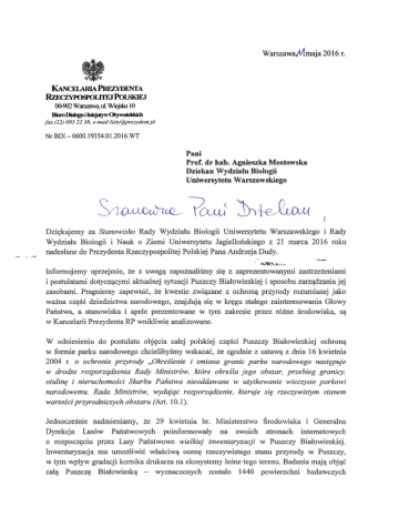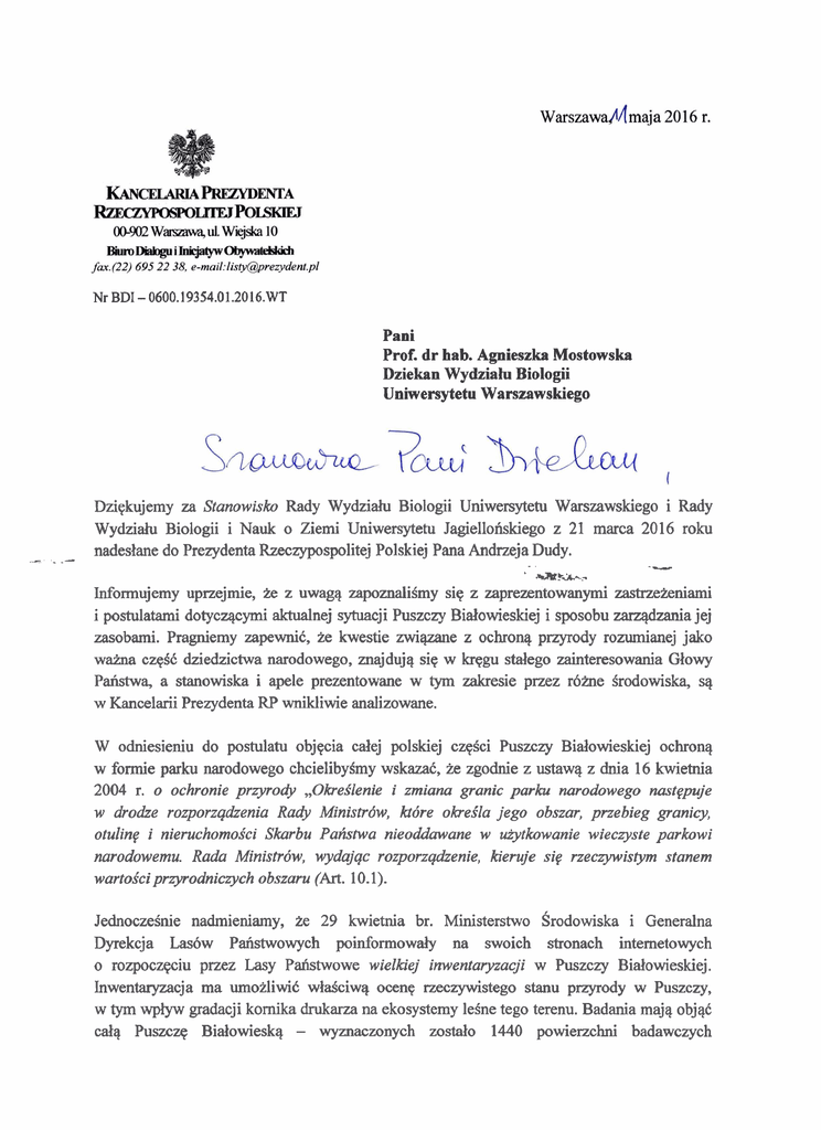 Nr BDI - 0600.19354.01.2016.WT Pani Prof. dr hab. Agnieszka Mostowska Dziekan Wydziah Biologii Uniwersytetu Warszawskiego -c _ Dziqkujemy za Stanowisko Rady Wydzialu Biologii Uniwersytetu Warszawskiego i Rady Wydzialu Biologii i Nauk o Ziemi Uniwersytetu Jagielloriskiego z 21 marca 2016 roku _-nadeslane do Prezydenta Rzeczypospolitej Polskiej Pana Andrzeja Dudy. .. =nm?%A.c.- . -- Mormujemy uprzejmie, 2e z uwagq zapoznaliimy siq z zaprezentowanymi zastrzezeniami i postulatami dotycqcymi aktualnej sytuacji Puszczy Bialowieskiej i sposobu zarzapzania jej zasobami. Pragniemy zapewnid, 2e kwestie m i m e z ochronq przyrody rozumianej jako waiha cqS6 dziedzictwa narodowego, znajdujq siq w kqgu stalego zainteresowania Glowy Pahstwa, a stanowiska i apele prezentowane w tym zakresie przez r6irne Srodowiska, sq w Kancelarii Prezydenta RP wnikliwie analizowane. W odniesieniu do postulatu objqcia calej polskiej czqici Puszczy Bialowieskiej ochronq w forrnie parku narodowego chcielibyimy wskaza6, ie zgodnie z ustawq z dnia 16 kwietnia 2004 r. o ochronie prvrody ,,OMlenie i zmiana granic parku narodowego nastgpuje w drodze rozporzqdzenia Rudy Ministrbw, kbre o M l a jego obszar, przebieg granicy, otuling i nieruchomoici Skarbu Pahtwa nieoddawane w uiytkowanie wieczyste parkowi narodowemu. Rada Ministrbw, wydajqc rozporzqkenie, kieruje sig rzeczywistym stanem wartoSci przyrodniczych obszaru (Art. 10.1). JednoczeSnie nadmieniamy, 2e 29 kwietnia br. Ministerstwo ~rodowiskai Generalna Dyrekcja Lasow Paristwowych poinformowaly na swoich stronach intemetowych o rozpoczqciu przez Lasy Paristwowe wielkiej imyentaryzacji w Puszczy Bialowieskiej. Inwentaryzacja ma umozliwiC wldciwq ocenq rzeczywistego stanu przyrody w Puszczy, w tym wplyw gradacji kornika drukarza na ekosystemy lehe tego terenu. Badania maja objqk calq Puszcq Bialowieskq - wyznaczonych zostalo 1440 powierzchni badawczych zlokalizowanych w Bidowieskim Parku Narodowym, rezerwatach przyrody oraz nadleSnictwach gospodarczych. Koordynator inwentaryzacji Pan Jan Tabor z Wydzialu Ochrony Przyrody Dyrekcji Generalnej Las6w Patistwowych w s k d m.in., 2e ,jednym z glbwnym celbw inwentaryzacji jest porbwnanie rdinorodnoici biologicznej w lasach gospodarczych i lasach poddanych dlugotrwalej ochronie biernej. Mum nadziejg, ze wyYJaSnienietych istotnych kwestii znaczqco ograniczy istniejqcy obecnie konfik dwdch przeciwstawnych sposobdw t&ytkowania zasobdw przyrodniczych w Puszczy. Zjednej strony mamy ochrong biernq, RIbra nakazuje zaprzestania jakiejkolwiek aktywnoici, z drugiej zrdwnowaionq gospodarkg l e i q M r a poprzez mqdre gospodarowanie lasami dostarcza pewnych korzyici, ale pozwala rbwniei zachowai bogactwo przyrodnicze lasbw. Prace inwentaryzacyjne majq potrwaC do konca roku, a raport z tej inwentaryzacji, jak poinforrnowal Dyrektor Generalny Las6w Pahstwowych Pan Konrad Tomaszewski, zostanie przedstawiony Ministrowi Srodowiska i publicznobi, w tym organizacjom pozarz.qdowyrn i zainteresowanym Srodowiskom. " Chcielibyfimy ponadto zaznaczyk, ke 25 marca br. Minister ~rodowiskaoraz Dyrektor Generalny Las6w Patistwowych przyjqli ,,Program dla Puszczy Bialowieskiej j a b dzieakichva Kulturowo-przyrodniczego UNESCO oraz obszaru sieci Natura 2000". TreS6 tego dokumentu dostqpna jest na stronie internetowej Ministerstwa Srodowiska: www.mos.gov.pY. Jeszcze raz dziekujemy za nadeslane Stanowisko i troskq o wlaSciwq ochronq Puszczy Bidowieskiej. Przepraszamy za zwloke w udzieleniu odpowiedzi, spowodowanq bardzo naplywem korespondencji kierowanej do Pana Prezydenta i Kancelarii.