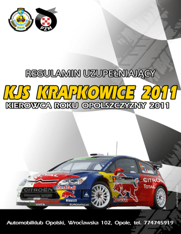WSTĘP Konkursowa Jazda Samochodem zwana dalej „KJS Krapkowice 2011” jest II rundą cyklu o tytuł „Kierowca Roku Opolszczyzny 2011”. Jest to cykl popularnych imprez samochodowych dla wszystkich kierowców, którego celem jest podnoszenie bezpieczeństwa i umiejętności kierujących pojazdami samochodowymi. KJS Krapkowice 2011 zostanie przeprowadzony zgodnie z postanowieniami: - Międzynarodowego Kodeksu Sportowego FIA, w części nie dotyczącej sportu kwalifikowanego - Regulaminu ramowego KJS wydanego przez GKSS PZM na rok 2011, - Regulaminu ramowego Kierowca Roku Opolszczyzny 2011 zatwierdzonego przez OKSS ZO PZM w Opolu, - ustawy „Prawo o Ruchu Drogowym RP” - niniejszego Regulaminu uzupełniającego . PROGRAM IMPREZY Niedziela 08.05.2011 r. Czas pracy Biura imprezy godz. 8.00 -17.30 Zamknięcie listy zgłoszeń godz. 8.45 Odbiór Administracyjny godz. 8.00 – 9.00 Badanie Kontrolne BK 1 godz. 8.15 – 9.15 Pierwsze posiedzenie ZSS godz. 9.00 Publikacja listy załóg dopuszczonych do startu godz. 9.45 Obowiązkowa odprawa uczestników godz. 9.45 Start pierwszej załogi godz. 10.00 Meta pierwszej załogi godz. 15.03 Opublikowanie końcowej klasyfikacji prowizorycznej godz. 16.45 Rozdanie nagród godz. 17.15 1. USTALENIA OGÓLNE 1.1 Miejsce i termin imprezy Impreza odbędzie się w dniu 08 maja 2011 r. w Krapkowicach i okolicach. Start pierwszego uczestnika – godz. 10.00 Meta pierwszego uczestnika - godz. 15.03 1.2 Nazwa i ranga imprezy. Konkursowa Jazda Samochodem KJS Krapkowice 2011 zaliczana jest do cyklu „Kierowca Roku Opolszczyzny 2011”. 1.3 Numer wizy ZO PZM Numer wizy 2/KJS/OKSS/2011 wydanej dnia 23.04.2011 . 1.4 Lokalizacja biura Biuro imprezy do dnia 06 maja 2011r. do godziny 15:00 znajdować się będzie w siedzibie Automobilklubu Opolskiego ul. Wrocławska 102, Opole 45-837, Tel. 77 47 45 919 e-mail: [email protected] www.automobilklub.opole.pl W dniu 08 maja 2011r. od godziny 8:00 do godz. 17.30 biuro mieścić się będzie w siedzibie Pizzerii Pescatore, Os. XXX-lecia 20, 47-303 Krapkowice 1.5 Lokalizacja startu, mety i parku zamkniętego Start – na parkingu przed Pizzerią Pescatore Meta – na parkingu przed Pizzerią Pescatore Komasacja: na parkingu przed Pizzerią Pescatore Park Zamknięty – nie przewiduje się. 1.6 Charakterystyka Impreza zostanie przeprowadzona w ciągu jednego dnia i składa się z jednego etapu oraz 3 sekcji. Na trasie zlokalizowanych będzie 9 prób sprawnościowych Sz, poprzedzonych PKC. Nawierzchnia trasy i prób: - trasa jazdy okrężnej – asfalt - Sz 1,4,7 asfalt – beton - szuter - Sz 2,5,8 asfalt - Sz 3,6,9 asfalt Długość trasy: 138,3 km Trasa imprezy jest obowiązkowa i została opisana w książce drogowej. 2. ORGANIZACJA 2.1 Nazwa organizatora Automobilklub Opolski 2.2 Adres ul. Wrocławska 102, 45-837 Opole Tel./fax: 77 47 45 919 e-mail: [email protected] konto bankowe: PKO BP 56 1020 3668 0000 5902 0009 6685 2.3 Przy współudziale: Starostwa Powiatowego w Krapkowicach Urząd Miasta i Gminy w Krapkowicach Urzędu Miejskiego w Zdzieszowicach Pizzerii Pescatore Radia Plus Opole 2.4 Zespół Sędziów Sportowych Przewodniczący Członek Członek 2.5 Osoby oficjalne Dyrektor Imprezy Asystent Dyrektora ds. sportowych Asystent Dyrektora ds. organizacyjnych Kierownik Biura Komisja Obliczeń Badanie Kontrolne 2.6 Kierownicy Prób sprawnościowych Sz 1/4/7 - „Fabryczna” Sz 2/5/8 - „Boisko” Sz 3/6/9 – „Koksownia” Start, Meta, Przegrupowanie Jarosław Strzelecki Bożena Kobyłkiewicz Małgorzata Punt Mariola Grzelak Jarosław Gontarz Bartosz Kobyłkiewicz Grażyna Kapałka Wioletta Wełpa Zdzisław Kostyk Czesław Cebulla Janusz Kobyłkiewicz Sławomir Leśkiewicz Przemysław Hałajko Jakub Marek 3. ZGŁOSZENIA 3.1 Załoga 3.1.1 Załogę stanowi kierowca i pilot. 3.1.2 Pilot musi mieć ukończone 17 lat. 3.1.3 Pilot może posiadać licencję sportów samochodowych. 3.1.4 Pilot nie może prowadzić samochodu podczas trwania imprezy. W przypadku stwierdzenia prowadzenia samochodu przez pilota, załoga zostanie wykluczona z imprezy. 3.1.5 Podczas trwania imprezy wewnątrz pojazdu musi być umieszczona karta identyfikacyjna z aktualnym zdjęciem kierowcy. (według załącznika nr 7 Regulaminu Ramowego KJS PZM). Nieprzestrzeganie tego przepisu pociągnie za sobą karę do wykluczenia włącznie. 3.1.6 Dopuszcza się do udziału w rundach KRO kierowców posiadających licencje sportowe, którzy klasyfikowani będą wyłącznie w klasie „Gość”. 3.2 Obowiązki załogi Przez podpisanie zgłoszenia do udziału w KJS załoga zobowiązuje się do całkowitego podporządkowania przepisom niniejszego regulaminu i regulaminu uzupełniającego oraz poleceniom i instrukcjom wydawanym przez władze KJS. Pod rygorem niedopuszczenia do startu lub wykluczenia z KJS każda załoga zobowiązana jest do: • obecności na odprawie uczestników • zgłoszenia się do BK • przejechania trasy KJS z pobraniem wiz na wszystkich punktach PKC i PKP w podanej przez organizatora kolejności i po trasie wynikającej z książki drogowej • kolejnego odbycia wszystkich prób zręcznościowych w zapiętych pasach bezpieczeństwa i kaskach ochronnych, z włączonymi światłami mijania i zamkniętymi szybami. 3.3 Procedura zgłoszeń 3.3.1 Zgłoszenia będą przyjmowane pocztą elektroniczną i faksem do dnia 06 maja 2011 r. do godz. 15:00 oraz 08 maja 2011r. w biurze zawodów w godzinach od 8:00 do 8:45. Oryginał zgłoszenia musi być podpisany przez obydwu członków załogi i złożony w biurze zawodów. 3.3.2 Organizator ma prawo nie przyjęcia zgłoszenia bez podania przyczyny. 3.3.3 Przez fakt podpisania zgłoszenia załoga przyjmuje do wiadomości, że startuje w imprezie na własną odpowiedzialność i zrzeka się wszelkich praw do odszkodowań za straty wynikłe podczas imprezy. Zrzeczenie to dotyczy FIA, PZM, Organizatora, osób oficjalnych występujących w imprezie i innych uczestników. 3.4 Maksymalna ilość uczestn