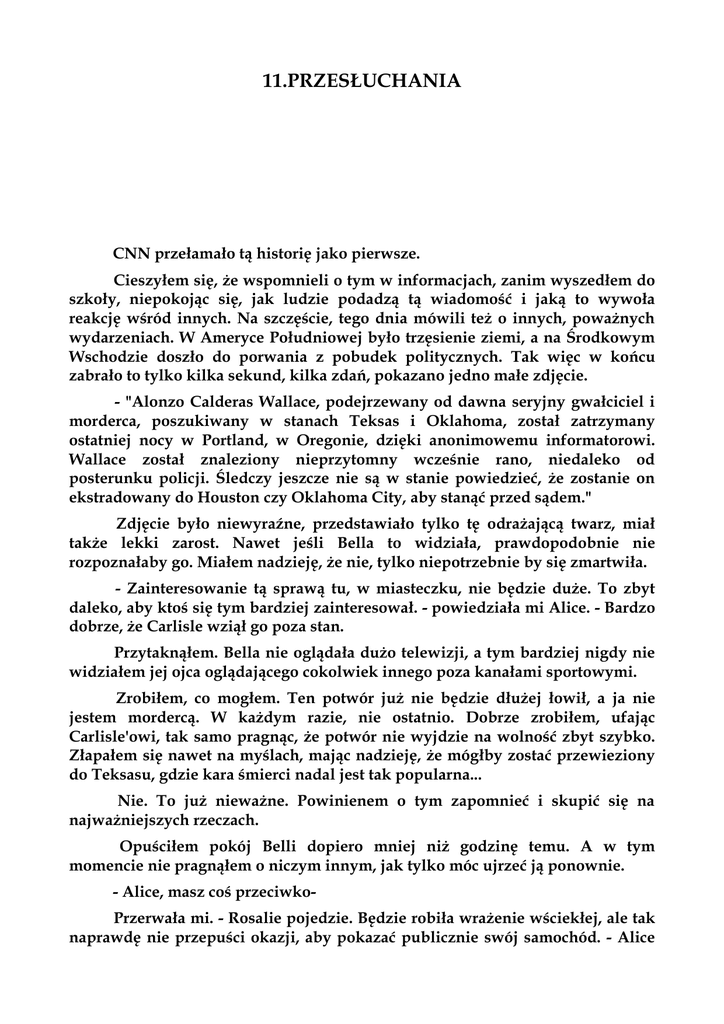11.PRZESŁUCHANIA CNN przełamało tą historię jako pierwsze. Cieszyłem się, że wspomnieli o tym w informacjach, zanim wyszedłem do szkoły, niepokojąc się, jak ludzie podadzą tą wiadomość i jaką to wywoła reakcję wśród innych. Na szczęście, tego dnia mówili też o innych, poważnych wydarzeniach. W Ameryce Południowej było trzęsienie ziemi, a na Środkowym Wschodzie doszło do porwania z pobudek politycznych. Tak więc w końcu zabrało to tylko kilka sekund, kilka zdań, pokazano jedno małe zdjęcie. - "Alonzo Calderas Wallace, podejrzewany od dawna seryjny gwałciciel i morderca, poszukiwany w stanach Teksas i Oklahoma, został zatrzymany ostatniej nocy w Portland, w Oregonie, dzięki anonimowemu informatorowi. Wallace został znaleziony nieprzytomny wcześnie rano, niedaleko od posterunku policji. Śledczy jeszcze nie są w stanie powiedzieć, że zostanie on ekstradowany do Houston czy Oklahoma City, aby stanąć przed sądem." Zdjęcie było niewyraźne, przedstawiało tylko tę odrażającą twarz, miał także lekki zarost. Nawet jeśli Bella to widziała, prawdopodobnie nie rozpoznałaby go. Miałem nadzieję, że nie, tylko niepotrzebnie by się zmartwiła. - Zainteresowanie tą sprawą tu, w miasteczku, nie będzie duże. To zbyt daleko, aby ktoś się tym bardziej zainteresował. - powiedziała mi Alice. - Bardzo dobrze, że Carlisle wziął go poza stan. Przytaknąłem. Bella nie oglądała dużo telewizji, a tym bardziej nigdy nie widziałem jej ojca oglądającego cokolwiek innego poza kanałami sportowymi. Zrobiłem, co mogłem. Ten potwór już nie będzie dłużej łowił, a ja nie jestem mordercą. W każdym razie, nie ostatnio. Dobrze zrobiłem, ufając Carlisle'owi, tak samo pragnąc, że potwór nie wyjdzie na wolność zbyt szybko. Złapałem się nawet na myślach, mając nadzieję, że mógłby zostać przewieziony do Teksasu, gdzie kara śmierci nadal jest tak popularna... Nie. To już nieważne. Powinienem o tym zapomnieć i skupić się na najważniejszych rzeczach. Opuściłem pokój Belli dopiero mniej niż godzinę temu. A w tym momencie nie pragnąłem o niczym innym, jak tylko móc ujrzeć ją ponownie. - Alice, masz coś przeciwkoPrzerwała mi. - Rosalie pojedzie. Będzie robiła wrażenie wściekłej, ale tak naprawdę nie przepuści okazji, aby pokazać publicznie swój samochód. - Alice trzęsła się ze śmiechu. Uśmiechnąłem się do niej. - Do zobaczenia w szkole. Alice westchnęła, a moja twarz wykrzywiła się w grymasie. Wiem, wiem - pomyślała. - Jeszcze nie. Poczekam, aż będziesz gotów, aby przedstawić mnie Belli. Chociaż powinieneś wiedzieć, że to nie chodzi o to, że jestem zazdrosna. Bella także mnie polubi. Nie odpowiedziałem jej, zamiast tego wyszedłem szybko na dwór. To był inny punkt widzenia tej całej sytuacji. Czy Bella chce poznać Alice? Mieć wampirzycę za przyjaciółkę? Znając Bellę... ten pomysł wcale by jej nie przeszkadzał. Skrzywiłem się. Co Bella chciała i co było dla niej najlepsze, to całkowicie dwie różne rzeczy. Zacząłem czuć się niepewnie, kiedy zaparkowałem na podjeździe domu Belli. Ludzkie powiedzenie mówi, że pewne rzeczy wyglądają inaczej rankiem że zmieniają się, kiedy się z nimi prześpi. Czy będę wyglądał dla Belli inaczej w słabym świetle mglistego dnia? Bardziej czy mniej groźnie niż w ciemności nocy? Czy dotarła do niej wreszcie prawda? Czy w końcu będzie się mnie bała? Chociaż, ostatniej nocy spała bardzo spokojnie. Kiedy wypowiedziała moje imię, raz, potem kolejny, uśmiechała się. Więcej niż raz mruczała, abym został. Czy to nie będzie dziś nic znaczyło? Czekałem więc nerwowo, słuchając jej odgłosów z wnętrza domu szybkich kroków na schodach, ostrego rozdzierania jakiejś folii, zawartości lodówki obijającej się o siebie, kiedy zatrzasnęła drzwi. To wszystko brzmiało tak, jakby bardzo się spieszyła. Niespokojna o drogę do szkoły. Na tę myśl uśmiechnąłem się, nabierając znów nadziei. Spojrzałem na zegar. Moje domysły były słuszne - biorąc pod uwagę, że prędkość jej samochodu znacznie ją ogranicza - była już lekko spóźniona. Bella wyszła z domu, z torbą z książkami na ramieniu. Jej włosy były w lekkim nieładzie. Cienki, zielony sweter, który założyła, nie chronił jej dostatecznie przed chłodną mgłą, toteż szła zgarbiona. Sweter był długi, za duży na nią, niepasujący. Maskował skutecznie jej smukłą figurę, przemieniając jej delikatne kształty i miękkie linie w bezkształtną mieszaninę. Paradoksalnie, doceniłem to tak samo mocno, jak pragnąłem, aby miała na sobie coś podobnego do miękkiej, niebieskiej bluzki, którą założyła wczoraj wieczorem... Materiał przylegał ściśle do jej skóry, idealnie wycięty, aby odsłonić hipnotyzujące kształty jej obojczyków, skupiające się we wgłębieniu poniżej jej szyi. Niebieski opływał jej ciało jak woda, podkreślając subtelną formę jej ciała... Tak było dla mnie lepiej - niemal niezbędnie - trzymać myśli daleko, daleko od tych kształtów, więc byłem wdzięczny nietwarzowemu swetrowi. Nie mogłem dopuścić się żadnego błędu, a to byłby olbrzymi błąd, zastanawiać się nad dziwnym głodem, jaki myśli o jej ustach... skórze... ciele... wywoływały u mnie, krążąc sobie luźno. Głód, który omijałem przez sto lat. Ale za to mogłem nie pozwolić sobie myśleć o dotknięciu jej, ponieważ to było niemożliwe. Mógłbym ją skrzywdzić. Bella odwróciła się od drzwi i ruszyła przed siebie w takim pośpiechu, że o mało co nie wpadła na mój samochód, wcale go nie zauważając. Wtedy stanęła jak wryta. Torba zsunęła się z jej ramienia a oczy rozszerzyły się, gdy wzrok spoczął na samochodzie. Wysiadłem, nie dbając w ogóle o poruszanie się ludzkim tempem i otworzyłem dla niej drzwi pasażera. Nie mogłem próbować oszukiwać jej nigdy więce