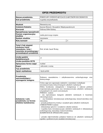 OPIS PRZEDMIOTU Nazwa przedmiotu Kod przedmiotu Wydział Instytut/Katedra Kierunek PODSTAWY INWENTARYZACJI ZABYTKÓW RUCHOMYCH wypełnia instytut/katedra Humanistyczny Instytut Historii i Stosunków Międzynarodowych Ochrona Dóbr Kultury Specjalizacja/specjalność Poziom organizacyjny studia pierwszego stopnia studiów stacjonarne System studiów Rok/semestr III 5 Tytuł i/lub stopień naukowy/tytuł Prof. dr hab. Jacek Woźny zawodowy, imię i nazwisko prowadzącego/ prowadzących przedmiot Liczba godzin dydaktycznych Liczba punktów ECTS 15 Opisywana forma zajęć wykład zaliczenie z oceną Rygor Typ przedmiotu Język wykładowy Język polski Przedmioty wprowadzające i wymagania wstępne Podstawy muzealnictwa i zabytkoznawstwa archeologicznego oraz historycznego Założenia i cele przedmiotu (w formie efektów kształcenia) Celem zajęć jest zapoznanie studentów z metodami i technikami inwentaryzowania różnych kategorii zabytków ruchomych. Efekty kształcenia- umiejętności i kompetencje w zakresie podstaw rozpoznawania,opisywania oraz inwentaryzowania zabytków ruchomych od pradziejów do czasów nowożytnych. WIEDZA- student: - zna najważniejsze kategorie zabytków ruchomych w kryterium chronologicznym; - zna formularze inwentaryzacji archeologicznej, konserwatorskiej oraz muzealnej; - posiada podstawową wiedzę o zasadach opisu zabytków ruchomych. UMIEJĘTNOŚCI-student: - dokumentuje opisowo i rysunkowo zabytki ruchome - wypełnia karty inwentaryzacyjne zabytków ruchomych w dokumentacji archeologicznej, muzealnej i konserwatorskiej; KOMPETENCJE SPOŁECZNE-student: - posiada odpowiedzialne podejście badawcze do zabytków ruchomych zgodnie z podstawowymi zasadami inwentaryzacji Treści programowe przedmiotu -Klasyfikacja zabytków ruchomych -Metody inwentaryzacji zabytków -Podstawy prawne inwentaryzacji zabytków ruchomych -Typy kart inwentarzowych w archeologii i muzealnictwie -Zasady sporządzania dokumentacji opisowej -Podstawy dokumentacji rysunkowej zabytków ruchomych -Współczesne systemy inwentaryzacji zabytków Metody dydaktyczne -wykład -prezentacja eksponatów Forma i warunki zaliczenia przedmiotu – wymagania i system oceniania - zaliczenie z oceną - przygotowanie karty inwentarzowej zabytku ruchomego Literatura podstawowa Literatura uzupełniająca (w tym portale internetowe) - Słownik terminologiczny sztuk pięknych, Warszawa 2007 - K.Zajdler, Leksykon prawa ochrony zabytków, Warszawa 2010 - K. Zajdler, J. Włodarski, Prawo muzeów, Warszawa 2008 - W. Gawrysiak-Leszczyńska, Jak rysować zabytki archeologiczne, Biskupin 2003 - A. Jagielska-Burduk, Zabytek ruchomy, Warszawa 2011 - K.M. Kowalski, Artefakty jako źródła poznania, Gdańsk 1996 - J.S. Pasierb, Ochrona zabytków sztuki kościelnej, Warszawa 2001 - M.Cherka, Ustawa o ochronie zabytków i opiece nad zabytkami. Komentarz, Warszawa 2010 - J. Lipińska, Zbiory publiczne a kolekcjonerstwo prywatne, problematyka ochrony dziedzictwa kulturowego, Warszawa 2000 - T.Stawecki, Rejestry publiczne.Funkcje instytucji, Warszawa 2005 ..................................................... data ......................................................................................................................................... podpis prowadzącego przedmiot/ koordynatora przedmiotu* * 1. opis przedmiotu jest podpisywany przez prowadzącego przedmiot w przypadku, gdy dany przedmiot jest prowadzony wyłącznie przez jedną osobę 2. opis przedmiotu jest podpisywany przez koordynatora przedmiotu w przypadku, gdy dany przedmiot jest prowadzony przez więcej niż jedną osobę np. ze względu na różne formy realizacji przedmiotu (wykład + ćwiczenia) 3. przez koordynatora przedmiotu należy rozumieć osobę odpowiedzialną za przeprowadzenie całego przedmiotu niezależnie od jego formy. PROGRAM NAUCZANIA PRZEDMIOTU PODSTAWY INWENTARYZACJI ZABYTKÓW RUCHOMYCH Opisywana forma zajęć wykład Nazwa przedmiotu Liczba godzin dydaktycznych 15 Tytuł i/lub stopień naukowy/tytuł zawodowy, imię i nazwisko prowadzącego/ prowadzącego dana formę zajęć Prof. dr hab. Jacek Woźny Szczegółowa tematyka zajęć - Zasady metodologiczne inwentaryzacji i klasyfikacji zabytków - Ogólna systematyka artefaktów historycznych - Podstawy prawne dokumentacji i inwentaryzacji zabytków ruchomych - Archeologiczny inwentarz badań powierzchniowych i wykopaliskowych - Karty inwentarzowe zabytków archeologicznych - Typy archeologicznych zabytków wydzielonych i ich dokumentacja - Podstawy gromadzenia i inwentaryzowania muzealiów - Tradycyjne karty zabytków muzealnych i system MONA - Zasady opisu ruchomych zabytków muzealnych - Podstawy dokumentacji konserwatorskiej zabytków ruchomych - Karta inwentaryzacyjna zabytku ruchomego - Ochrona zabytków w świetle dokumentacji konserwatorskiej, muzealnej i archeologicznej Forma i warunki zaliczenia przedmiotu – wymagania i system oceniania -zaliczenie z oceną -przygotowanie karty inwentarzowej zabytku ruchomego - Słownik terminologiczny sztuk pięknych, Warszawa 2007 - K.Zajdler, Leksykon prawa ochrony zabytków, Warszawa 2010 - K.Zajdler, J. Włodarski, Prawo muzeów, Warszawa 2008 Literatura podstawowa - W.Gawrysiak-Leszczyńska, Jak rysować zabytki archeologiczne, Biskupin 2003 - A. Jagielska-Burduk, Zabytek ruchomy, Warszawa 2011 - K.M.Kowalski, Artefakty jako źródła poznania, Gdańsk 1996 - J.S.Pasierb, Ochrona zabytków sztuki kościelnej, Warszawa 2001 - M.Cherka, Ustawa o ochronie zabytków i opiece nad zabytkami. Literatura Komentarz, Warszawa 2010 uzupełniająca (w tym portale internetowe) - J.Lipińska, Zbiory publiczne a kolekcjonerstwo prywatne, problematyka ochrony dziedzictwa kulturowego, Warszawa 2000 - T.Stawecki, Rejestry publiczne. Funkcja instytucji, Warszawa 2005 ..................................................... data ..............................................................................................................................