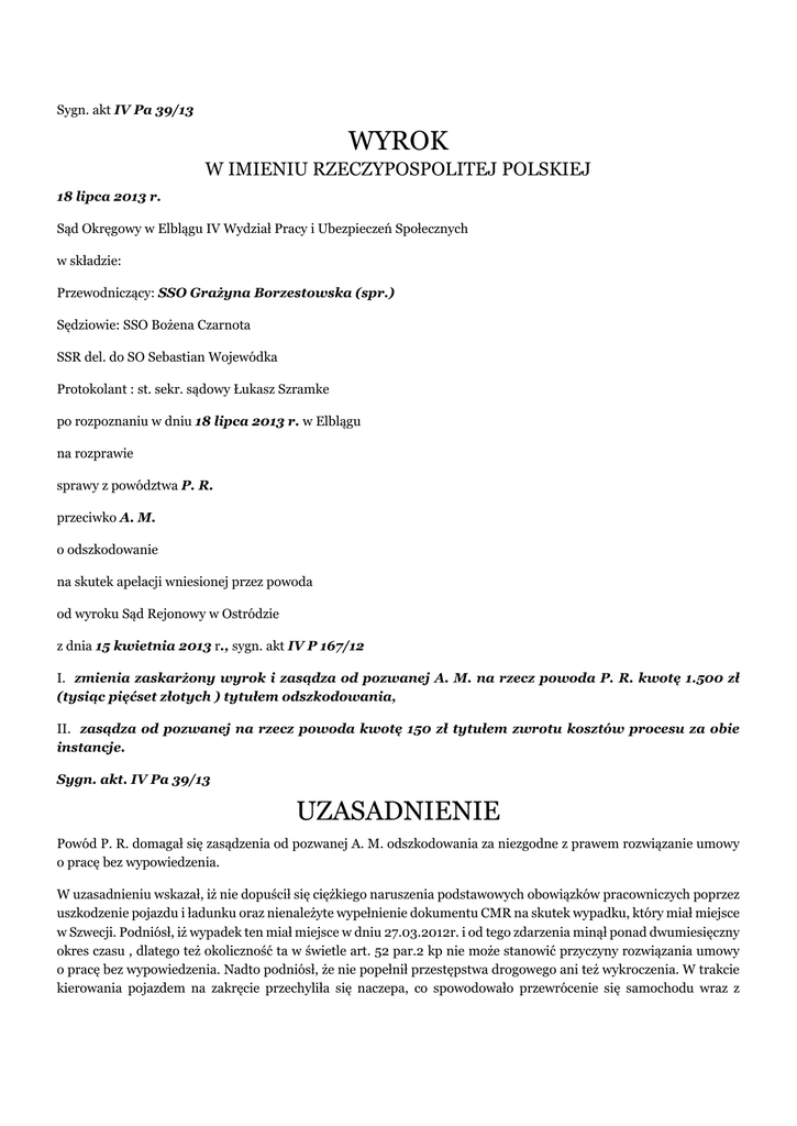 Sygn. akt IV Pa 39/13 WYROK W IMIENIU RZECZYPOSPOLITEJ POLSKIEJ 18 lipca 2013 r. Sąd Okręgowy w Elblągu IV Wydział Pracy i Ubezpieczeń Społecznych w składzie: Przewodniczący: SSO Grażyna Borzestowska (spr.) Sędziowie: SSO Bożena Czarnota SSR del. do SO Sebastian Wojewódka Protokolant : st. sekr. sądowy Łukasz Szramke po rozpoznaniu w dniu 18 lipca 2013 r. w Elblągu na rozprawie sprawy z powództwa P. R. przeciwko A. M. o odszkodowanie na skutek apelacji wniesionej przez powoda od wyroku Sąd Rejonowy w Ostródzie z dnia 15 kwietnia 2013 r., sygn. akt IV P 167/12 I. zmienia zaskarżony wyrok i zasądza od pozwanej A. M. na rzecz powoda P. R. kwotę 1.500 zł (tysiąc pięćset złotych ) tytułem odszkodowania, II. zasądza od pozwanej na rzecz powoda kwotę 150 zł tytułem zwrotu kosztów procesu za obie instancje. Sygn. akt. IV Pa 39/13 UZASADNIENIE Powód P. R. domagał się zasądzenia od pozwanej A. M. odszkodowania za niezgodne z prawem rozwiązanie umowy o pracę bez wypowiedzenia. W uzasadnieniu wskazał, iż nie dopuścił się ciężkiego naruszenia podstawowych obowiązków pracowniczych poprzez uszkodzenie pojazdu i ładunku oraz nienależyte wypełnienie dokumentu CMR na skutek wypadku, który miał miejsce w Szwecji. Podniósł, iż wypadek ten miał miejsce w dniu 27.03.2012r. i od tego zdarzenia minął ponad dwumiesięczny okres czasu , dlatego też okoliczność ta w świetle art. 52 par.2 kp nie może stanowić przyczyny rozwiązania umowy o pracę bez wypowiedzenia. Nadto podniósł, że nie popełnił przestępstwa drogowego ani też wykroczenia. W trakcie kierowania pojazdem na zakręcie przechyliła się naczepa, co spowodowało przewrócenie się samochodu wraz z naczepą. Podniósł, że nie miał w zakresie obowiązków wypełnienia CMR jak również to, że w tym zakresie nie był przez pracodawcę przeszkolony. Strona pozwana w odpowiedzi na pozew wniosła o oddalenie powództwa w całości. W uzasadnieniu przyznała, że od dnia wypadku, który miał miejsce w Szwecji aż do czasu złożenia oświadczenia o rozwiązaniu umowy o pracę minęło ponad dwa miesiące, jednakże , zdaniem pozwanej, nie ma to w sprawie żadnego wpływu na skuteczność i ważność dokonanego rozwiązania umowy w trybie art. 52 par.1 kp, ponieważ przyczyny rozwiązania stosunku pracy nie stanowił bezpośrednio sam wypadek i uszkodzenie pojazdu, ale okoliczności, o których strona pozwana dowiedziała się znacznie później. Wskazała, że główna przyczyną rozwiązania umowy o pracę z powodem był brak należycie wypełnionych dokumentów, co w konsekwencji doprowadziło do powstania znacznej szkody w majątku strony pozwanej- Towarzystwo (...) odmówiło wypłaty odszkodowania . Sąd Rejonowy w Ostródzie wyrokiem z dnia 15.04.2013r. oddalił powództwo i zasądził od powoda na rzecz pozwanej kwotę 135 zł tytułem zwrotu kosztów procesu. Rozstrzygnięcie swoje Sąd Rejonowy oparł na następujących ustaleniach i rozważaniach: Powód był zatrudniony u pozwanej na podstawie umowy o pracę na czas nieokreślony od dnia 19 października 2011 r. jako kierowca ciężarówki. Miejscem wykonywania pracy był teren Polski i zagranica. W dniu 05 czerwca 2012 r. powód otrzymał dwa pisma rozwiązujące z nim umowę o pracę bez wypowiedzenia z winy pracownika (art. 52 § 1 pkt 1 KP). Pisma te są różnie zatytułowane, ale z treści obu oświadczeń pracodawcy jasno wynikało, iż wolą pozwanej było rozwiązanie umowy o pracę z powodem w trybie art. 52 § 1 pkt 1 KP. Pisma te powód otrzymał w tym samym dniu (równocześnie). Jako przyczynę rozwiązania umowy o pracę z powodem pozwana wskazała ciężkie naruszenie obowiązków pracowniczych przez powoda polegające na uszkodzeniu pojazdu i ładunku oraz nienależyte wypełnienie dokumentu CMR związanego z uszkodzonym transportem, co spowodowało odmowę wypłaty pozwanej odszkodowania z polisy OC. Wypadek miał miejsce w Szwecji w dniu 27 marca 2012 r. W tym samym dniu pozwana uzyskała wiadomość o zaistniałym zdarzeniu. Po powrocie ze Szwecji (rozbitym samochodem) powód w dniu 02 kwietnia 2012 r. podpisał oświadczenie, iż wypadek został spowodowany z jego winy oraz zobowiązał się do pokrycia kosztów naprawy samochodu. W dniu 05 kwietnia 2012 r. powód skierował do pozwanej oświadczenie o uchyleniu się od skutków prawnych złożonego oświadczenia woli. Powód podejmując pracę u pozwanej przeszedł szkolenie instruktażu ogólnego oraz instruktażu stanowiskowego. Wszyscy kierowcy zatrudnieni u pozwanej byli przeszkoleni w zakresie wypełniania dokumentów. Powód przeszedł szkolenie dla kierowców kat. C i E, przeszedł również przeszkolenie na przewóz rzeczy. Otrzymał od pozwanej pieczątkę firmową celem przystawienia jej na dokumencie CMR. Miał wiedzę, że otrzymał pieczątkę aby przystawić ją na dokumencie CMR. Wiedział również, że jeżeli na dokumencie CMR nie było wydrukowanych danych pracodawcy, to należy przystawić pieczątkę. Na spornym dokumencie nie było wydrukowanych danych pracodawcy, mimo to powód tego nie zrobił. Powód wiedział kiedy ją trzeba przystawić i gdzie. Brak należycie wypełnionego dokumentu CMR doprowadził do powstania znacznej szkody w majątku pozwanej. Z tego powodu Towarzystwo (...) odmówiło pozwanej wypłaty odszkodowania z tytułu szkody powstałej na skutek zaistniałego wypadku. Sąd Rejonowy wskazał, że nie dał wiary zeznaniom powoda, gdyż były one pełne sprzeczności. Raz powód twierdził, że do jego obowiązków nie należało wypełnianie listów przewozowych CMR, nie dodając, że jego obowiązkiem było przystawienie pieczątki na tym dokumencie. Twierdził też, że nie miał żadnego upoważniania od pracodawcy do wypełnienia dokumentów CMR. Otrzymał jednak od pozwanej pieczątkę firmową i wiedział kiedy i gdzie ma ją przystawić. To nie było upoważnienie, ale wręcz polecenie pracodawcy do wykon
