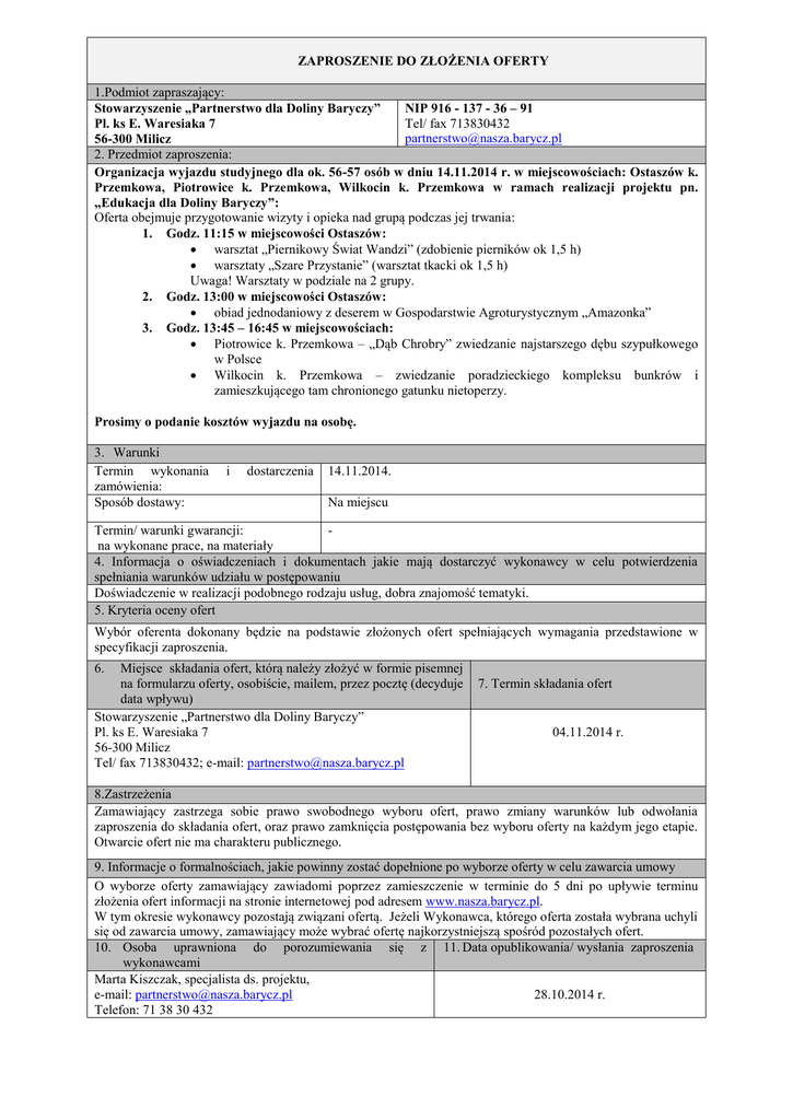 ZAPROSZENIE DO ZŁOŻENIA OFERTY 1.Podmiot zapraszający: Stowarzyszenie „Partnerstwo dla Doliny Baryczy” NIP 916 - 137 - 36 – 91 Tel/ fax 713830432 Pl. ks E. Waresiaka 7 [email protected] 56-300 Milicz 2. Przedmiot zaproszenia: Organizacja wyjazdu studyjnego dla ok. 56-57 osób w dniu 14.11.2014 r. w miejscowościach: Ostaszów k. Przemkowa, Piotrowice k. Przemkowa, Wilkocin k. Przemkowa w ramach realizacji projektu pn. „Edukacja dla Doliny Baryczy”: Oferta obejmuje przygotowanie wizyty i opieka nad grupą podczas jej trwania: 1. Godz. 11:15 w miejscowości Ostaszów: warsztat „Piernikowy Świat Wandzi” (zdobienie pierników ok 1,5 h) warsztaty „Szare Przystanie” (warsztat tkacki ok 1,5 h) Uwaga! Warsztaty w podziale na 2 grupy. 2. Godz. 13:00 w miejscowości Ostaszów: obiad jednodaniowy z deserem w Gospodarstwie Agroturystycznym „Amazonka” 3. Godz. 13:45 – 16:45 w miejscowościach: Piotrowice k. Przemkowa – „Dąb Chrobry” zwiedzanie najstarszego dębu szypułkowego w Polsce Wilkocin k. Przemkowa – zwiedzanie poradzieckiego kompleksu bunkrów i zamieszkującego tam chronionego gatunku nietoperzy. Prosimy o podanie kosztów wyjazdu na osobę. 3. Warunki Termin wykonania zamówienia: Sposób dostawy: i dostarczenia 14.11.2014. Na miejscu Termin/ warunki gwarancji: na wykonane prace, na materiały 4. Informacja o oświadczeniach i dokumentach jakie mają dostarczyć wykonawcy w celu potwierdzenia spełniania warunków udziału w postępowaniu Doświadczenie w realizacji podobnego rodzaju usług, dobra znajomość tematyki. 5. Kryteria oceny ofert Wybór oferenta dokonany będzie na podstawie złożonych ofert spełniających wymagania przedstawione w specyfikacji zaproszenia. Miejsce składania ofert, którą należy złożyć w formie pisemnej na formularzu oferty, osobiście, mailem, przez pocztę (decyduje data wpływu) Stowarzyszenie „Partnerstwo dla Doliny Baryczy” Pl. ks E. Waresiaka 7 56-300 Milicz Tel/ fax 713830432; e-mail: [email protected] 6. 7. Termin składania ofert 04.11.2014 r. 8.Zastrzeżenia Zamawiający zastrzega sobie prawo swobodnego wyboru ofert, prawo zmiany warunków lub odwołania zaproszenia do składania ofert, oraz prawo zamknięcia postępowania bez wyboru oferty na każdym jego etapie. Otwarcie ofert nie ma charakteru publicznego. 9. Informacje o formalnościach, jakie powinny zostać dopełnione po wyborze oferty w celu zawarcia umowy O wyborze oferty zamawiający zawiadomi poprzez zamieszczenie w terminie do 5 dni po upływie terminu złożenia ofert informacji na stronie internetowej pod adresem www.nasza.barycz.pl. W tym okresie wykonawcy pozostają związani ofertą. Jeżeli Wykonawca, którego oferta została wybrana uchyli się od zawarcia umowy, zamawiający może wybrać ofertę najkorzystniejszą spośród pozostałych ofert. 10. Osoba uprawniona do porozumiewania się z 11. Data opublikowania/ wysłania zaproszenia wykonawcami Marta Kiszczak, specjalista ds. projektu, e-mail: [email protected] 28.10.2014 r. Telefon: 71 38 30 432