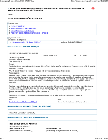 Biznes.pap.pl - raport firmy MBF GROUP S.A. 1z2 http://biznes.pap.pl/espi/pl/reports/view/2,327228 RB-W_ASO: Zawiadomienie o zejściu poniżej progu 5% ogólnej liczby głosów na Walnym Zgromadzeniu MBF Group SA Data: Firma: MBF GROUP SPÓŁKA AKCYJNA Spis tresci: 1. RAPORT BIEŻĄCY 2. MESSAGE (ENGLISH VERSION) 3. INFORMACJE O PODMIOCIE 4. PODPISY OSÓB REPREZENTUJĄCYCH SPÓŁKĘ Spis zalacznikow: Znaleziono 1 załącznik Zawiadomienie_IB_5proc_MBF.pdf Arkusz: RAPORT BIEŻĄCY Nazwa arkusza: RAPORT BIEŻĄCY KOMISJA NADZORU FINANSOWEGO Raport bieżący nr 16 / 2016 Data sporządzenia: Skrócona nazwa emitenta MBF GROUP S.A. Temat Zawiadomienie o zejściu poniżej progu 5% ogólnej liczby głosów na Walnym Zgromadzeniu MBF Group SA Podstawa prawna Art. 70 pkt 1 Ustawy o ofercie - nabycie lub zbycie znacznego pakietu akcji Treść raportu: Zgodnie z art. 70 pkt 1 Ustawy z dnia 29 lipca 2005 roku o ofercie publicznej i warunkach wprowadzania instrumentów finansowych do zorganizowanego systemu obrotu oraz o spółkach publicznych, zarząd spółki MBF Group S.A. z siedzibą w Warszawie _"Emitent"_ informuje, iż w dniu 6 lipca 2016 r. do spółki wpłynęło zawiadomienie o zmianie stanu posiadanego udziału w głosach na Walnym Zgromadzeniu Emitenta. Zgodnie z przedmiotowym zawiadomieniem w wyniku dokonanych transakcji sprzedaży akcji Emitenta spółka pod firmą Instytut Biznesu Sp. z o.o. z siedzibą w Warszawie posiada obecnie 71.000 _siedemdziesiąt jeden tysięcy_ akcji, co stanowi 4,23% akcji w kapitale zakładowym i ogólnej liczbie głosów na Walnym Zgromadzeniu MBF Group S.A. Treść przedmiotowego zawiadomienia przedstawiono w załączeniu do niniejszego raportu. Załączniki Plik Opis Zawiadomienie_IB_5proc_MBF.pdf Zawiadomienie Instytut Biznesu 5 proc Nazwa arkusza: MESSAGE (ENGLISH VERSION) MESSAGE _ENGLISH VERSION_ Nazwa arkusza: INFORMACJE O PODMIOCIE MBF GROUP SPÓŁKA AKCYJNA _pełna nazwa emitenta_ MBF GROUP S.A. _skrócona nazwa emitenta_ Informatyka _inf_ _sektor wg. klasyfikacji GPW w W-wie_ 2016-07-07 10:48 Biznes.pap.pl - raport firmy MBF GROUP S.A. 2z2 04-994 _kod pocztowy_ Bysławska _ulica_ +48 22 350 70 98 _telefon_ [email protected] _e-mail_ 894-301-86-15 _NIP_ http://biznes.pap.pl/espi/pl/reports/view/2,327228 Warszawa _miejscowość_ 82 lok 415 _numer_ +48 22 350 70 13 _fax_ www.mbfgroup.pl _www_ 021480943 _REGON_ Nazwa arkusza: PODPISY OSÓB REPREZENTUJĄCYCH SPÓŁKĘ PODPISY OSÓB REPREZENTUJĄCYCH SPÓŁKĘ Data Imię i Nazwisko 2016-07-06 Robert Krassowski Identyfikator raportu Stanowisko/Funkcja Prezes Zarządu Podpis Robert Krassowski ct9oscrwj1 Nazwa raportu RB-W_ASO Symbol raportu RB-W_ASO Nazwa emitenta MBF GROUP SPÓŁKA AKCYJNA Symbol Emitenta MBF GROUP S.A. Tytul Zawiadomienie o zejściu poniżej progu 5% ogólnej liczby głosów na Walnym Zgromadzeniu MBF Group SA Sektor Informatyka (inf) Kod 04-994 Miasto Warszawa Ulica Bysławska Nr 82 lok 415 Tel. +48 22 350 70 98 Fax +48 22 350 70 13 e-mail [email protected] NIP 894-301-86-15 REGON 021480943 Data sporzadzenia Rok biezacy 2016 Numer 16 adres www www.mbfgroup.pl Serwis Ekonomiczny Polskiej Agencji Prasowej SA 2016 Copyright PAP SA - Wszelkie prawa zastrzezone. 2016-07-07 10:48