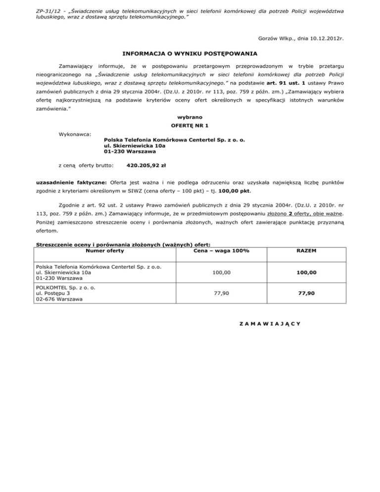 ZP-31/12 - „Świadczenie usług telekomunikacyjnych w sieci telefonii komórkowej dla potrzeb Policji województwa lubuskiego, wraz z dostawą sprzętu telekomunikacyjnego.” Gorzów Wlkp., dnia 10.12.2012r. INFORMACJA O WYNIKU POSTĘPOWANIA Zamawiający informuje, że w postępowaniu przetargowym przeprowadzonym w trybie przetargu nieograniczonego na „Świadczenie usług telekomunikacyjnych w sieci telefonii komórkowej dla potrzeb Policji województwa lubuskiego, wraz z dostawą sprzętu telekomunikacyjnego.” na podstawie art. 91 ust. 1 ustawy Prawo zamówień publicznych z dnia 29 stycznia 2004r. (Dz.U. z 2010r. nr 113, poz. 759 z późn. zm.) „Zamawiający wybiera ofertę najkorzystniejszą na podstawie kryteriów oceny ofert określonych w specyfikacji istotnych warunków zamówienia.” wybrano OFERTĘ NR 1 Wykonawca: Polska Telefonia Komórkowa Centertel Sp. z o. o. ul. Skierniewicka 10a 01-230 Warszawa z ceną oferty brutto: 420.205,92 zł uzasadnienie faktyczne: Oferta jest ważna i nie podlega odrzuceniu oraz uzyskała największą liczbę punktów zgodnie z kryteriami określonym w SIWZ (cena oferty – 100 pkt) – tj. 100,00 pkt. Zgodnie z art. 92 ust. 2 ustawy Prawo zamówień publicznych z dnia 29 stycznia 2004r. (Dz.U. z 2010r. nr 113, poz. 759 z późn. zm.) Zamawiający informuje, że w przedmiotowym postępowaniu złożono 2 oferty, obie ważne. Poniżej zamieszczono streszczenie oceny i porównania złożonych, ważnych ofert zawierające punktację przyznaną ofertom. Streszczenie oceny i porównania złożonych (ważnych) ofert: Numer oferty Cena – waga 100% Polska Telefonia Komórkowa Centertel Sp. z o.o. ul. Skierniewicka 10a 01-230 Warszawa POLKOMTEL Sp. z o. o. ul. Postępu 3 02-676 Warszawa RAZEM 100,00 100,00 77,90 77,90 ZAMAWIAJĄCY