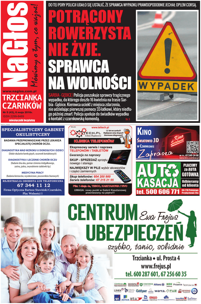 POTRĄCONY ROWERZYSTA NIE ŻYJE. SPRAWCA NA WOLNOŚCI Mówimy o tym, co ważne! NaGłos DO TEJ PORY POLICJI UDAŁO SIĘ USTALIĆ, ŻE SPRAWCA WYPADKU PRAWDOPODOBNIE JECHAŁ OPLEM CORSĄ. TRZCIANKA www.naglos.com.pl CZARNKÓW Nr 5 (43), 6 maja 2016r. ISSN 2299-8489 miesięcznik bezpłatny SARBIA – GĘBICE | Policja poszukuje sprawcy tragicznego wypadku, do którego doszło 16 kwietnia na trasie Sarbia – Gębice. Kierowca uciekł z miejsca zdarzenia, nie udzielając pierwszej pomocy 33-latkowi, który niedługo później zmarł. Policja apeluje do świadków wypadku Str. 3 o kontakt z czarnkowską komendą. REKLAMA 15 BADANIA PRZEPROWADZANE PRZEZ LEKARZA SPECJALISTĘ CHORÓB OCZU. DIAGNOSTYKA WAD WZROKU U DOROSŁYCH I DZIECI (Dobór okularów korekcyjnych, soczewek kontaktowych) DIAGNOSTYKA I LECZENIE CHORÓB OCZU (Badanie dna oka, pomiar ciśnienia śródgałkowego, zaćma, jaskra, zwyrodnienie siatkówki itp.) MEDYCYNA PRACY (Badania kierowców, wysokościowe, pracowników biurowych) Firma Optyczna Bartosz Stawiński Czarnków, Plac Wolności 1 KINO ŚWIA WIATOWID WI ATTOOOW AT WID 3D W CZARNKOWIE ZARNK Zaprasza NR TEL. 67/349-34-80 www.kino.czarnkow.pl p 2 Czarnków Trzcianka NaGłos Czarnków Trzcianka NaGłos 6 maja 2016 www.naglos.com.pl Z Muzeum prosi o zdjęcia starej Trzcianki HISTORIA Jak wyglądała stara Trzcianka? Muzeum Ziemi Nadnoteckiej prosi o przynoszenie zdjęć, także tych bardziej „świeżych”, czyli robionych po drugiej wojnie światowej, a nawet w latach osiemdziesiątych. Przydać może się każde zdjęcie, także to wyciągnięte z prywatnych archiwów. Chodzi o to, żeby pokazać, jak żyli ludzie, jak się ubierali, jak wyglądały ulice; zakłady pracy. Muzeum chce przygotować wystawę, ale nie określa na razie jej terminu. To zależy od tego, ile zdjęć z życia miasta oraz gminy uda się zdobyć. Zdjęcia przynosić można codziennie – od poREKLAMA NaGłos już w trzech powiatach agazyn NaGłos ukazuje się od grudnia 2012 roku i jest pierwszym bezpłatnym miesięcznikiem w powiecie czarnkowsko- trzcianeckim. Gazeta, jako dwutygodnik, wydawana jest także w Pile, a od czerwca 2015 roku, jako bezpłatny miesięcznik, ukazuje się również w powiecie złotowskim. Całą gazetę przeczytać można także w formie e-wydania na naszym portalu www.naglos.com.pl. niedziałku do soboty. Wszystkie, po zeskanowaniu, zostaną zwrócone. Jeśli ktoś posiada już zdjęcia w postaci cyfrowej, może wysłać je pocztą elektroniczną. – Państwa prywatne zbiory pozwolą na pełniejsze i ciekawsze przygotowanie ekspozycji. Poza tym, kiedyś materiał ten będzie źródłem wiedzy dla przyszłych pokoleń – jak wyglądała Trzcianka i jej mieszkańcy – mówi Elżbieta Wiśnicka, dyrektor muzeum. Dodatkowe informacje uzyskać można pod numerem telefonem 67 216–24-46 lub bezpośrednio w muzeum. Kolejne wydania NaGłosu Piła 13.05 Złotów 20.05 Czarnków -Trzcianka 06.06 WIELKA PROMOCJA URODZINOWA rabaty do 40000 tys zł. Żnin, ul. Dworcowa 29, tel. 606 407 352 Oddział Wałcz, ul. Bydgoska 74, tel. 607 528 379 [email protected], www.inter-vax.pl Czarnków Trzcianka NaGłos REDAKCJA ul. Sikorskiego 33 (pok.304), 64-920 Piła. Tel. 67 352 17 50 Redaktor naczelny: Gabriela Ciżmowska ([email protected]) Michał Nicpoń ([email protected]) Kontakt: [email protected] www.NaGlos.com.pl REKLAMA I MARKETING ul. Sikorskiego 33 (pok.304), 64-920 Piła Elżbieta Możejko tel. 691 418 537 ([email protected]) Agnieszka Norkowska tel. 600 023 144 ([email protected]) CIĄGNIKI MASZYNY ROLNICZE CZĘŚCI SPRZEDAŻ SERWIS FINANSOWANIE Kontakt: tel./fax (67) 352 17 50, e-mail: [email protected]; www.NaGlos.com.pl/reklama DRUK Agencja Promocyjno - Wydawnicza MEDIA FORTE s.c. Gabriela Ciżmowska, Elżbieta Możejko, Michał Nicpoń, Agnieszka Norkowska, ul. Warsztatowa 8, 64-920 Piła. Kontakt: tel./fax (67) 352 17 50, www.NaGlos.com.pl/wydawnictwo Redakcja nie odpowiada za treść zamieszczonych ogłoszeń. Redakcja nie zwraca tekstów niezamówionych oraz zastrzega sobie prawo ich redagowania i skracania. Rozpowszechnianie materiałów redakcyjnych bez zgody wydawcy jest zabronione. WYDAWCA AGORA S.A., ul. Krzywa 35, 64-920 Piła www.naglos.com.pl Czarnków Trzcianka NaGłos 6 maja 2016 Czarnków Trzcianka NaGłos N 3 FOT. OSP LUBASZ Sprawca śmiertelnego wypadku nadal na wolności. Policja szuka świadków w sławnie Spłonęło 30 hektarów trzciny POŻARY | Aż dwukrotnie w ciągu zaledwie czterech dni płonęły uprawy trzciny energetycznej w Sławnie (gm. Lubasz). W sumie spłonęło aż 30 hektarów trzciny. ierwszy z pożarów wybuchł 25 kwietnia. Do zdarzenia zadysponowano dwa zastępy z JRG Czarnków, dwa zastępy z OSP KSRG Lubasz, jeden zastęp z OSP Sokołowo oraz jeden zastęp z OSP Młynkowo. Działania gaśnicze utrudREKLAMA niało ukształtowanie terenu oraz porywy wiatru, które wzmagały pożar. W wyniku pożaru uległo spaleniu około 20 ha trzciny energetycznej. W akcji trwającej ponad 3 godziny udział brało 7 zastępów straży pożarnej (29 strażaków). Kolejne wezwanie do po- żaru w Sławnie strażacy odebrali 29 kwietnia. Choć zgłoszenie dotyczyło pożaru traw, to gdy stra ża cy do tar li na miejsce, okazało się, że pali się uprawa trzciny energetycznej. W wyniku pożaru ule gło spa le niu po nad 10 ha trzciny energetycznej. APEL Czarnkowska policja nadal poszukuje sprawcy śmiertelnego wypadku, do którego doszło na trasie Sarbia – Gębice. Zdarzenie miało miejsce 16 kwietnia około północy. Na prostym odcinku drogi kierowca samochodu osobowego potrącił rowerzystę. 33-letni mężczyzna na skutek potrącenia doznał poważnych obrażeń ciała. Kierowca samochodu uciekł z miejsca zdarzenia, nie udzielając rannemu pierwszej pomocy. Potrącony mężczyzna został przewieziony do szpitala w Pile. Jednak tam nie udało się uratować jego życia – ranny zmarł. Od dnia wypadku policja poszukuje kierowcy, który potrącił