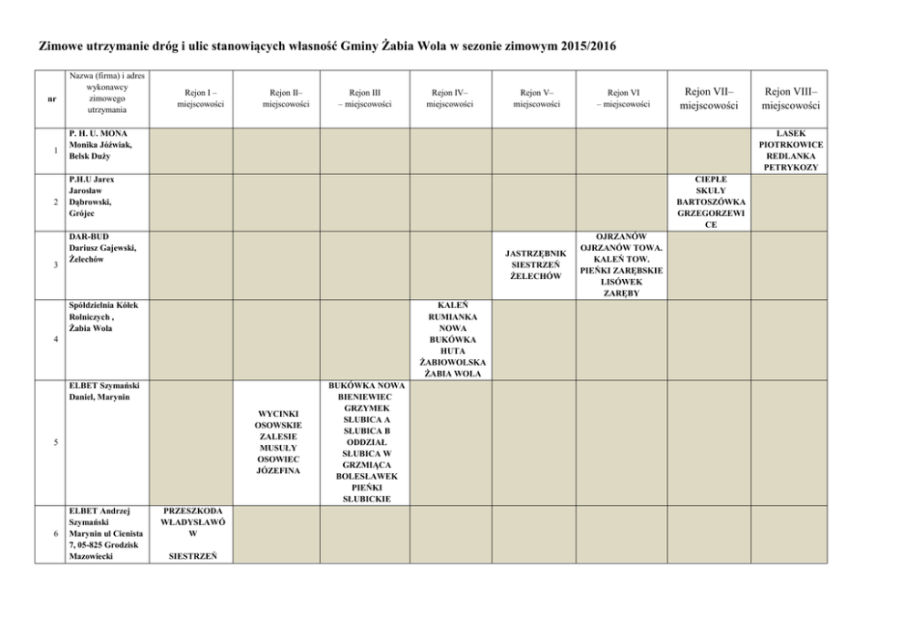 Zimowe utrzymanie dróg i ulic stanowiących własność Gminy Żabia Wola w sezonie zimowym 2015/2016 nr 1 2 3 Nazwa (firma) i adres wykonawcy zimowego utrzymania Rejon I – miejscowości Rejon II– miejscowości Rejon III – miejscowości Rejon V– miejscowości Rejon VI – miejscowości Rejon VII– miejscowości P. H. U. MONA Monika Jóźwiak, Belsk Duży CIEPŁE SKUŁY BARTOSZÓWKA GRZEGORZEWI CE P.H.U Jarex Jarosław Dąbrowski, Grójec DAR-BUD Dariusz Gajewski, Żelechów JASTRZĘBNIK SIESTRZEŃ ŻELECHÓW KALEŃ RUMIANKA NOWA BUKÓWKA HUTA ŻABIOWOLSKA ŻABIA WOLA 4 ELBET Szymański Daniel, Marynin WYCINKI OSOWSKIE ZALESIE MUSUŁY OSOWIEC JÓZEFINA 5 ELBET Andrzej Szymański Marynin ul Cienista 7, 05-825 Grodzisk Mazowiecki Rejon VIII– miejscowości LASEK PIOTRKOWICE REDLANKA PETRYKOZY Spółdzielnia Kółek Rolniczych , Żabia Wola 6 Rejon IV– miejscowości PRZESZKODA WŁADYSŁAWÓ W SIESTRZEŃ BUKÓWKA NOWA BIENIEWIEC GRZYMEK SŁUBICA A SŁUBICA B ODDZIAŁ SŁUBICA W GRZMIĄCA BOLESŁAWEK PIEŃKI SŁUBICKIE OJRZANÓW OJRZANÓW TOWA. KALEŃ TOW. PIEŃKI ZARĘBSKIE LISÓWEK ZARĘBY